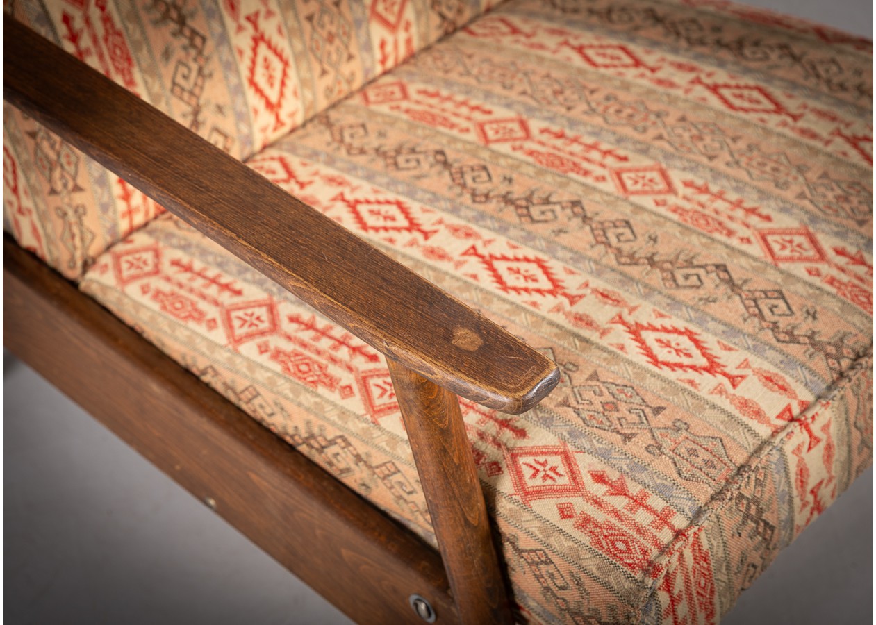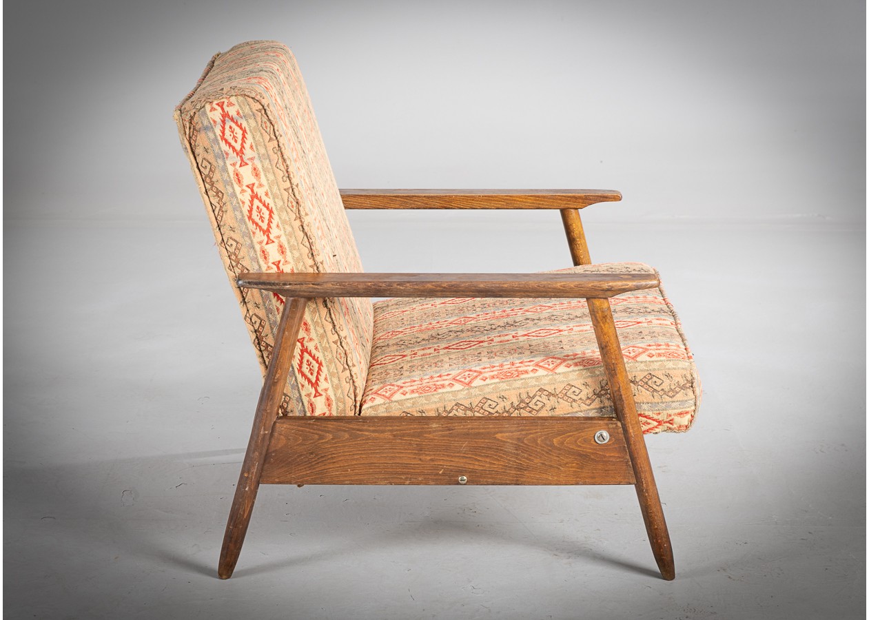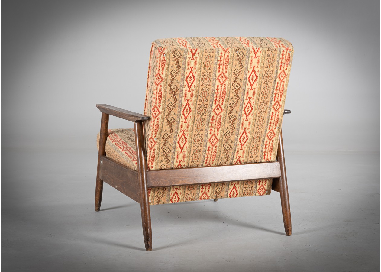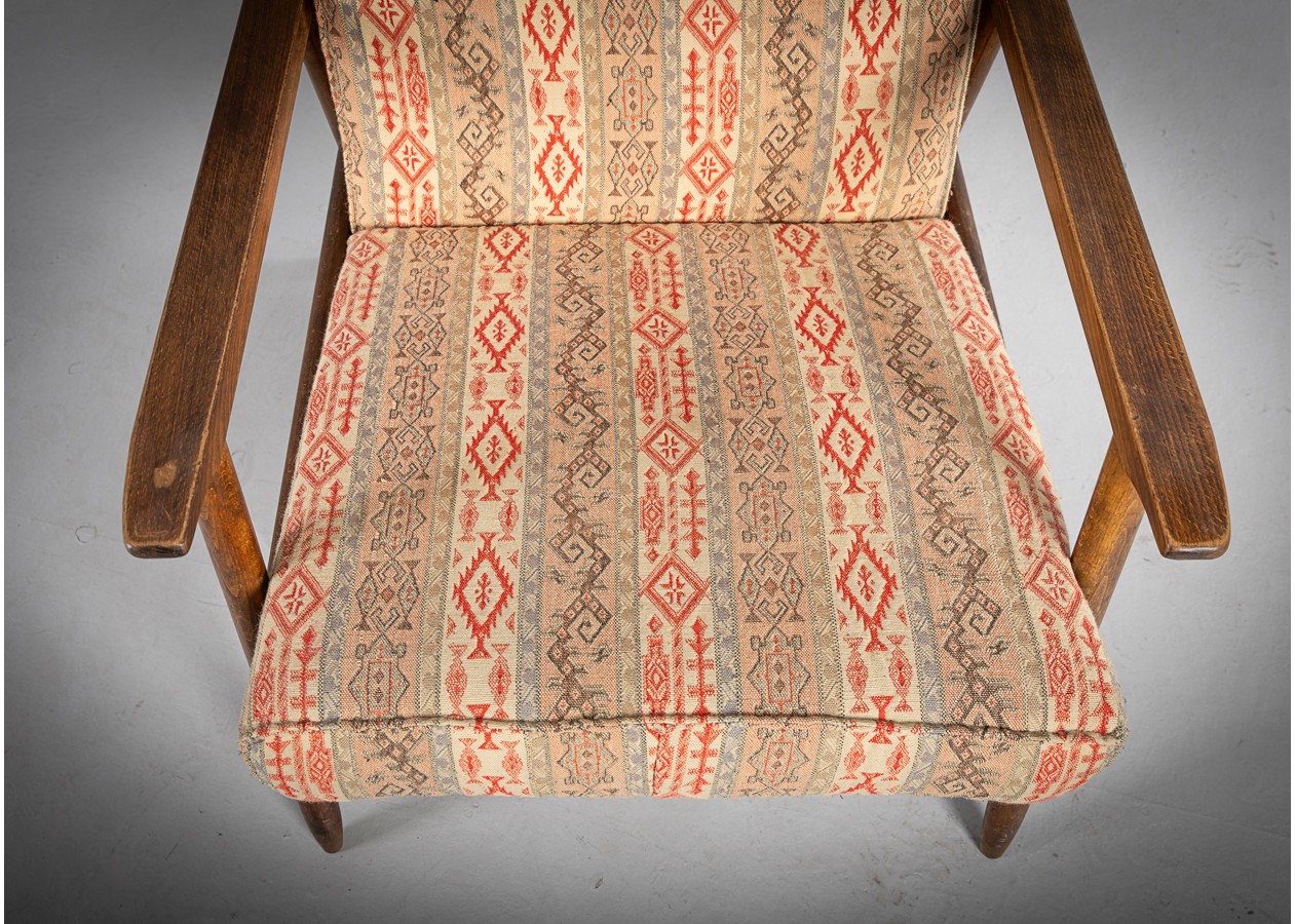 Charakteringas krėslas, kuriame dera jaukumas ir savitas stilius. Natūralaus medžio rėmas, tiesios linijos ir šiltų raštų audinys sukuria lengvą retro nuotaiką. Tai baldas, kuris kviečia atsisėsti, atsipalaiduoti ir pabūti – puikiai tiks skaitymo kampeliui, svetainei ar darbo erdvei, kur norisi patogumo be pompastikos.