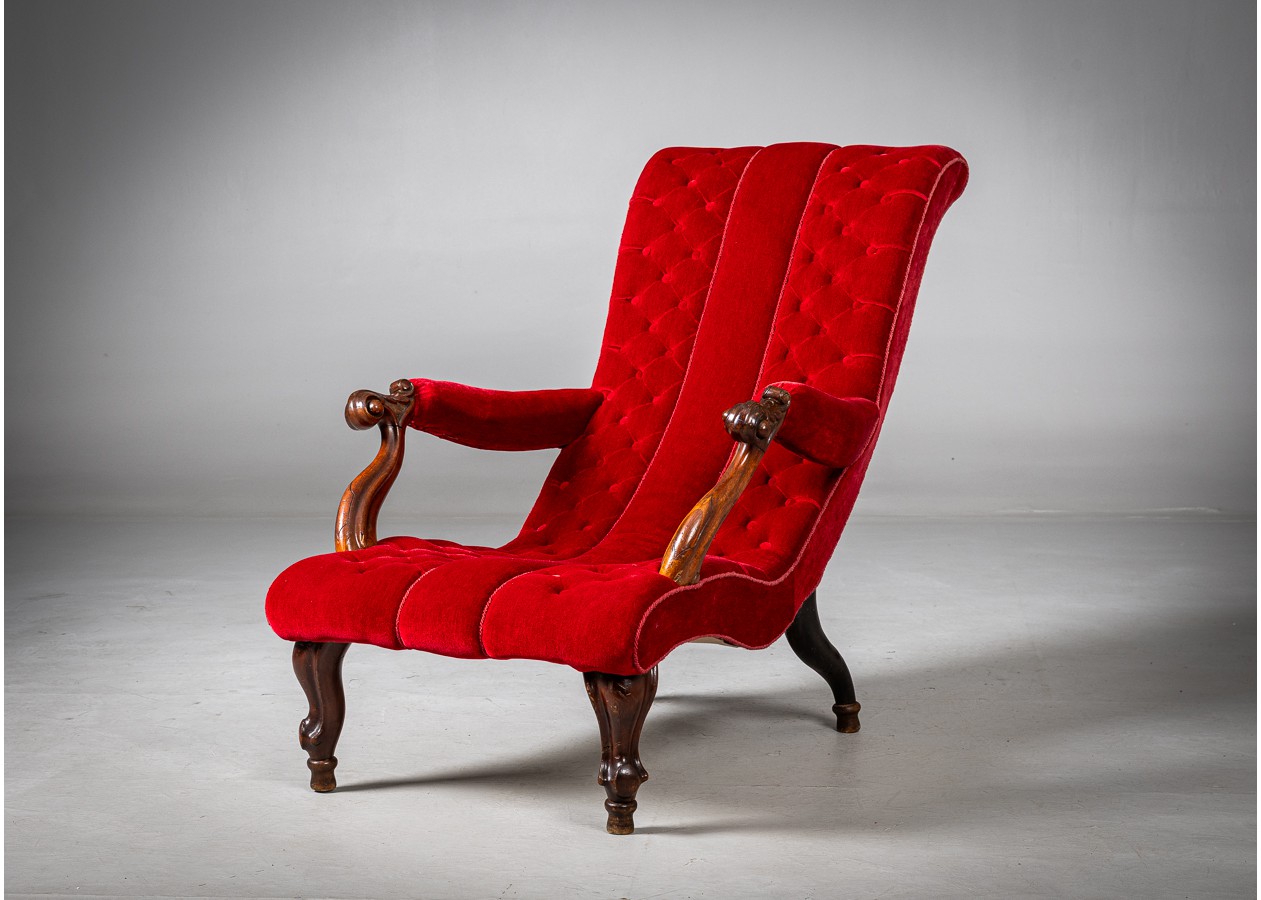 Rafinuoto silueto poilsinis krėslas, pasižymintis aukštu ergonomišku atlošu ir dekoratyviniu sagavimu. Švelniai išlenkti porankiai ir subtilios medžio detalės sukuria harmoningą klasikinės estetikos įspūdį. Aksominis audinys pabrėžia baldo komfortą, o elegantiškos proporcijos leidžia jam lengvai įsilieti tiek į tradicinį, tiek į eklektišką interjerą.