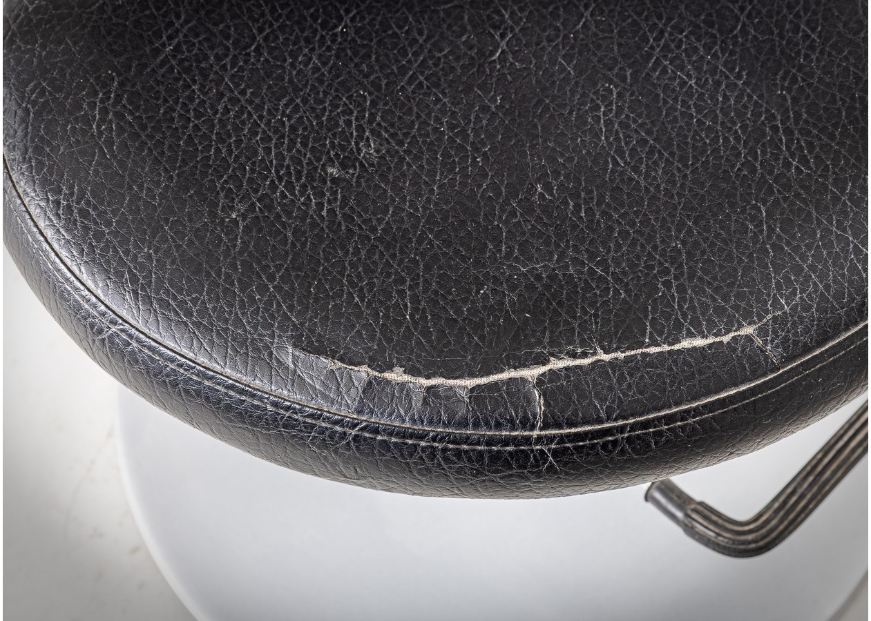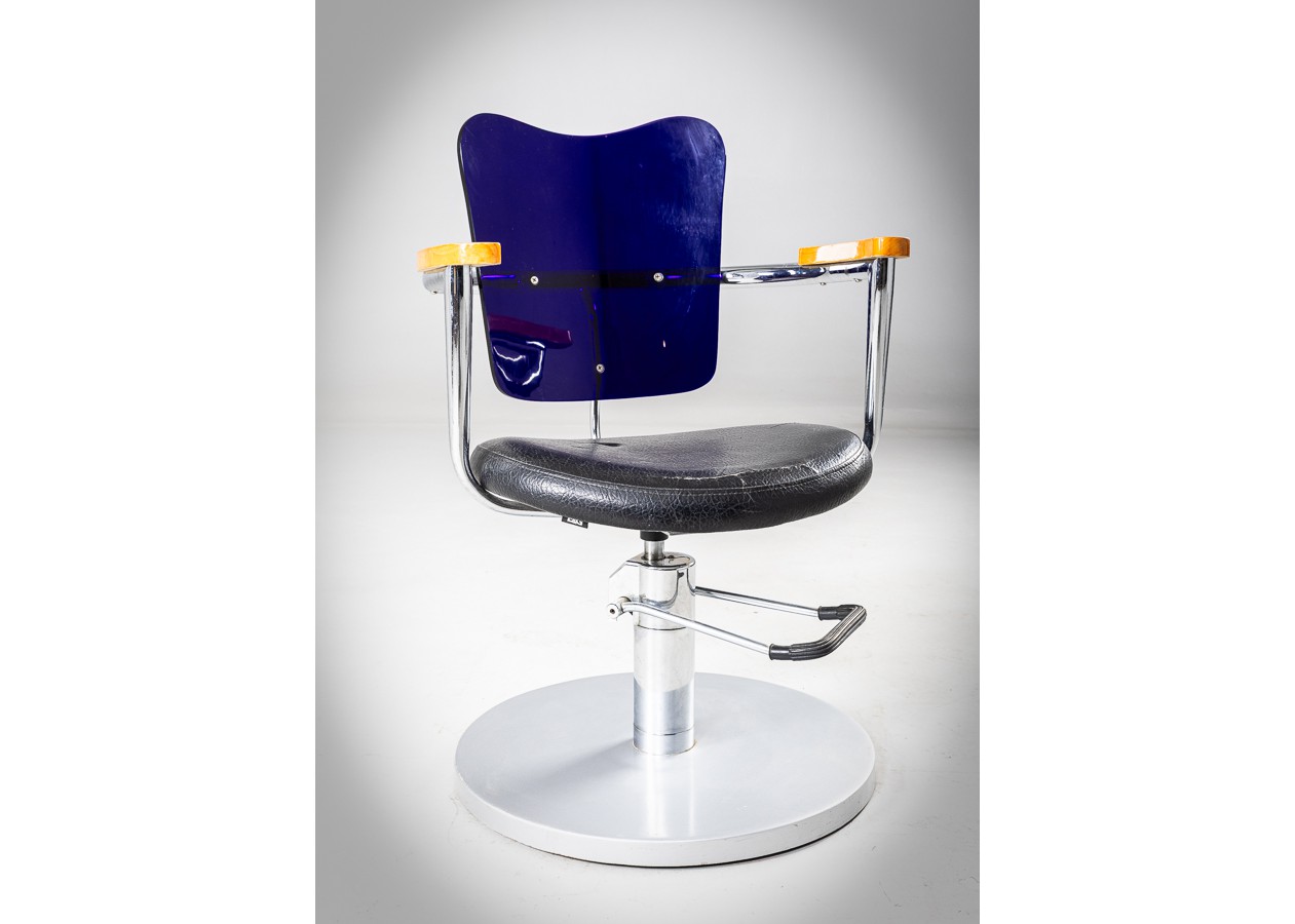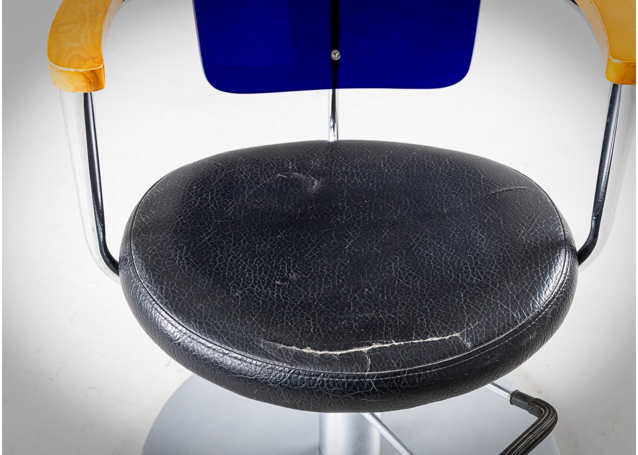 Stilinga XX a. modernizmo laikotarpio kėdė su reguliuojamo aukščio mechanizmu, išsiskirianti funkcionaliu ir išraiškingu dizainu. Chromuoto metalo konstrukcija derinama su mėlyno plastiko atlošu ir patogia minkšta sėdyne.