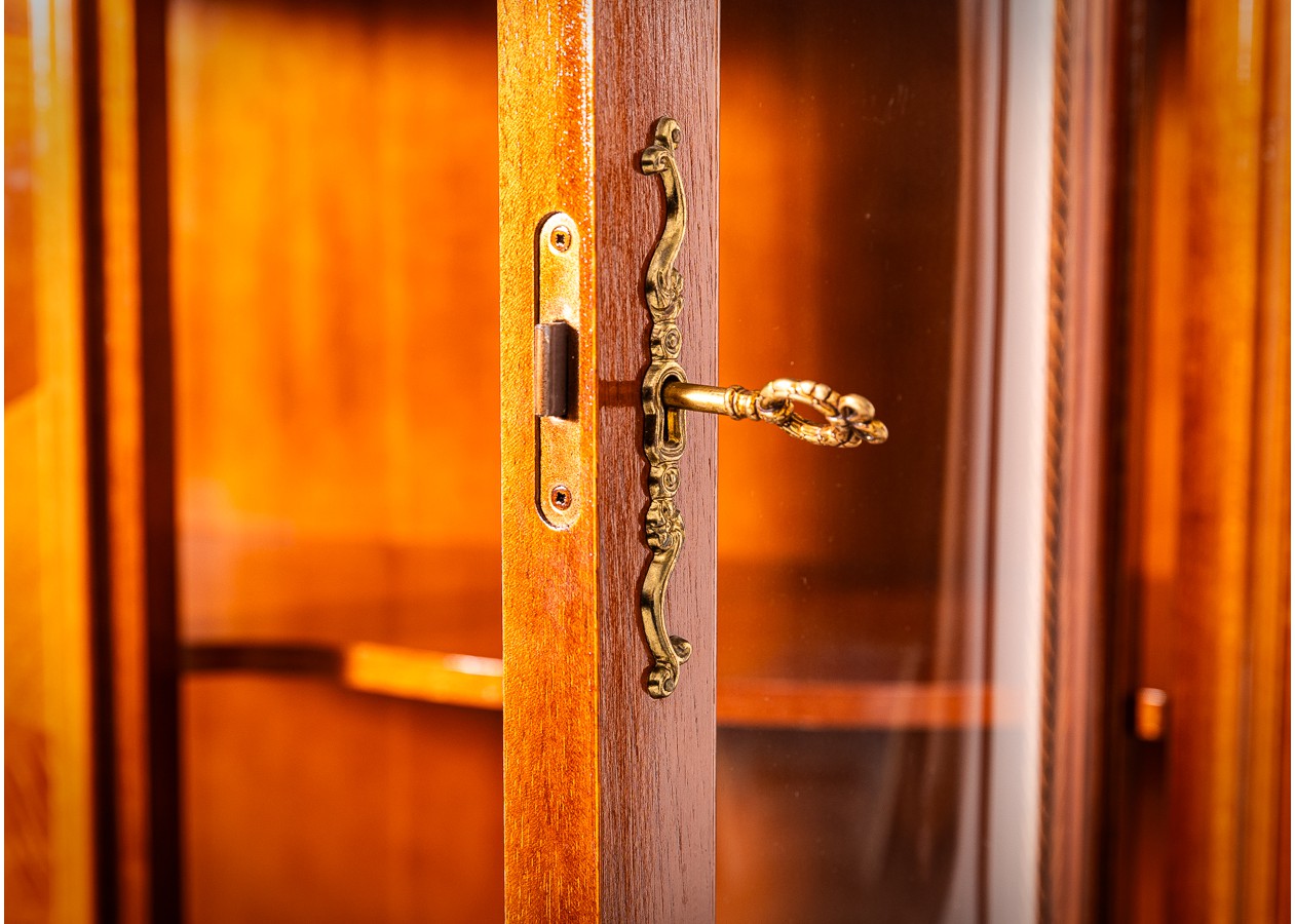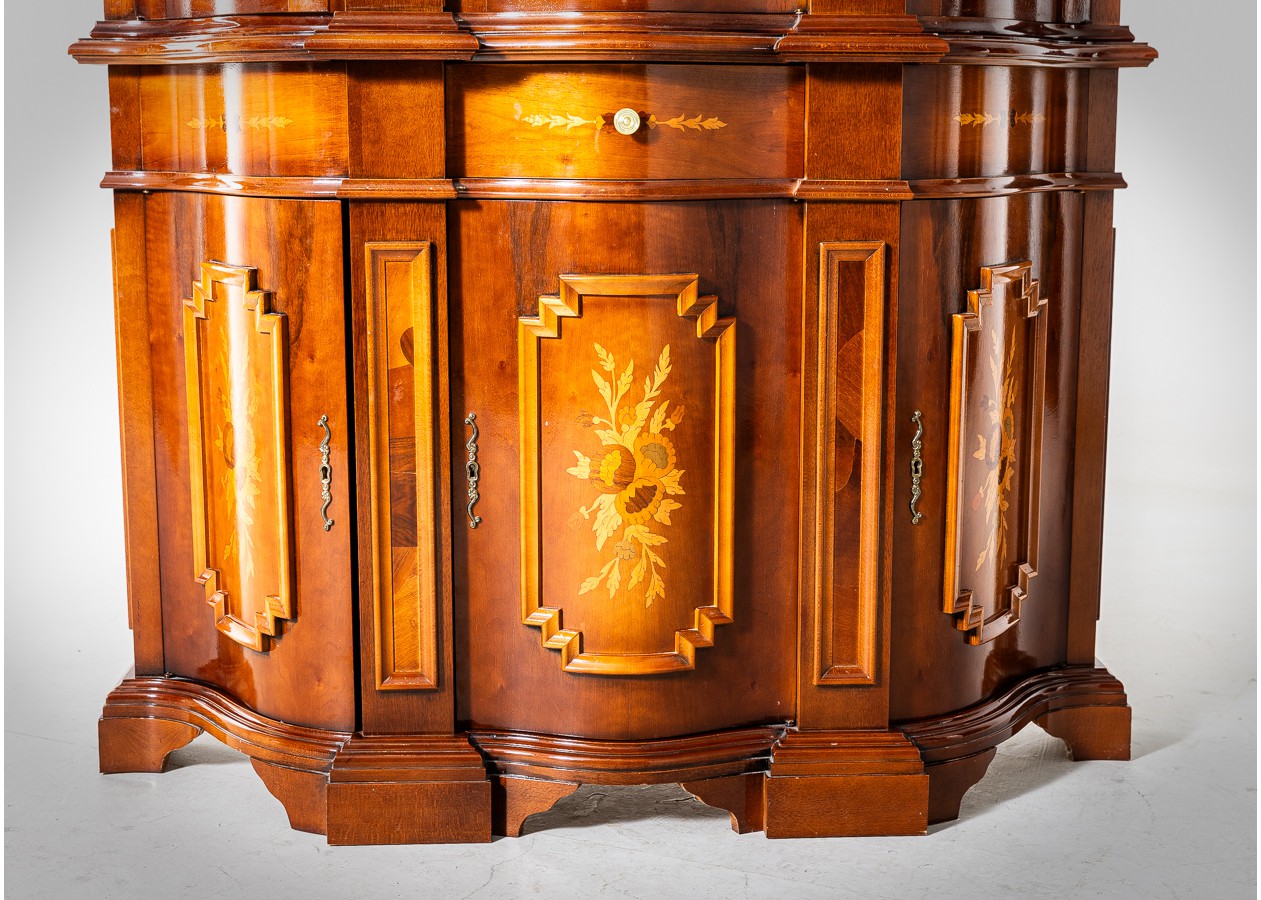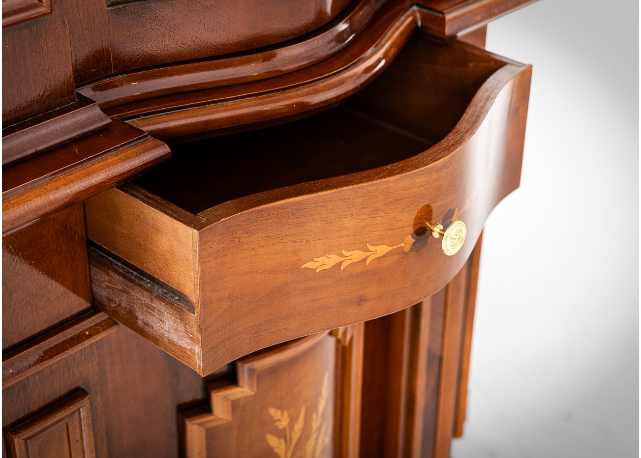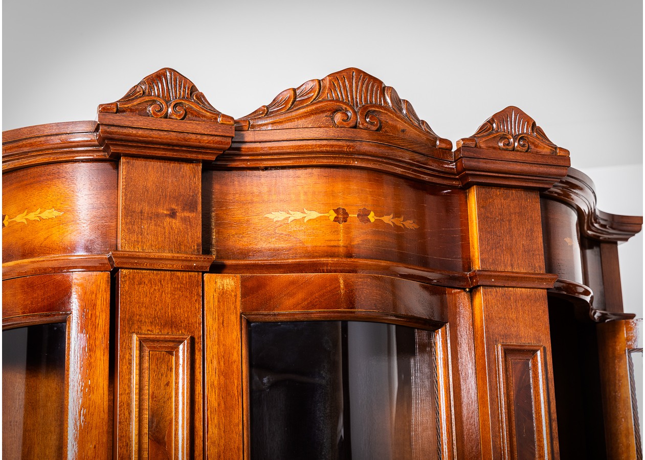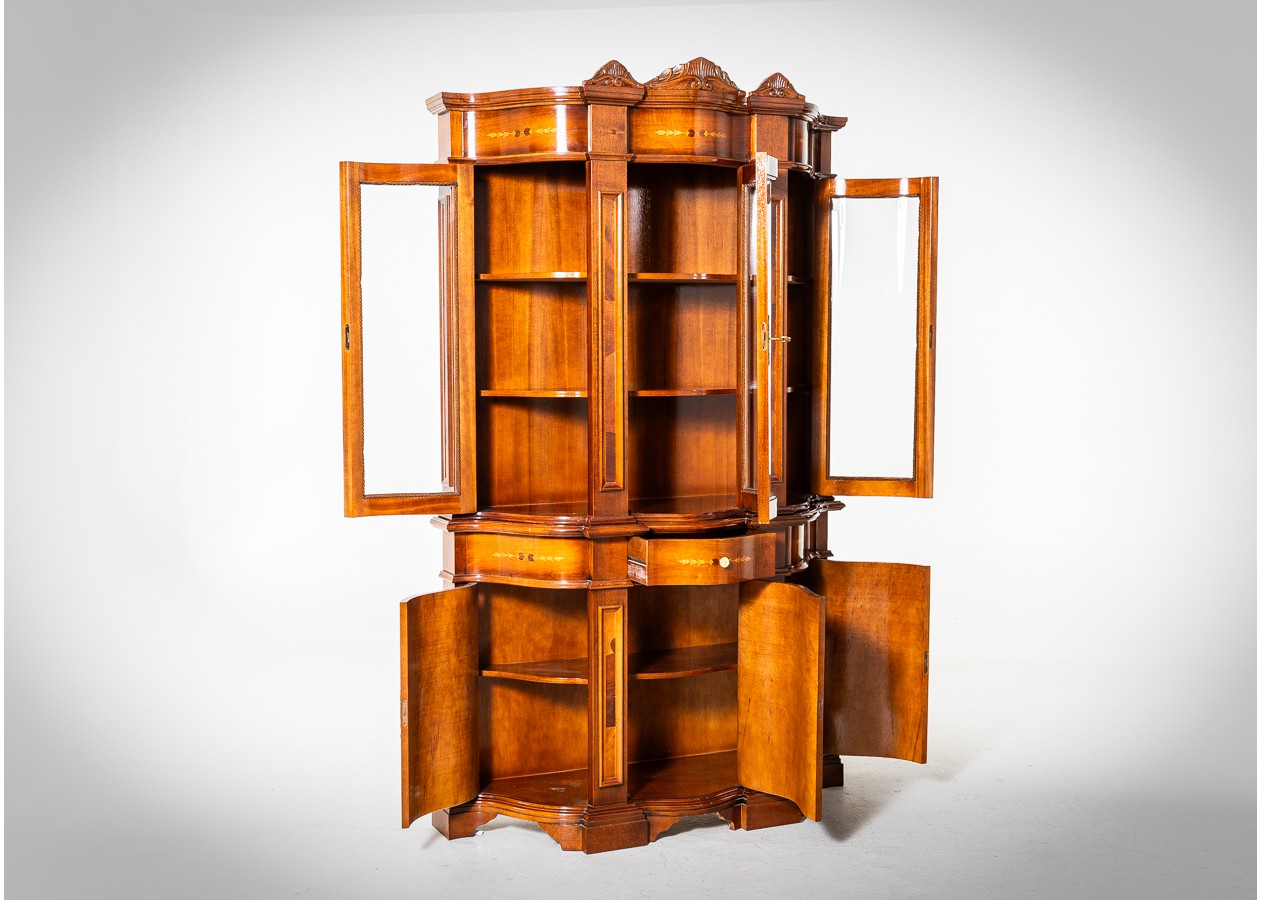Išraiškingo silueto vitrina–indauja, kurioje dera lenktas fasadas, subtilios drožybos detalės ir dekoratyvinės intarsijos. Šis baldas ne tik praktiškas, bet ir vizualiai turtingas – stiklinė viršutinė dalis leidžia eksponuoti kolekcijas, o apatinė spintelių zona išlaiko funkcionalumą. Puikiai tinka klasikiniame ar eklektiškame interjere kaip solidus ir dekoratyvus akcentas.