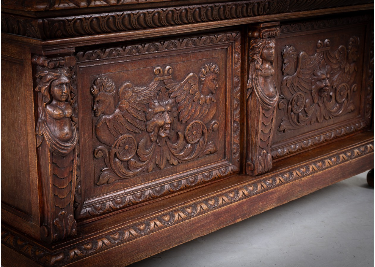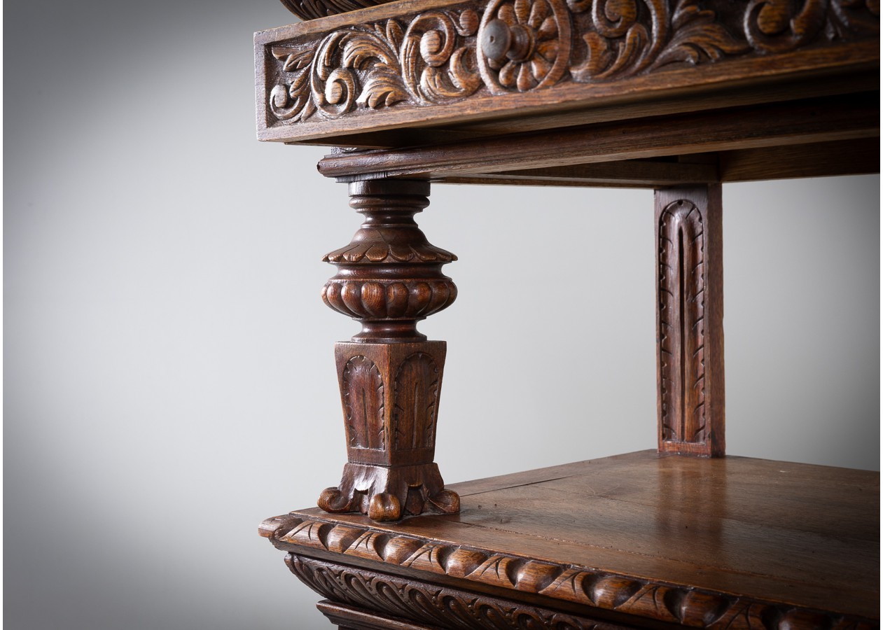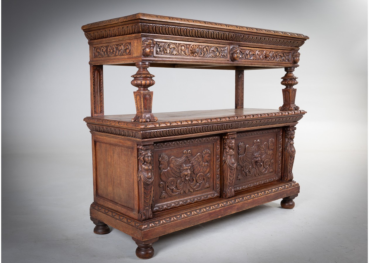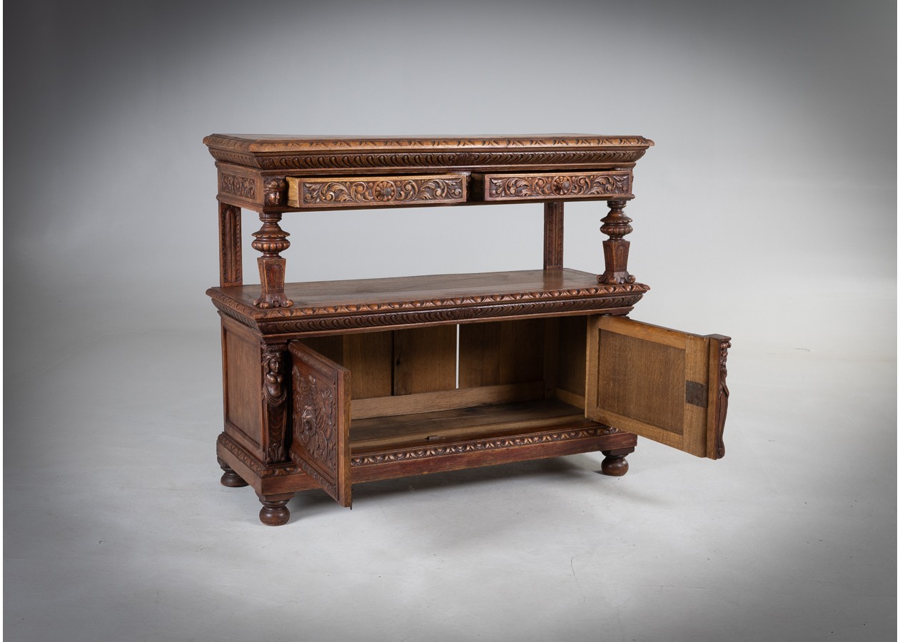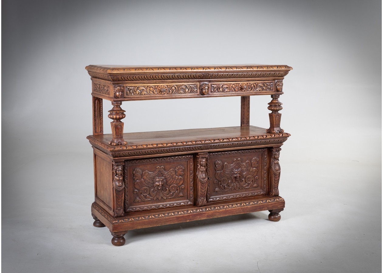Išskirtinė klasikinio stiliaus komoda–desertinė, dvelkianti senovine prabanga. Raižyto medžio detalės, masyvi konstrukcija ir dvi funkcinės pakopos suteikia baldui solidumo bei praktinės vertės. Puikus pasirinkimas ieškantiems unikalaus akcento, kuris interjere pasakotų istoriją.