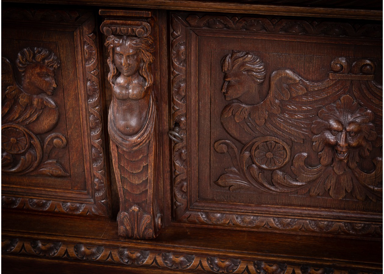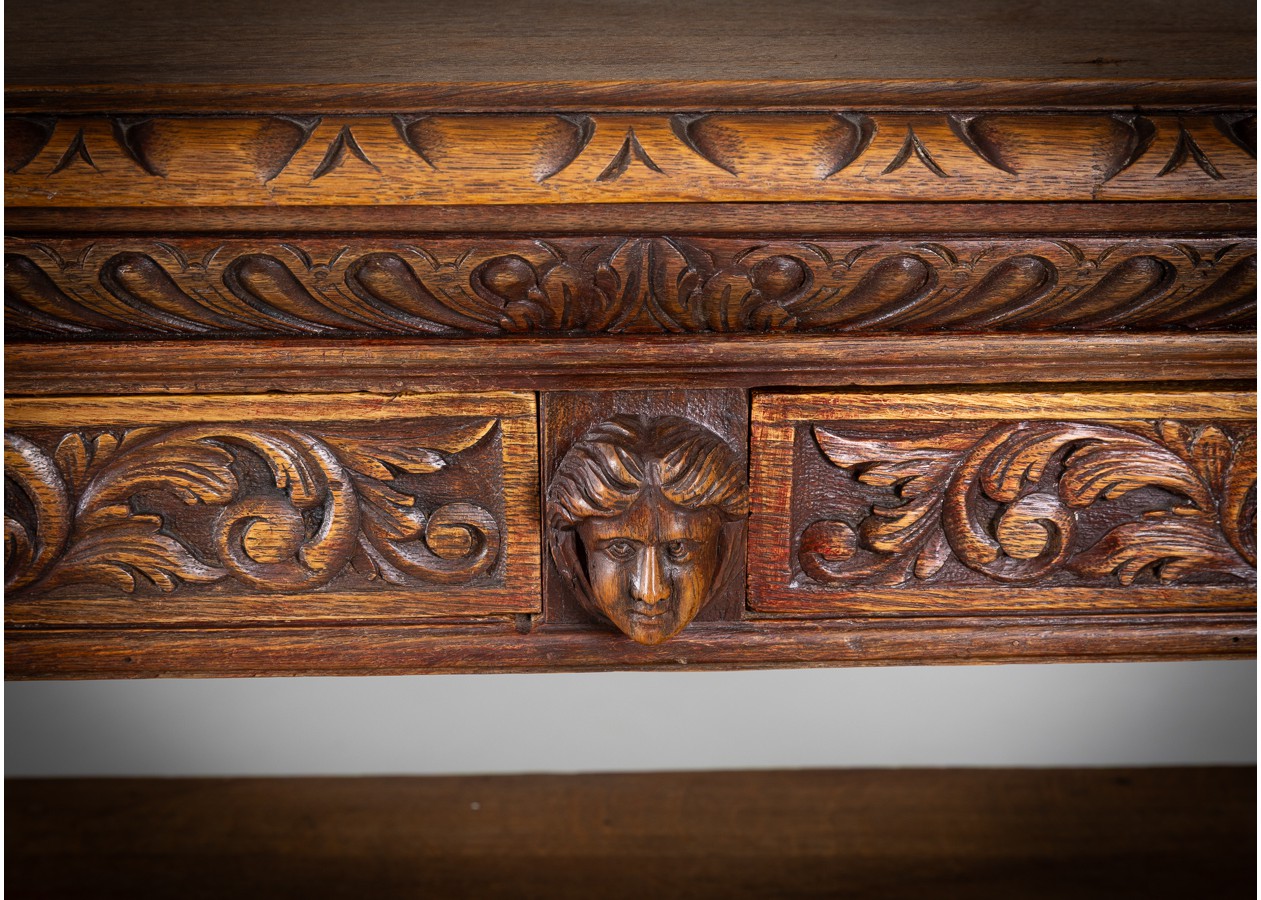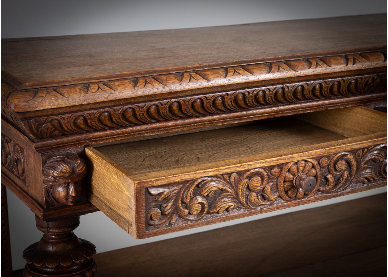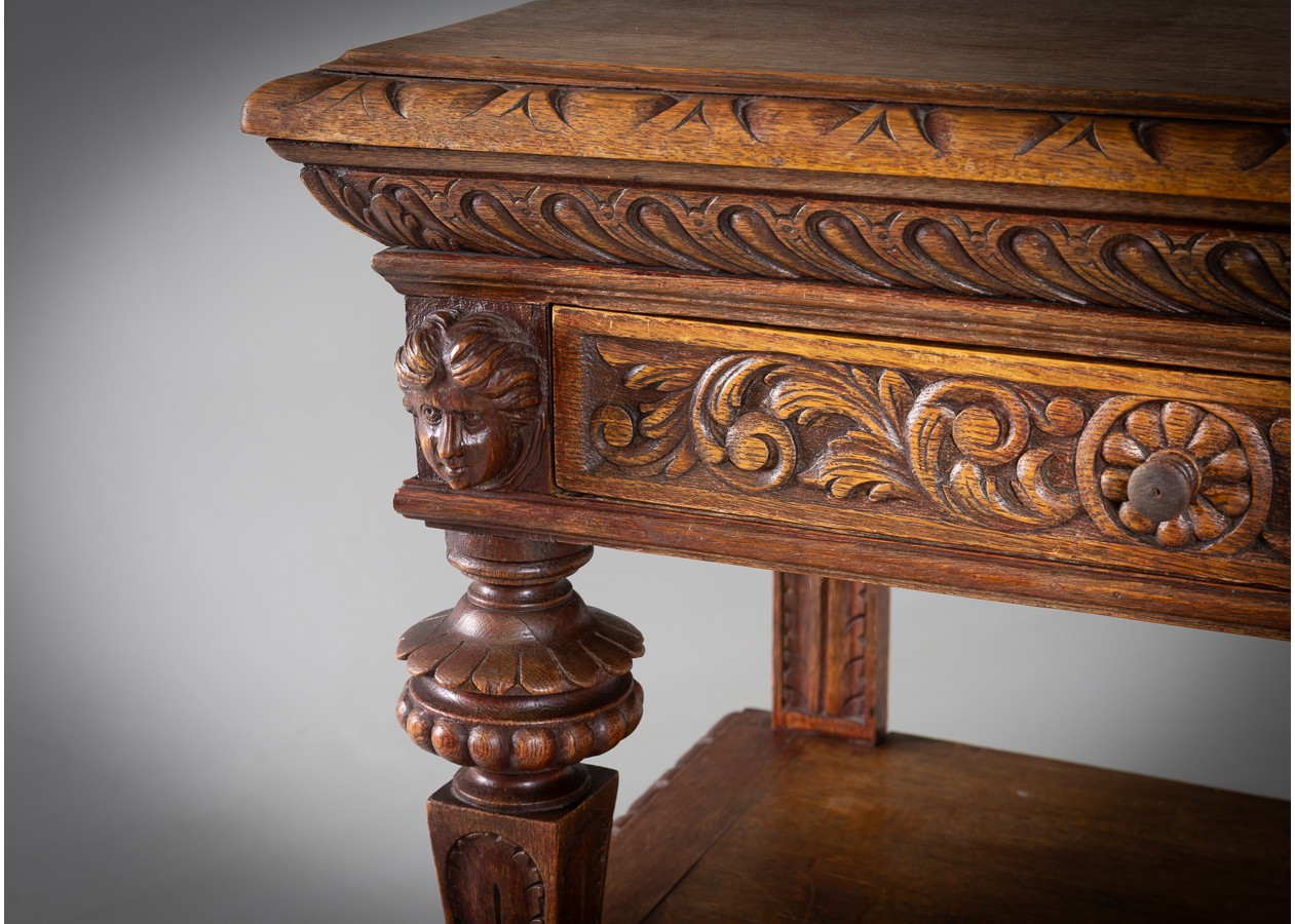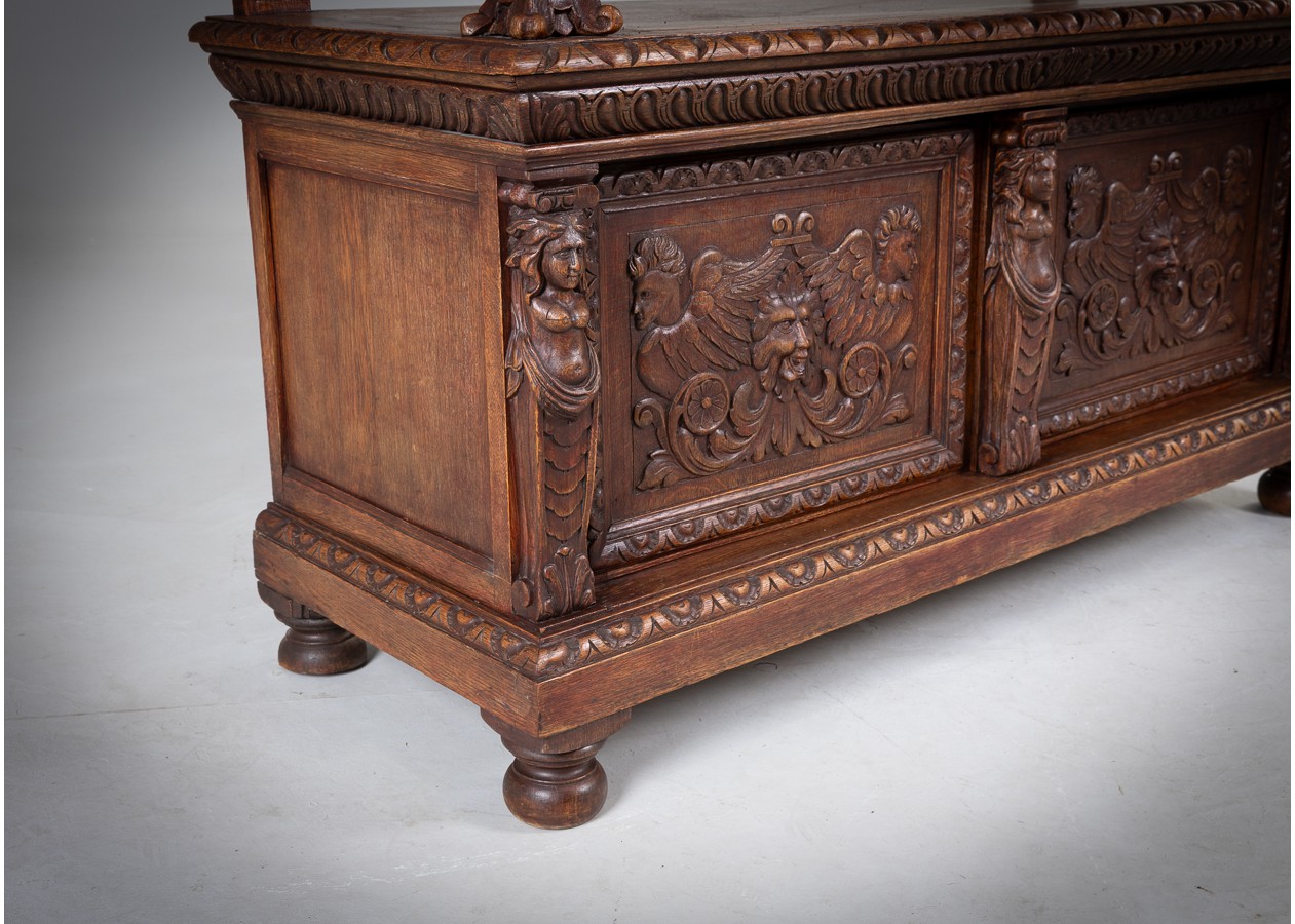 Išskirtinė klasikinio stiliaus komoda–desertinė, dvelkianti senovine prabanga. Raižyto medžio detalės, masyvi konstrukcija ir dvi funkcinės pakopos suteikia baldui solidumo bei praktinės vertės. Puikus pasirinkimas ieškantiems unikalaus akcento, kuris interjere pasakotų istoriją.