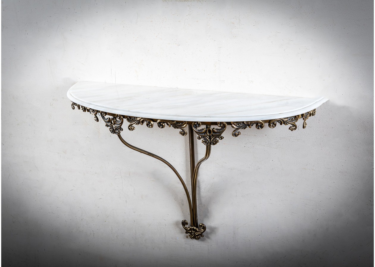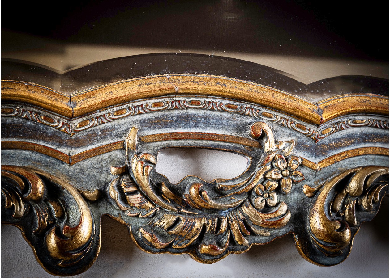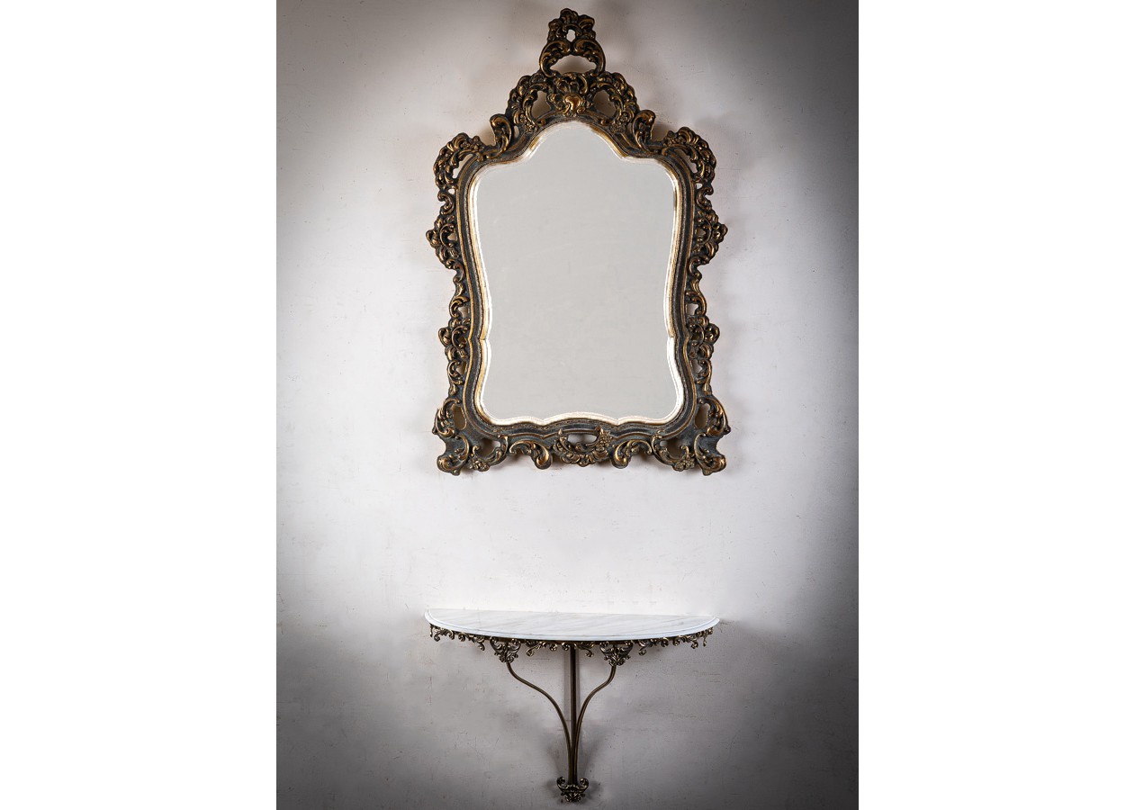 Išskirtinė sieninė konsolė su puošniu veidrodžiu – elegancijos ir prabangos derinys. Įmantrūs rėmo ornamentai ir subtiliai išlenktos formos kuria romantišką, aristokratišką nuotaiką. Puikiai tiks prieškambaryje, svetainėje ar miegamajame, suteikdama erdvei šviesos, rafinuotumo ir išskirtinio charakterio.