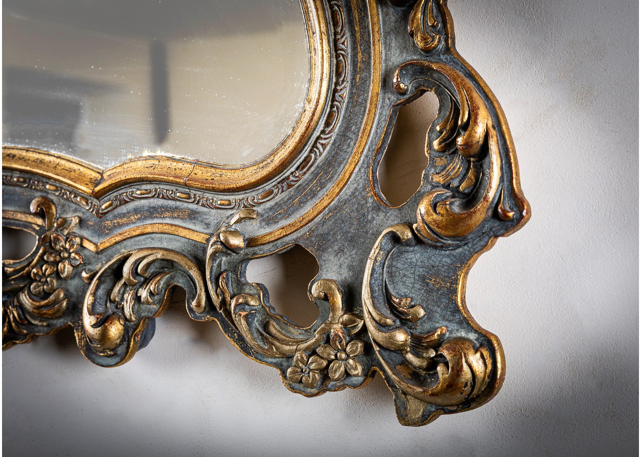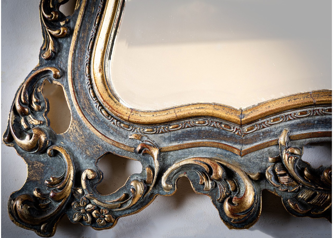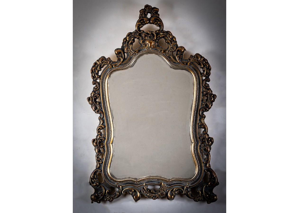 Išskirtinė sieninė konsolė su puošniu veidrodžiu – elegancijos ir prabangos derinys. Įmantrūs rėmo ornamentai ir subtiliai išlenktos formos kuria romantišką, aristokratišką nuotaiką. Puikiai tiks prieškambaryje, svetainėje ar miegamajame, suteikdama erdvei šviesos, rafinuotumo ir išskirtinio charakterio.