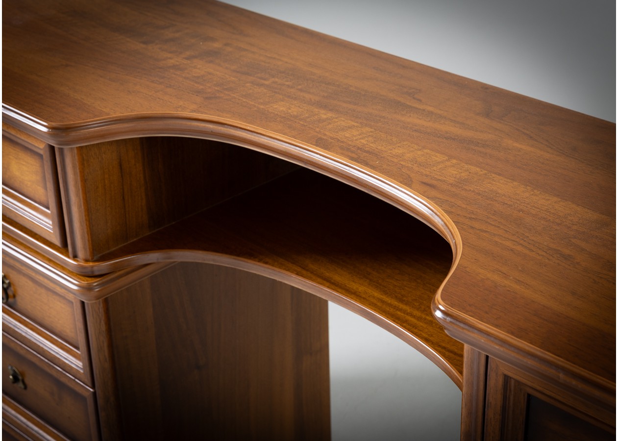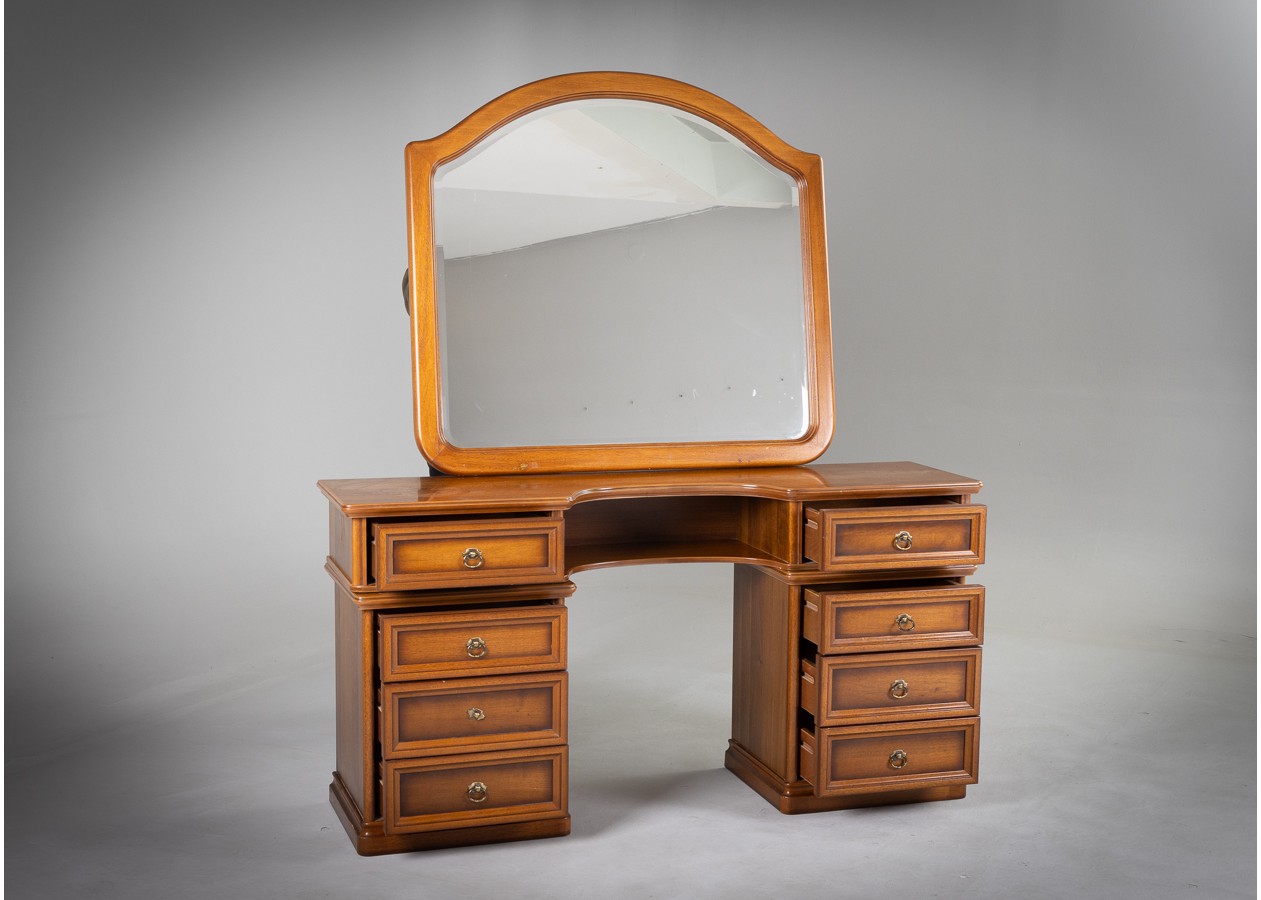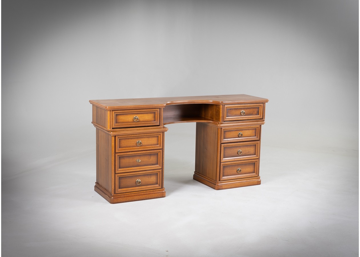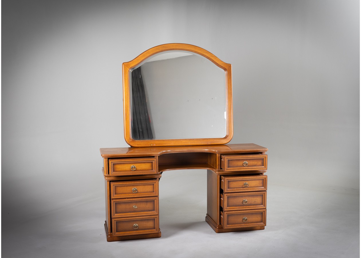 Klasikinis kosmetinis staliukas su elegantišku veidrodžiu, dvelkiantis rafinuota ramybe. Šiltas medžio tonas, simetriški stalčiai ir grakščios formos kuria jaukią, tvarkingą erdvę kasdieniams grožio ritualams. Baldą, kuriame dera funkcija ir nesenstanti estetika.