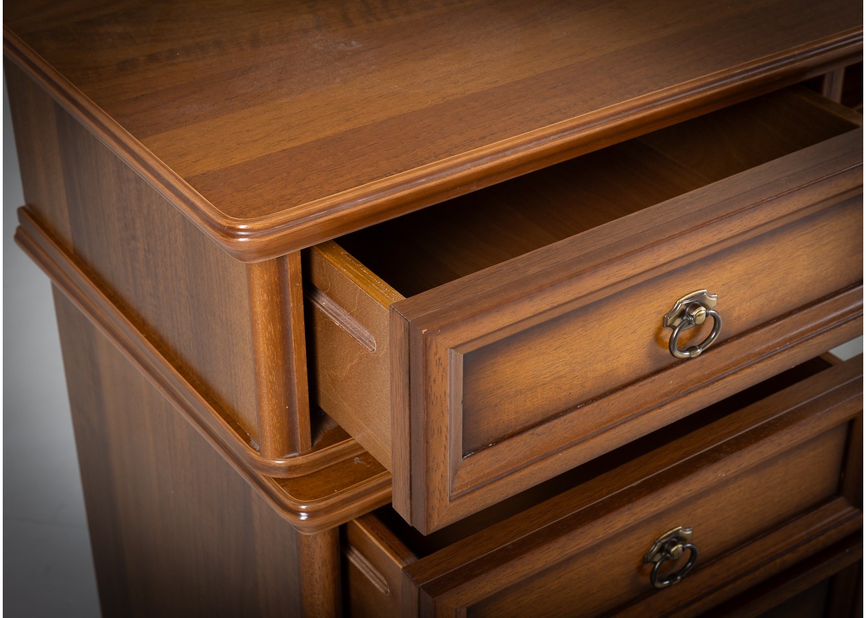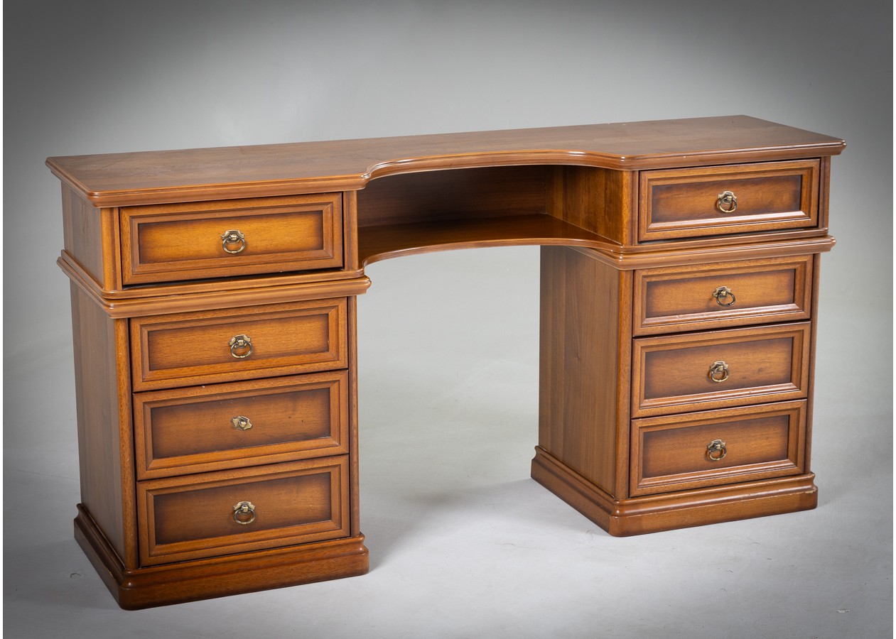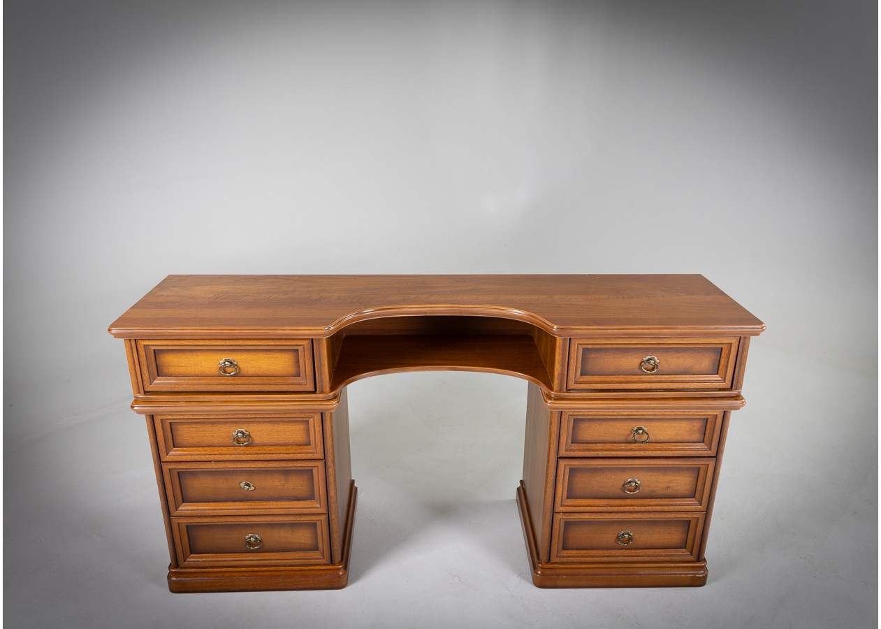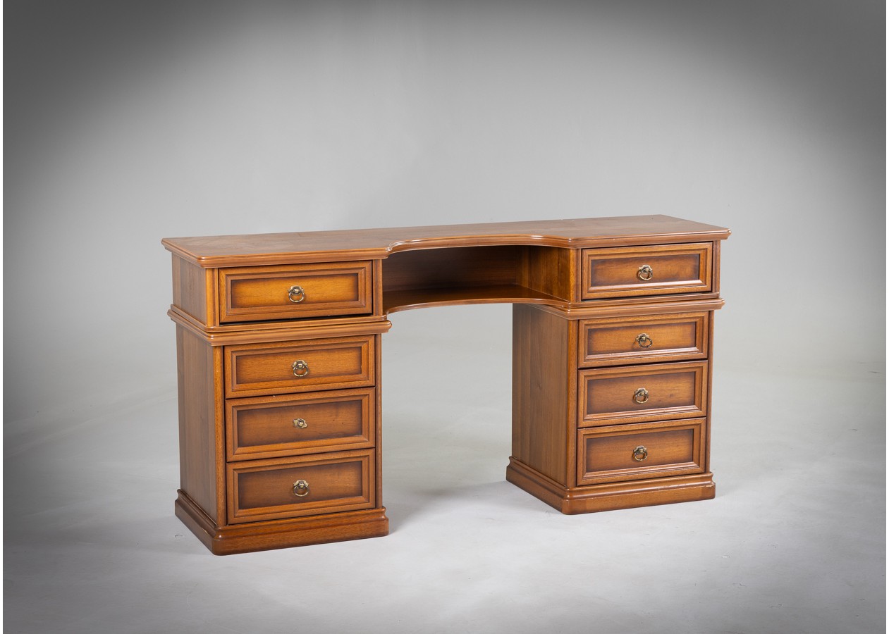 Klasikinis kosmetinis staliukas su elegantišku veidrodžiu, dvelkiantis rafinuota ramybe. Šiltas medžio tonas, simetriški stalčiai ir grakščios formos kuria jaukią, tvarkingą erdvę kasdieniams grožio ritualams. Baldą, kuriame dera funkcija ir nesenstanti estetika.
