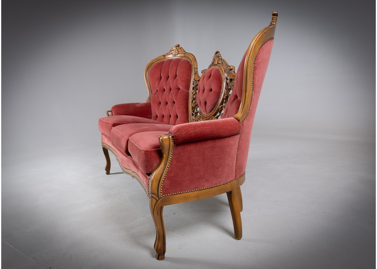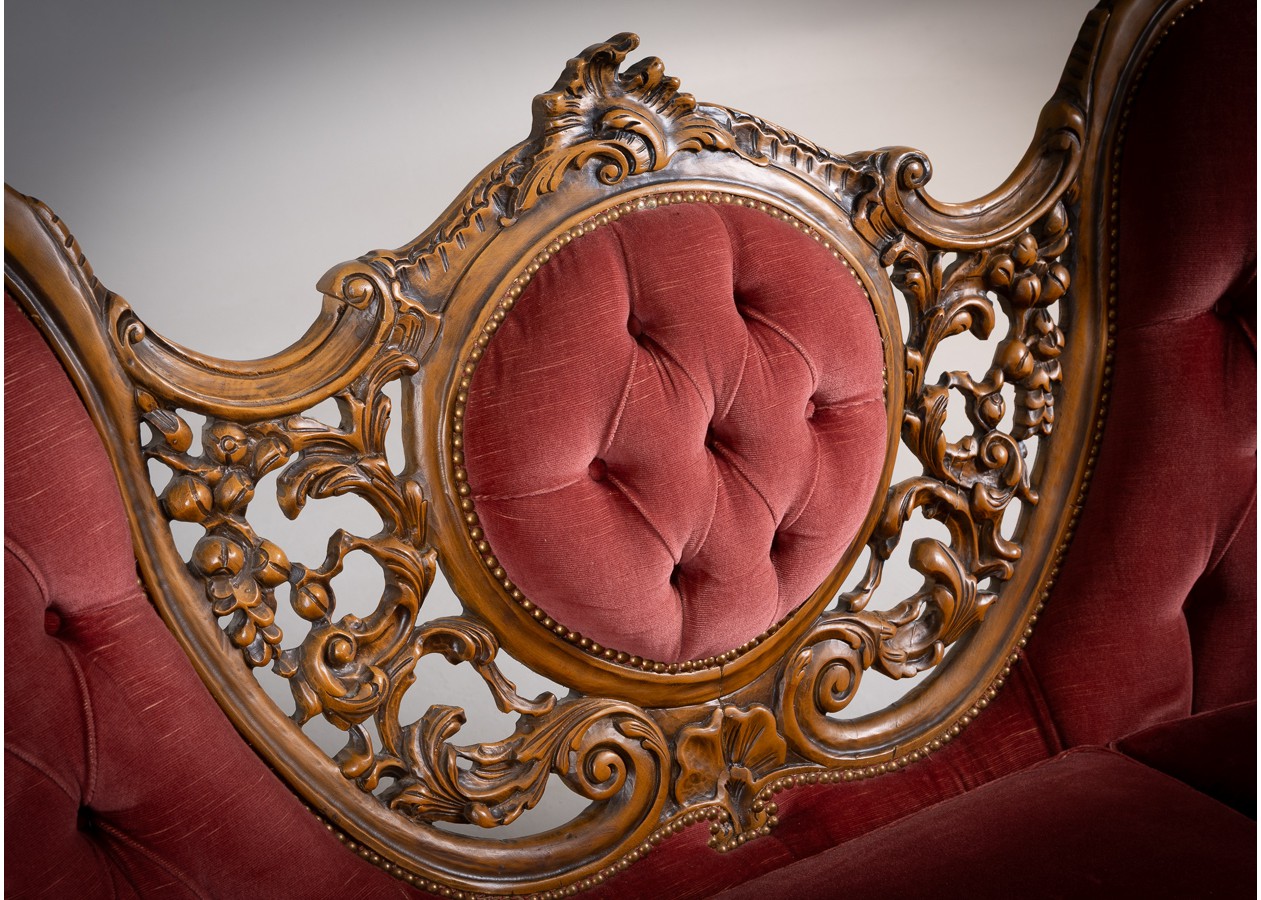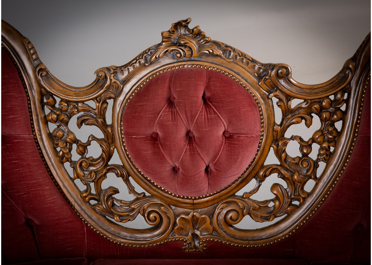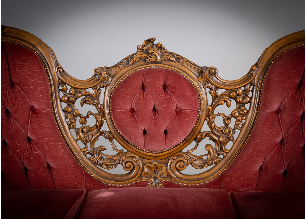 Rafinuotas svetainės baldų komplektas, kuriame klasikinė prabanga susilieja su jaukiu komfortu. Gilios spalvos apmušalai, dailiai sagstyti atlošai ir meniškai raižyti medžio akcentai sukuria iškilmingą, tačiau kviečiančią atmosferą. Tai baldas, kuris ne tik papuošia erdvę, bet ir tampa jos centru.