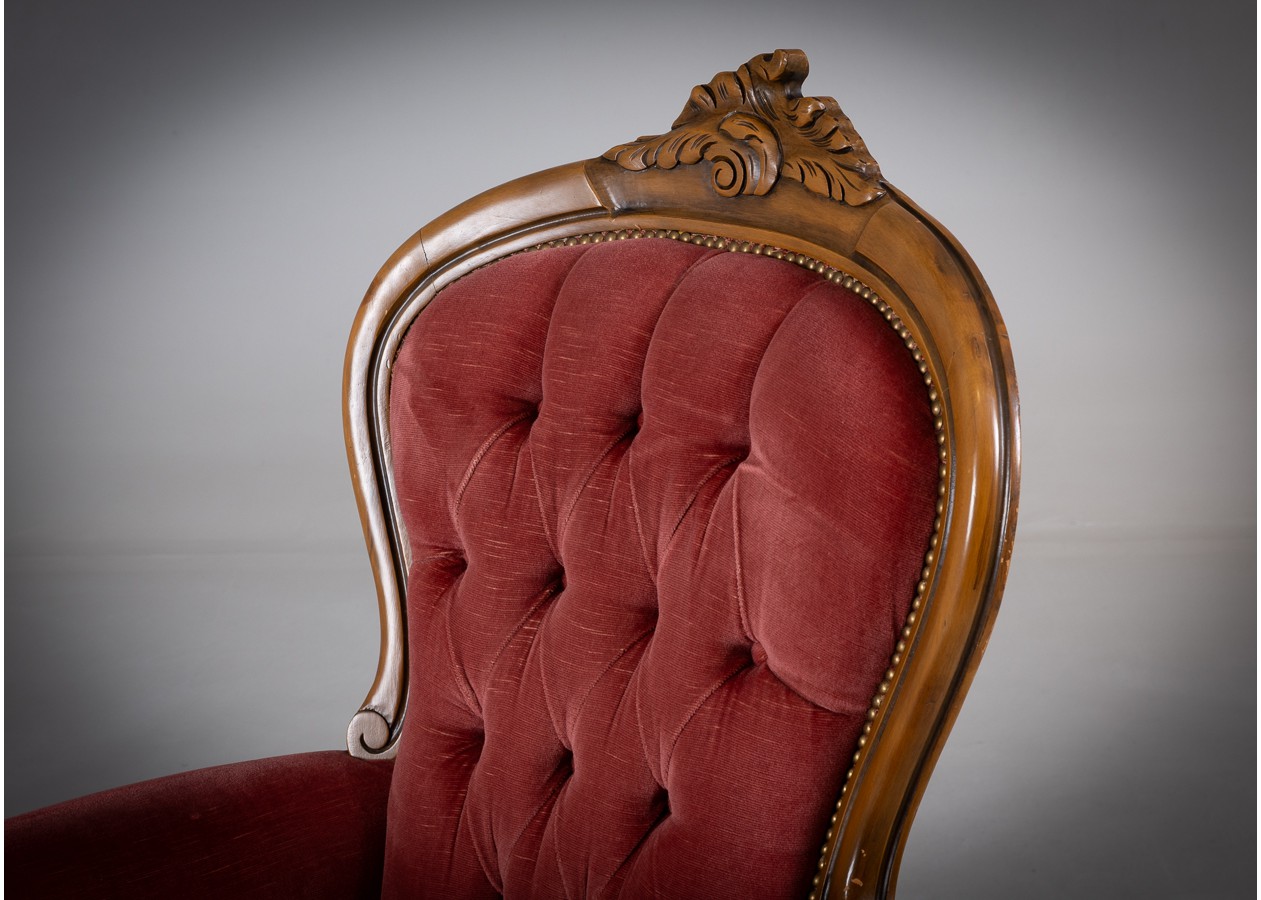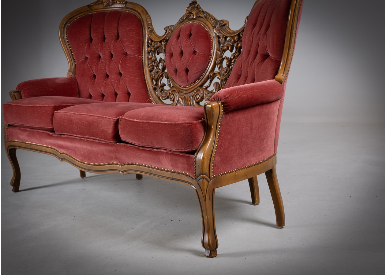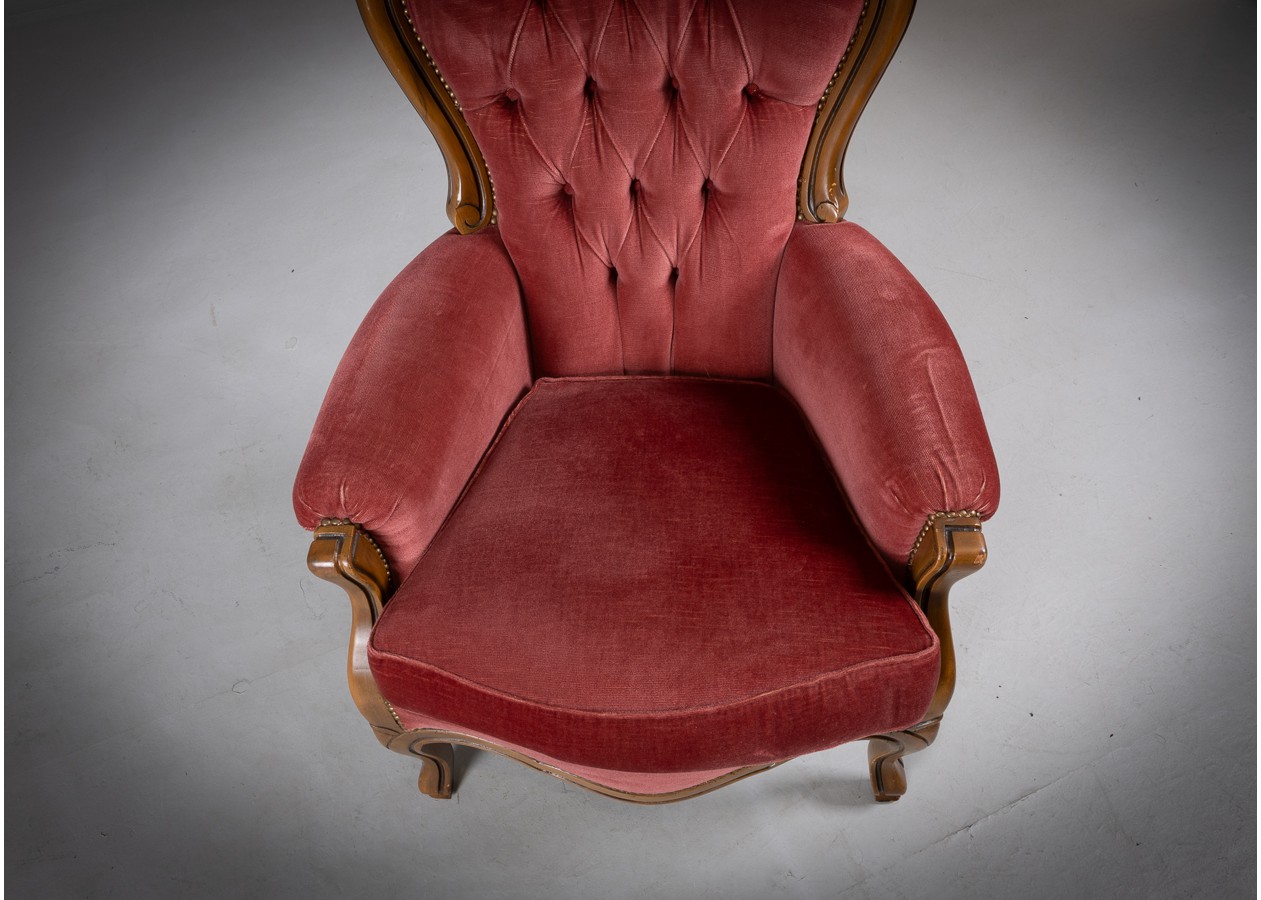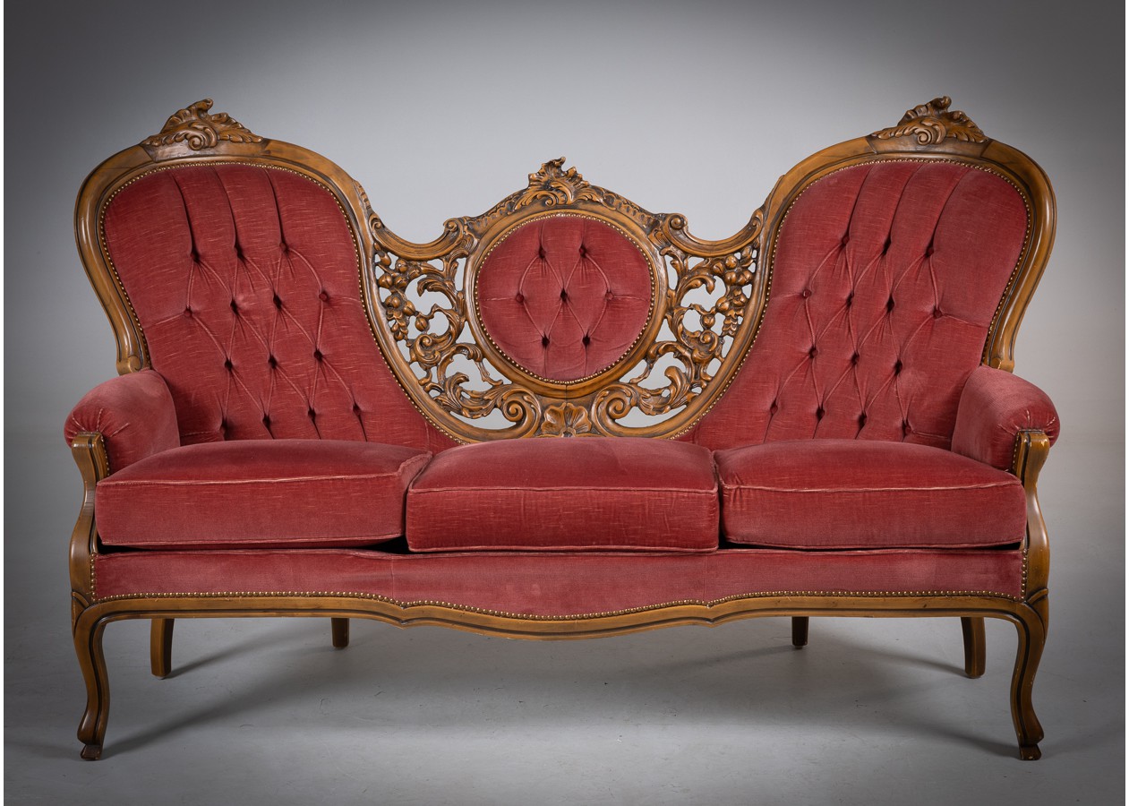 Rafinuotas svetainės baldų komplektas, kuriame klasikinė prabanga susilieja su jaukiu komfortu. Gilios spalvos apmušalai, dailiai sagstyti atlošai ir meniškai raižyti medžio akcentai sukuria iškilmingą, tačiau kviečiančią atmosferą. Tai baldas, kuris ne tik papuošia erdvę, bet ir tampa jos centru.