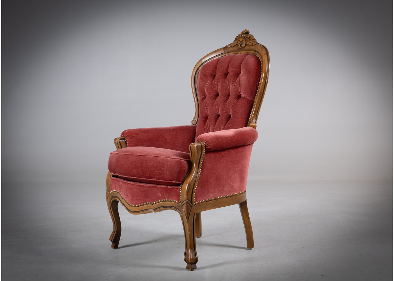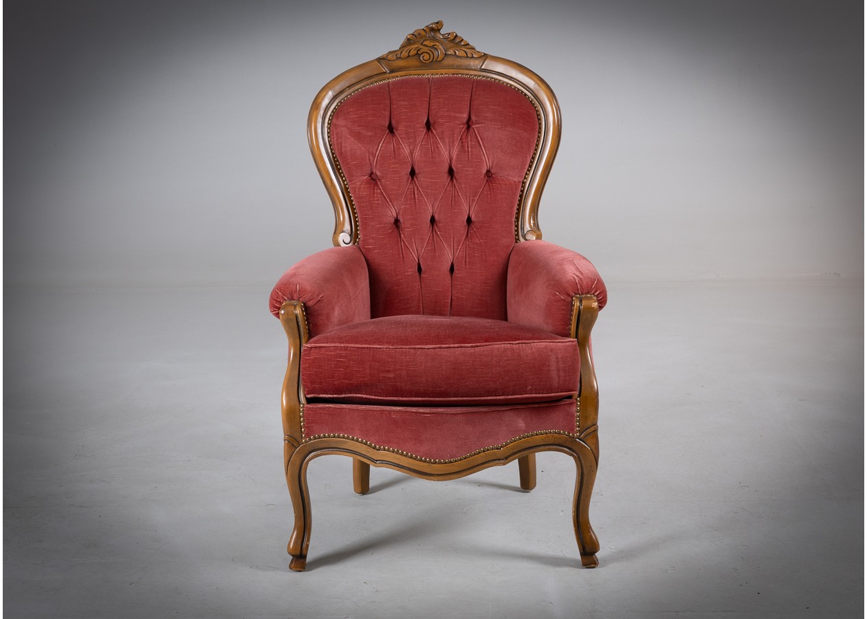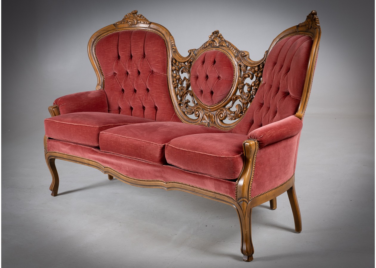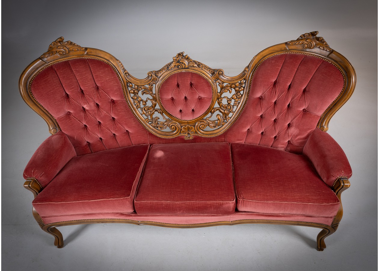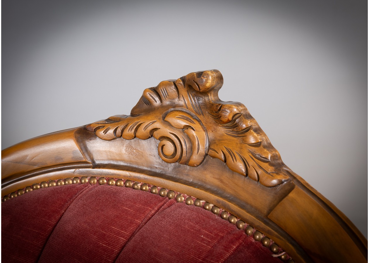 Rafinuotas svetainės baldų komplektas, kuriame klasikinė prabanga susilieja su jaukiu komfortu. Gilios spalvos apmušalai, dailiai sagstyti atlošai ir meniškai raižyti medžio akcentai sukuria iškilmingą, tačiau kviečiančią atmosferą. Tai baldas, kuris ne tik papuošia erdvę, bet ir tampa jos centru.