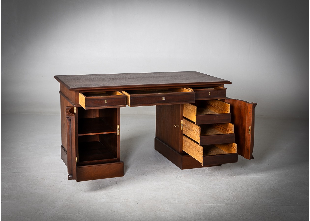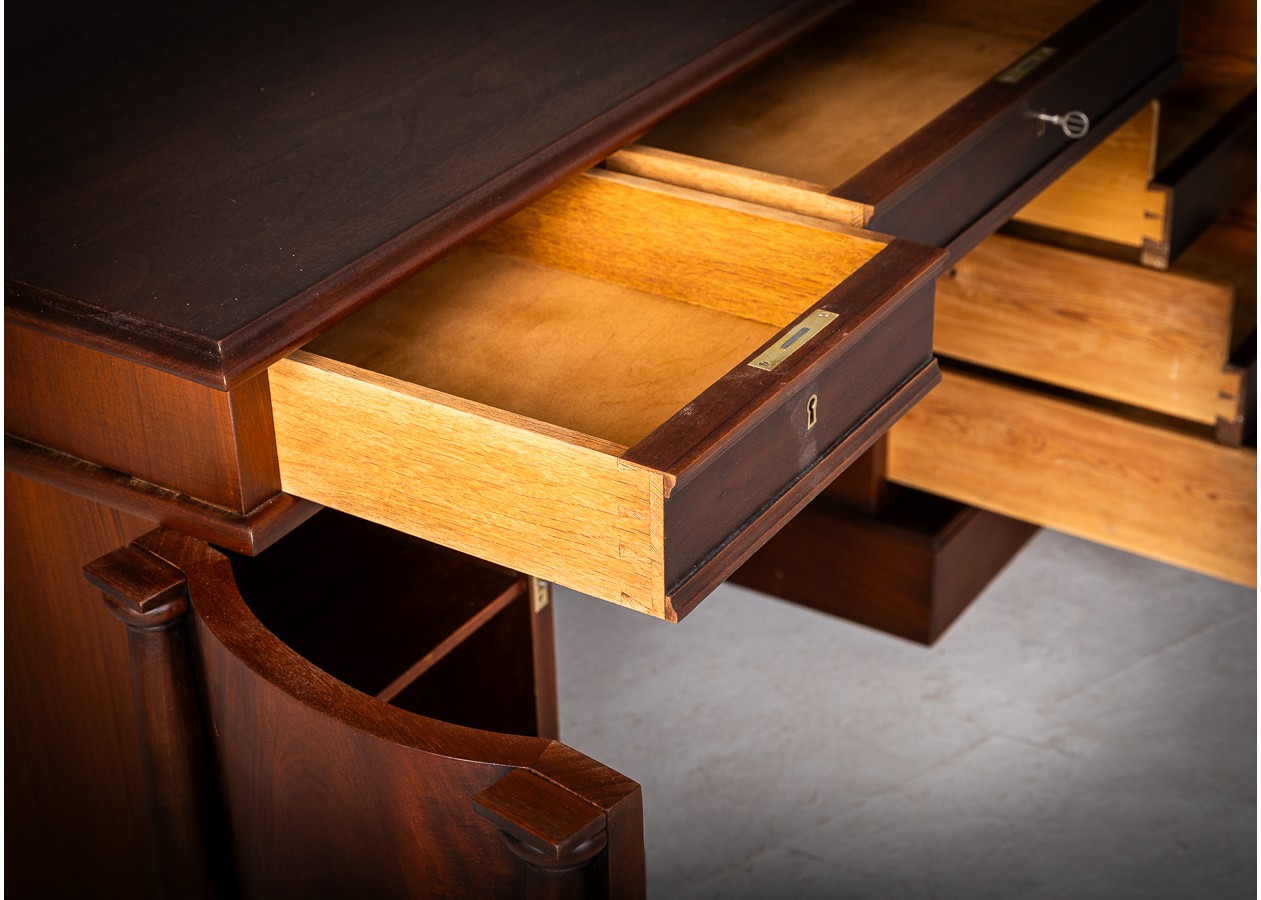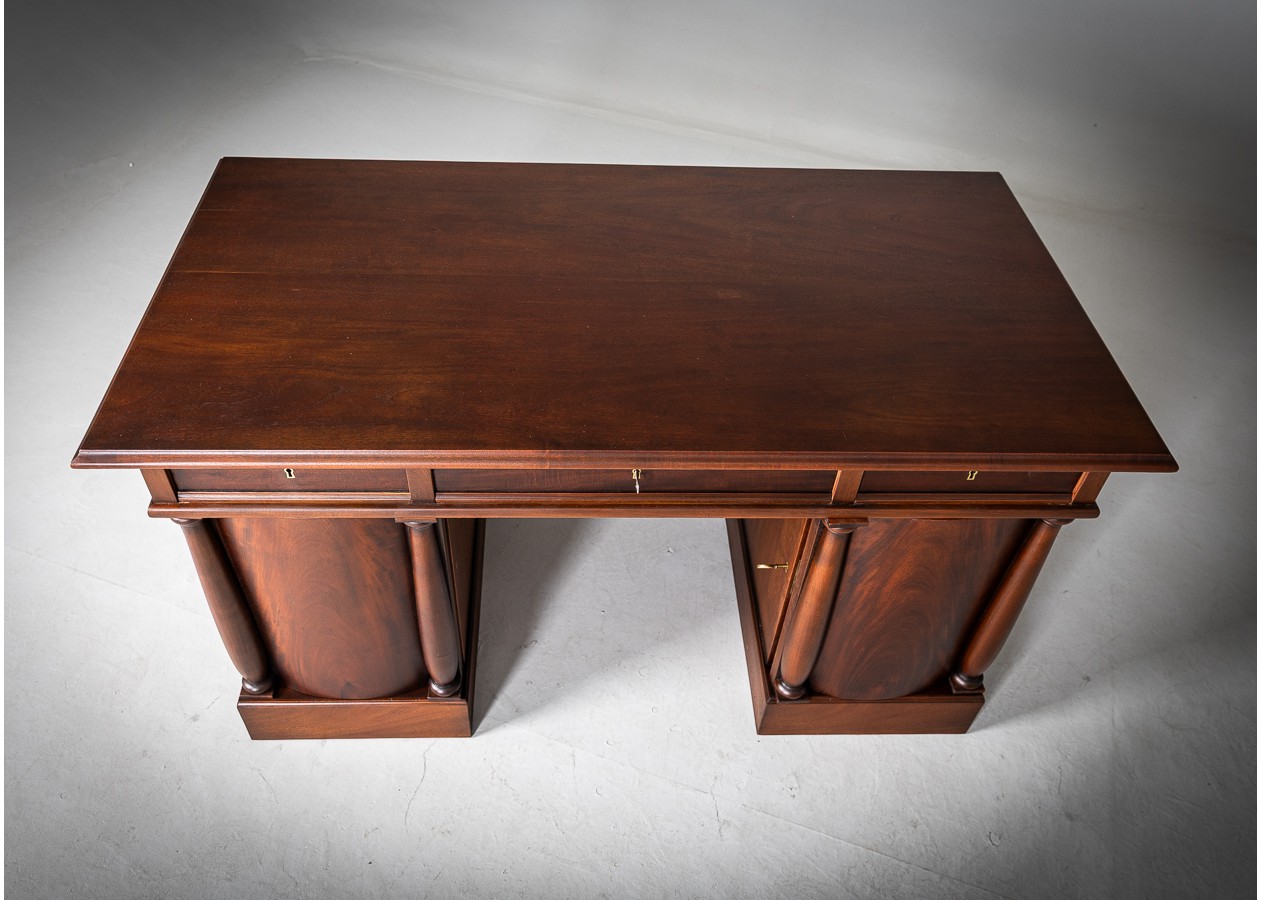 Šis išskirtinis rašomasis stalas – tai solidumo ir elegancijos dermė, kuri akimirksniu suteikia erdvei prestižo. Išraiškinga natūralaus medžio tekstūra, grakščios kolonos ir harmoningos proporcijos kuria prabangų, tačiau skoningą įvaizdį. Platus stalviršis užtikrina patogią darbo erdvę, o talpūs stalčiai ir spintelės leidžia išlaikyti tvarką be kompromisų.