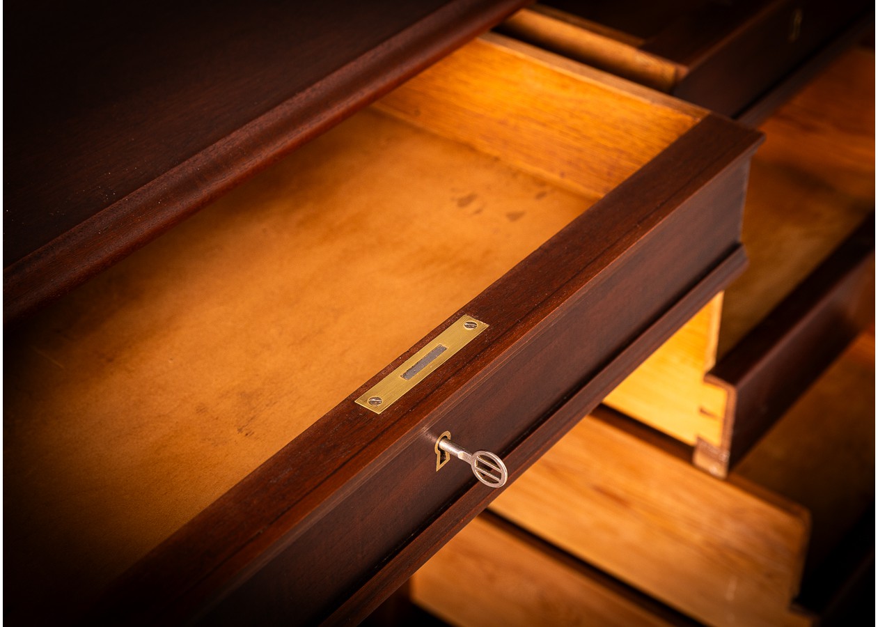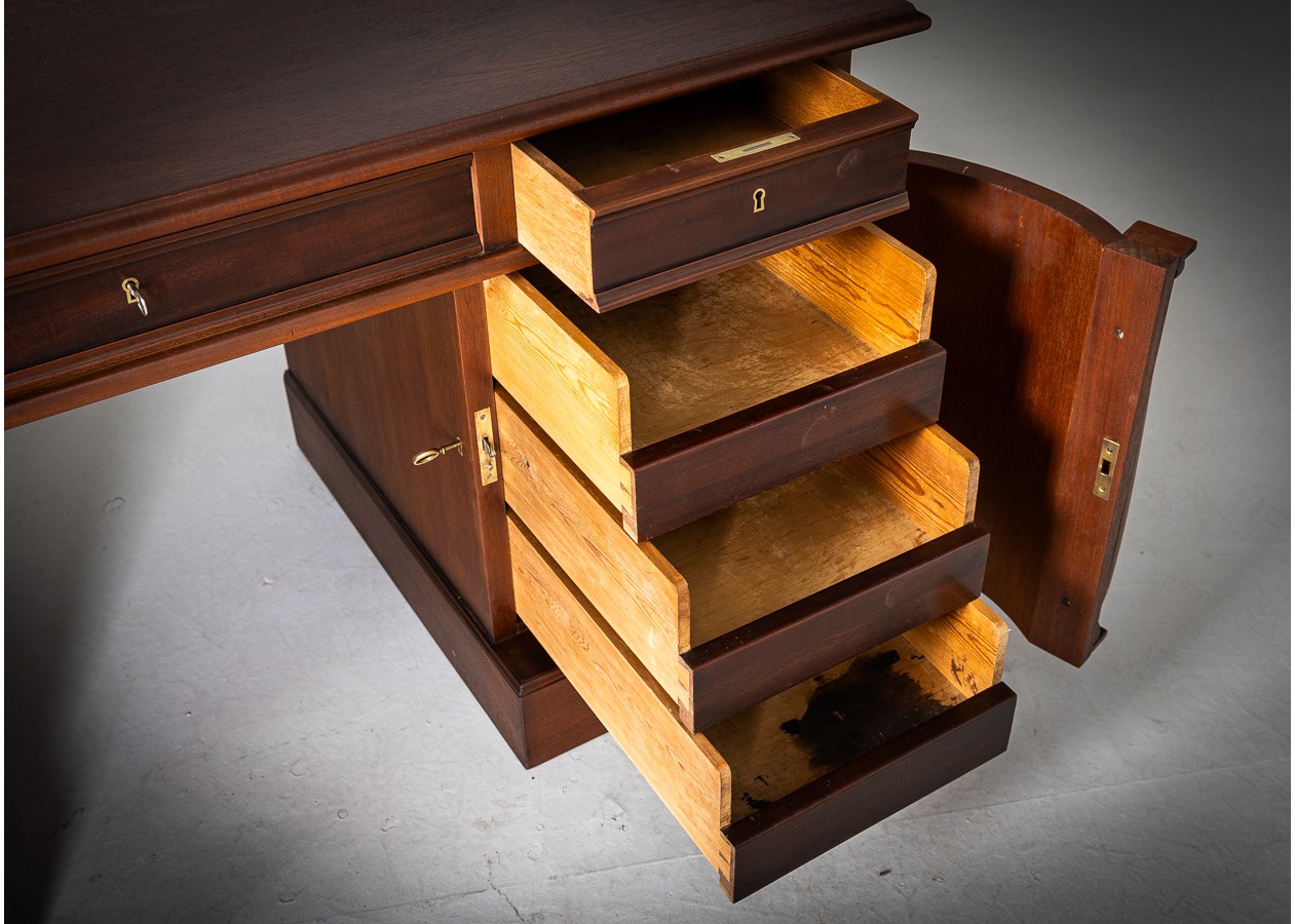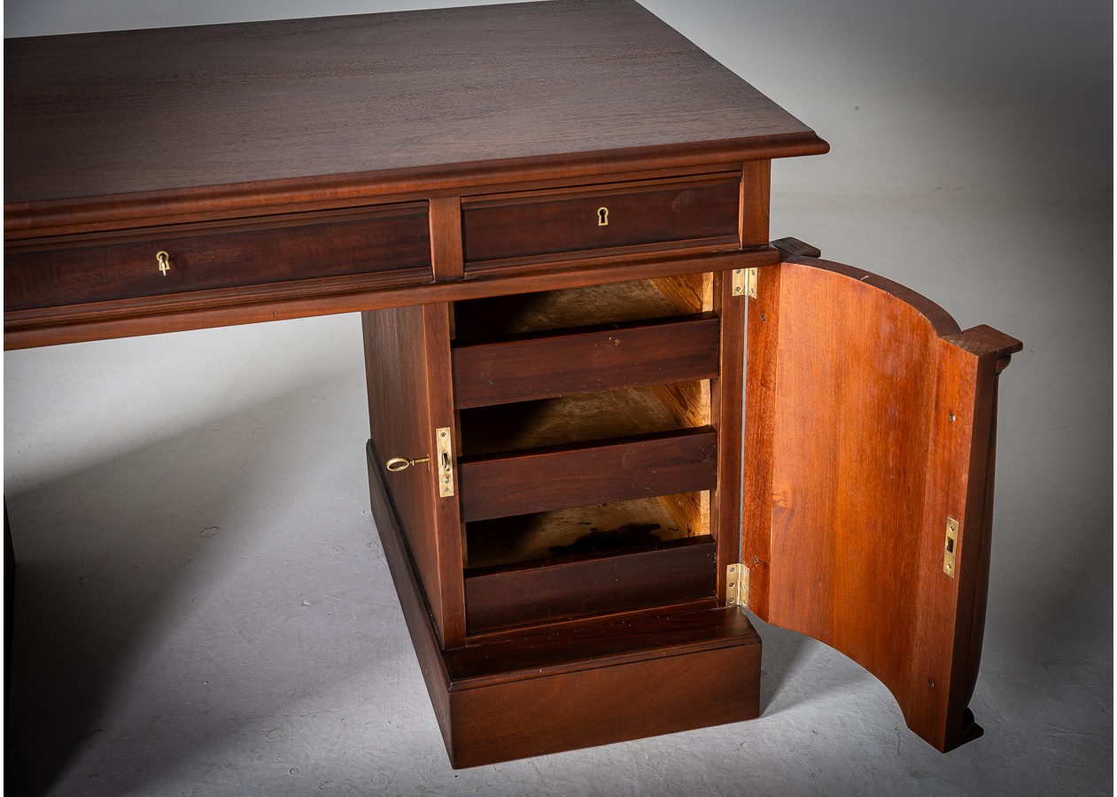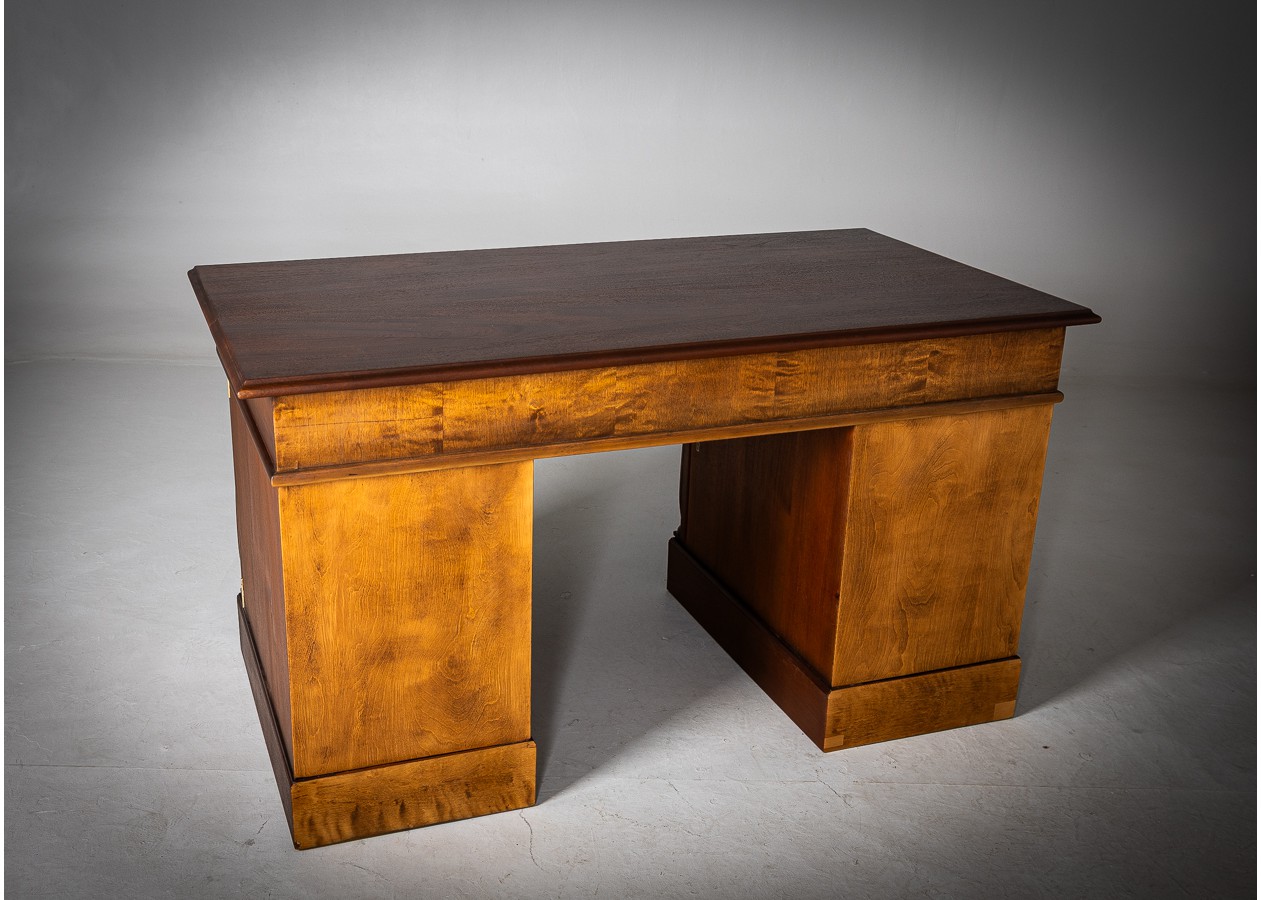 Šis išskirtinis rašomasis stalas – tai solidumo ir elegancijos dermė, kuri akimirksniu suteikia erdvei prestižo. Išraiškinga natūralaus medžio tekstūra, grakščios kolonos ir harmoningos proporcijos kuria prabangų, tačiau skoningą įvaizdį. Platus stalviršis užtikrina patogią darbo erdvę, o talpūs stalčiai ir spintelės leidžia išlaikyti tvarką be kompromisų.