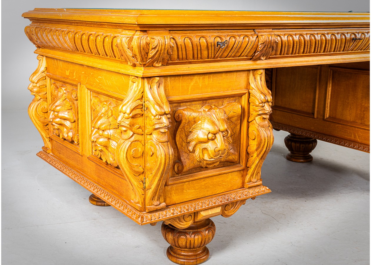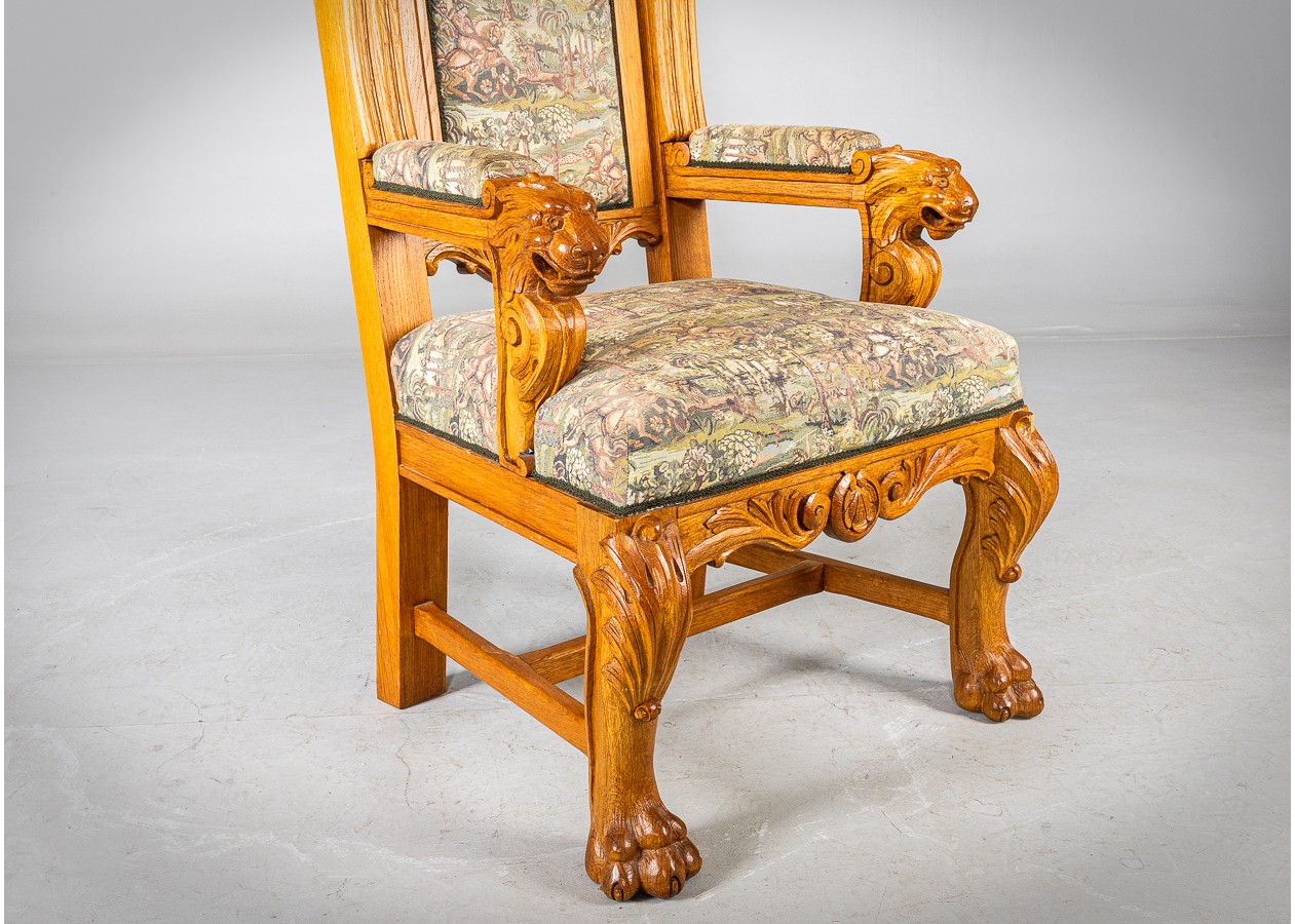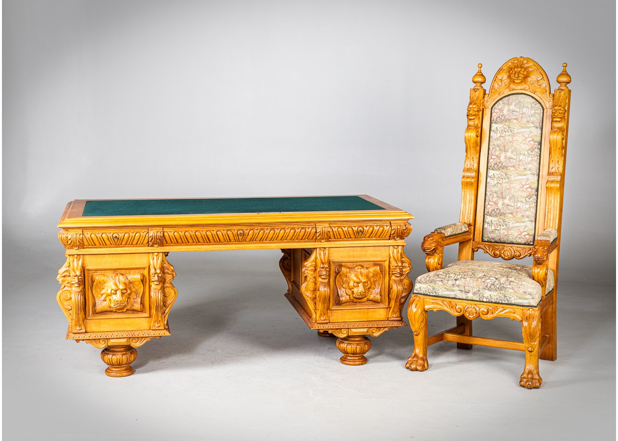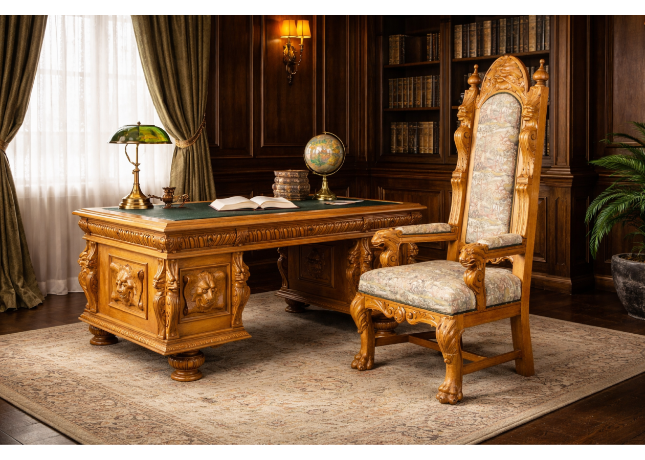 Išskirtinio charakterio masyvus ąžuolinis darbo stalas su aukštu krėslu, sukurtas lietuvių meistro rankomis. Dvipusė konstrukcija leidžia stalą statyti erdvės centre, o gausi plastinė drožyba – liūtų galvos, stilizuotos figūros ir dekoratyviniai elementai – kuria įspūdingą, beveik skulptūrinę formą. Monumentalus krėslas su gobeleno audiniu dar labiau sustiprina baldo reprezentacinį įspūdį.