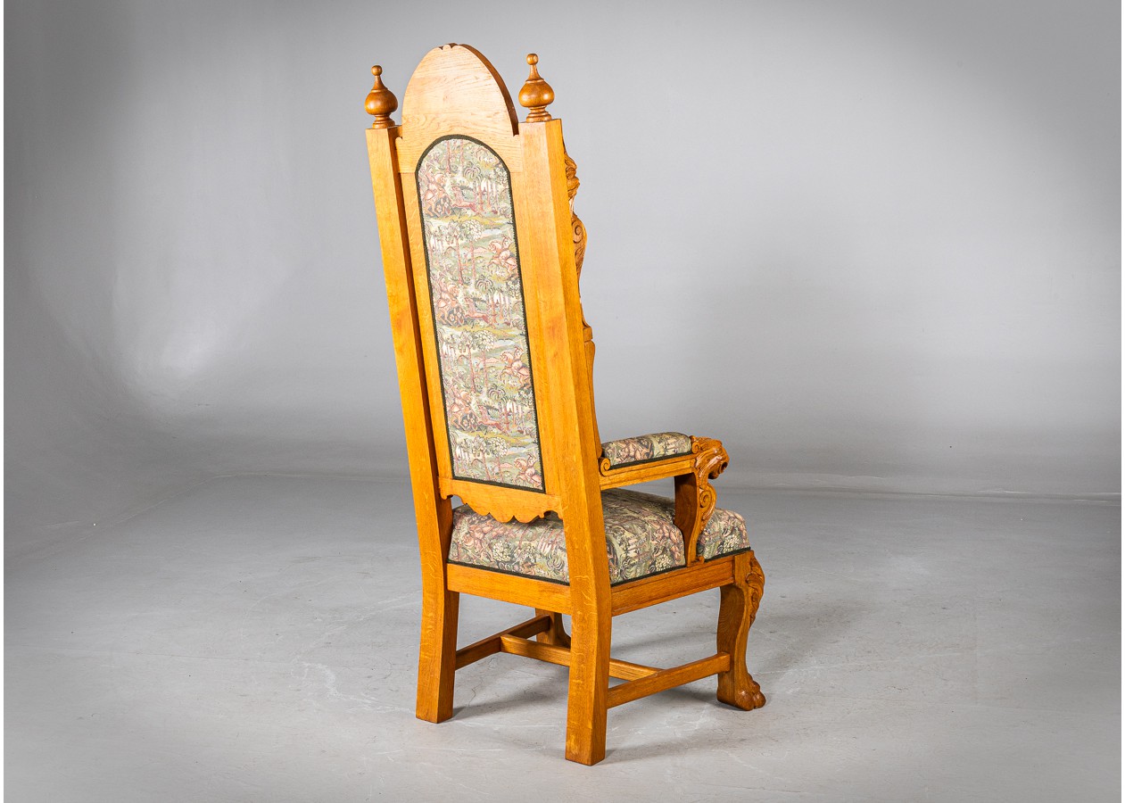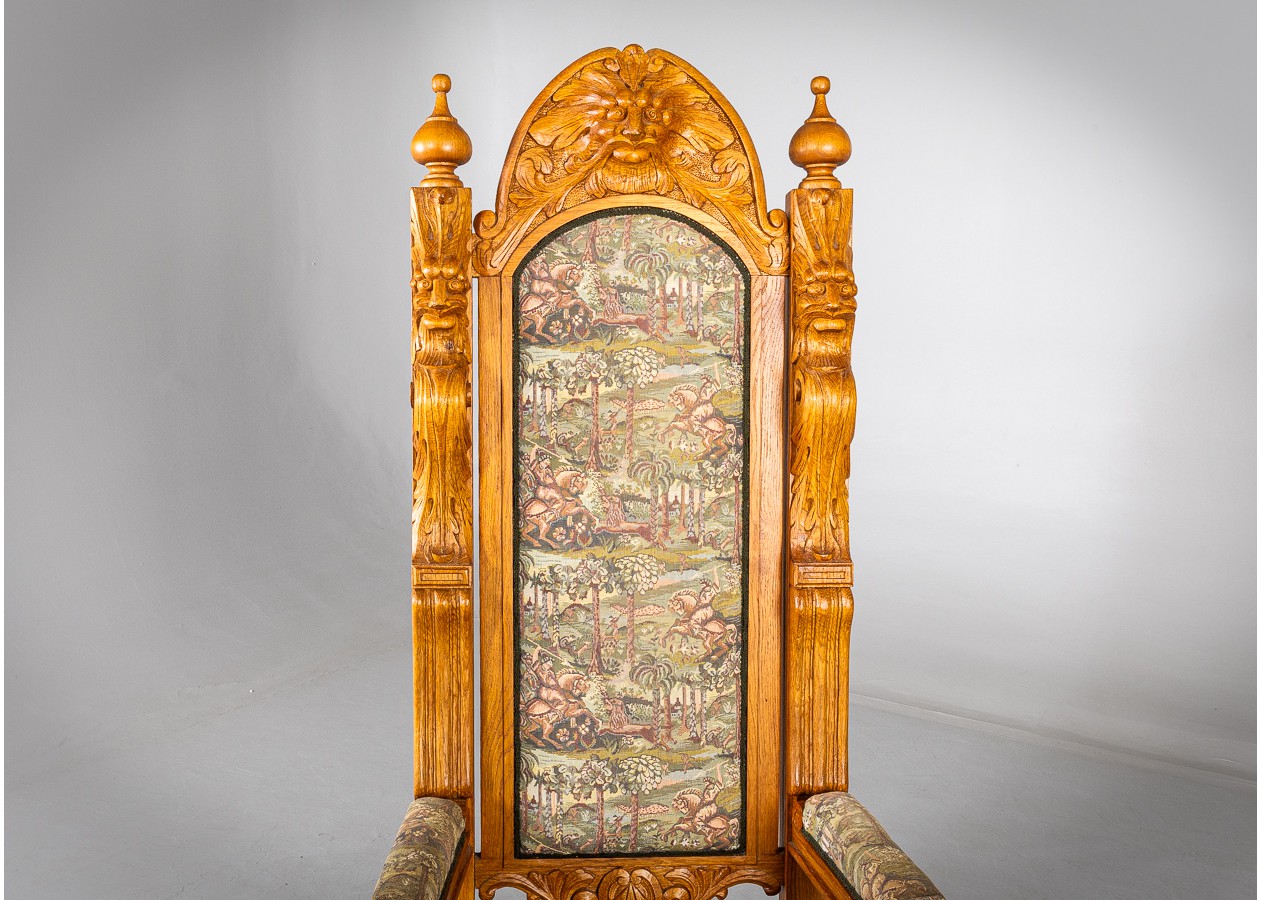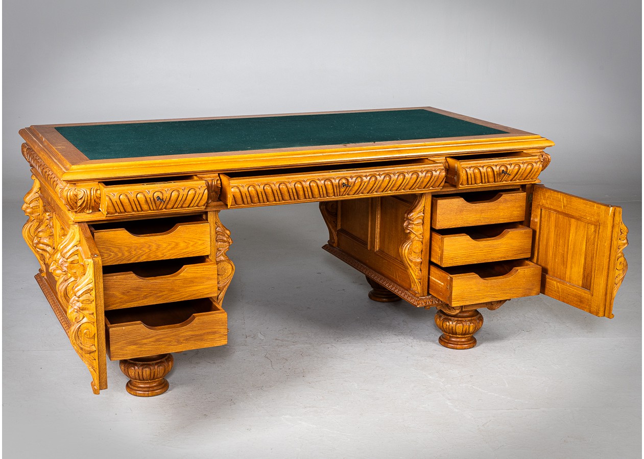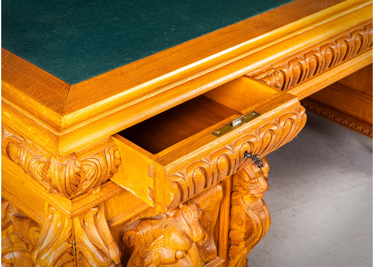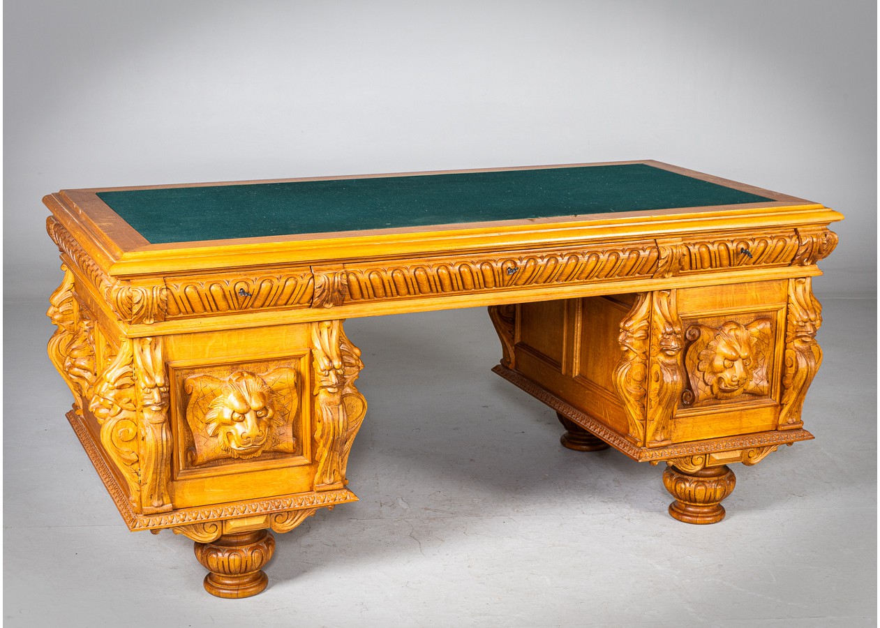 Išskirtinio charakterio masyvus ąžuolinis darbo stalas su aukštu krėslu, sukurtas lietuvių meistro rankomis. Dvipusė konstrukcija leidžia stalą statyti erdvės centre, o gausi plastinė drožyba – liūtų galvos, stilizuotos figūros ir dekoratyviniai elementai – kuria įspūdingą, beveik skulptūrinę formą. Monumentalus krėslas su gobeleno audiniu dar labiau sustiprina baldo reprezentacinį įspūdį.