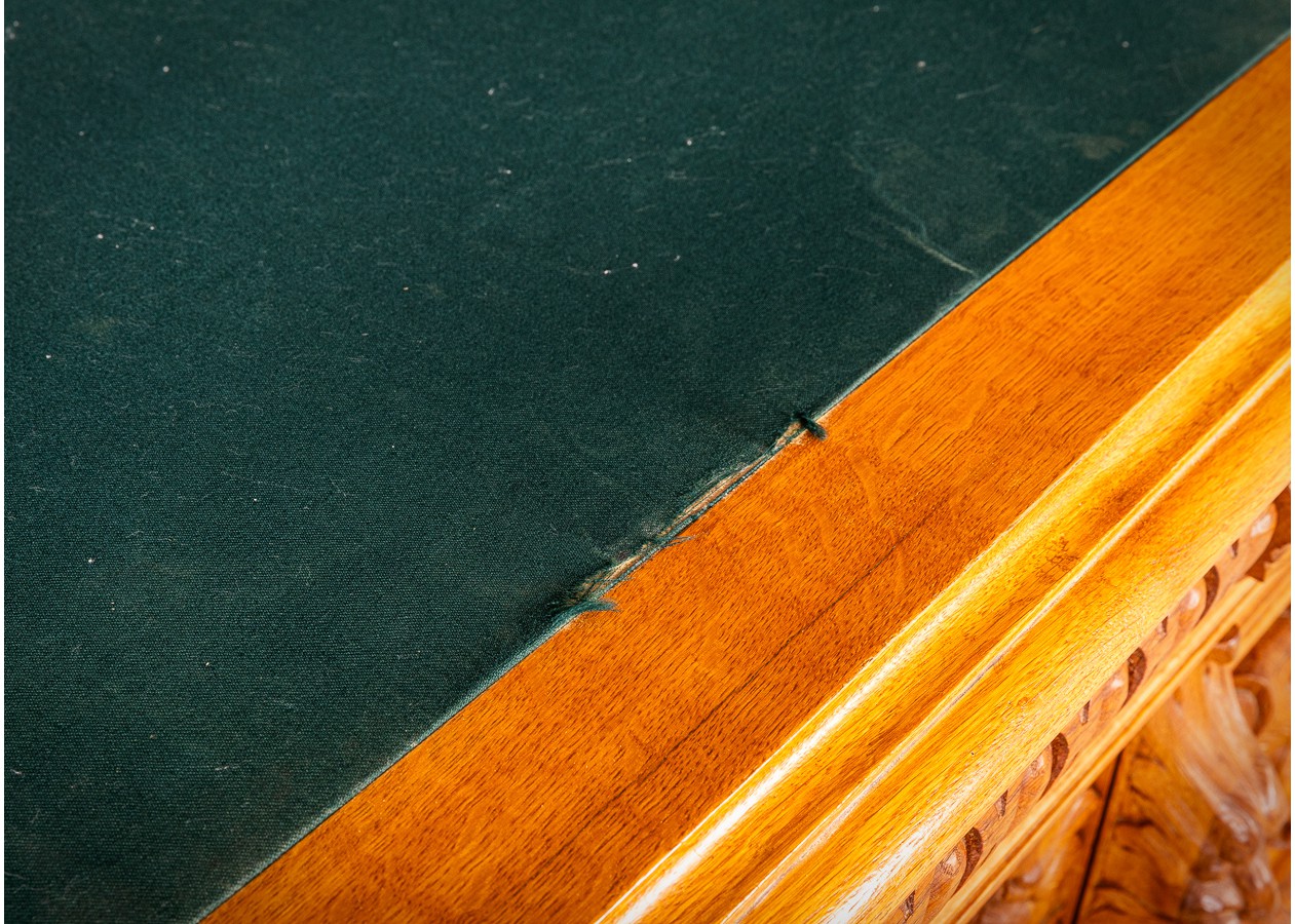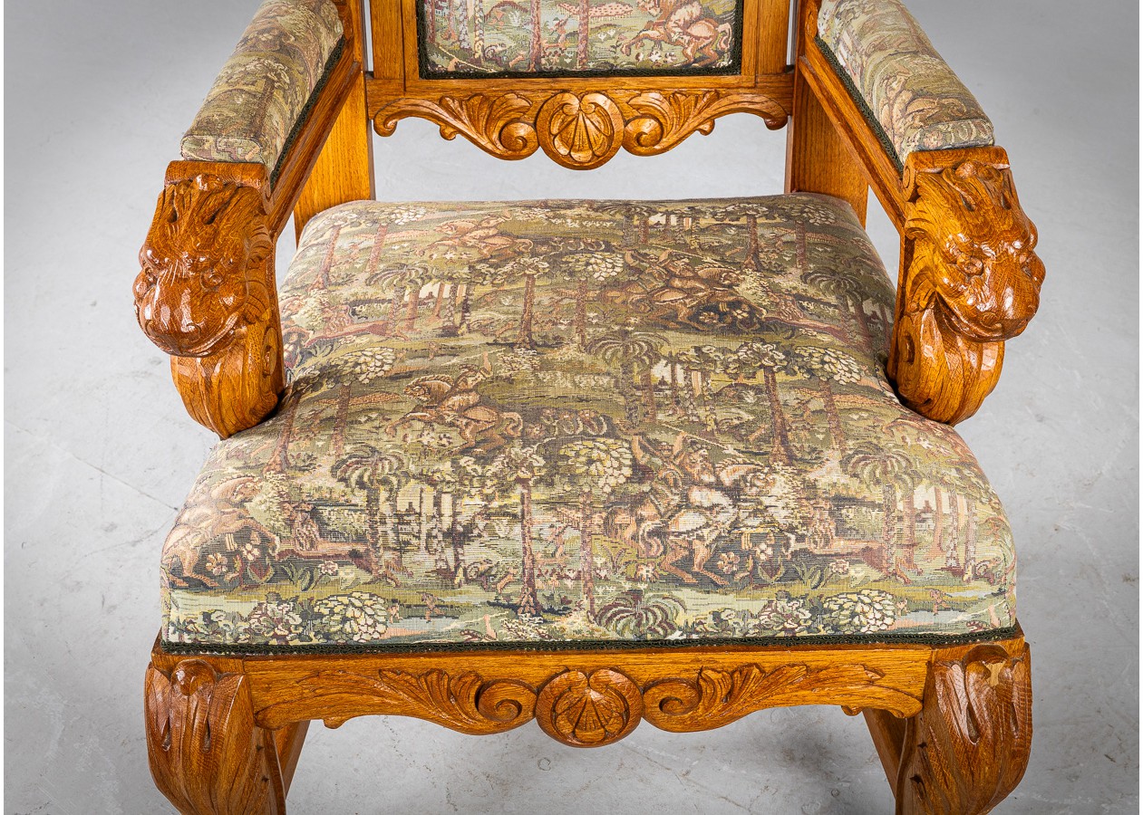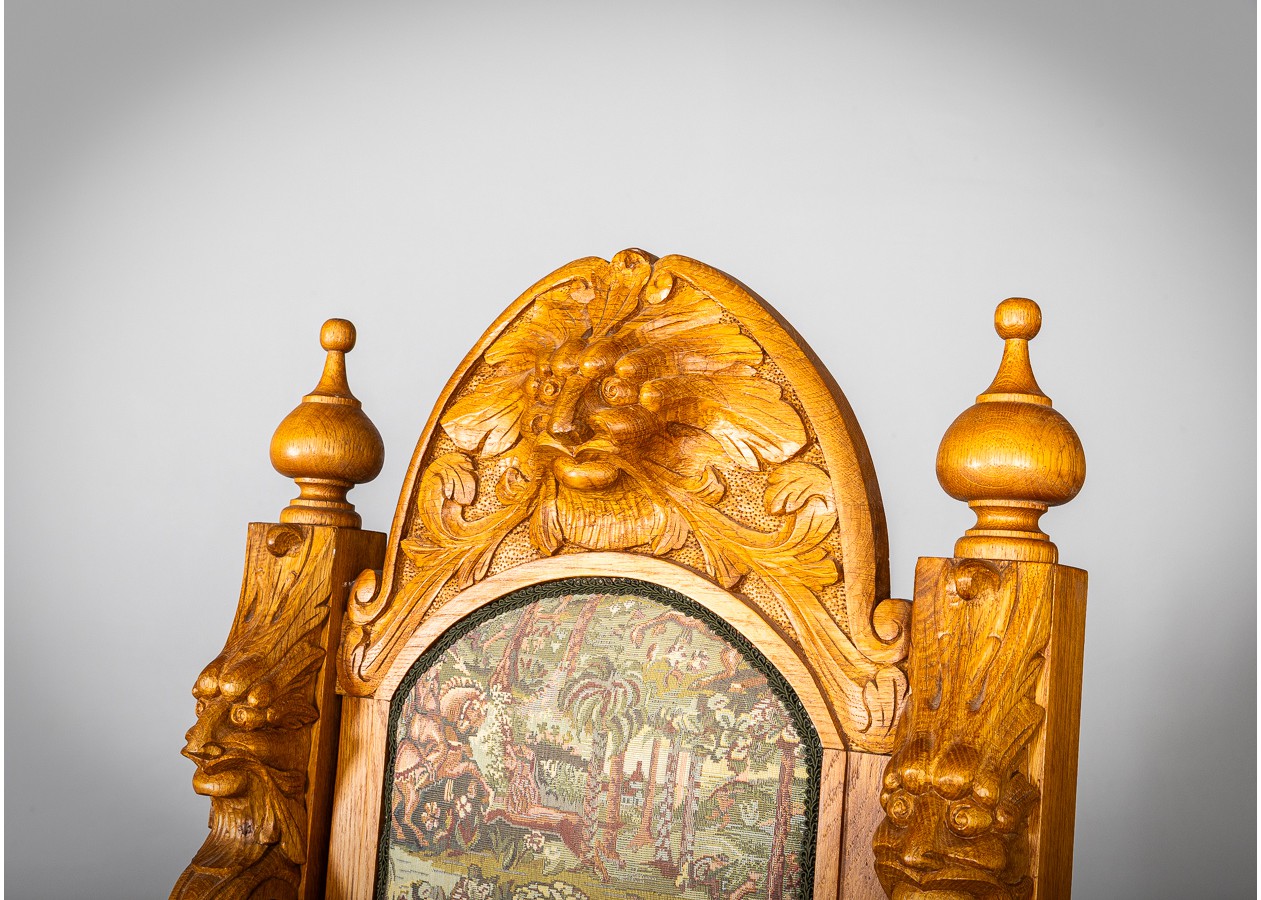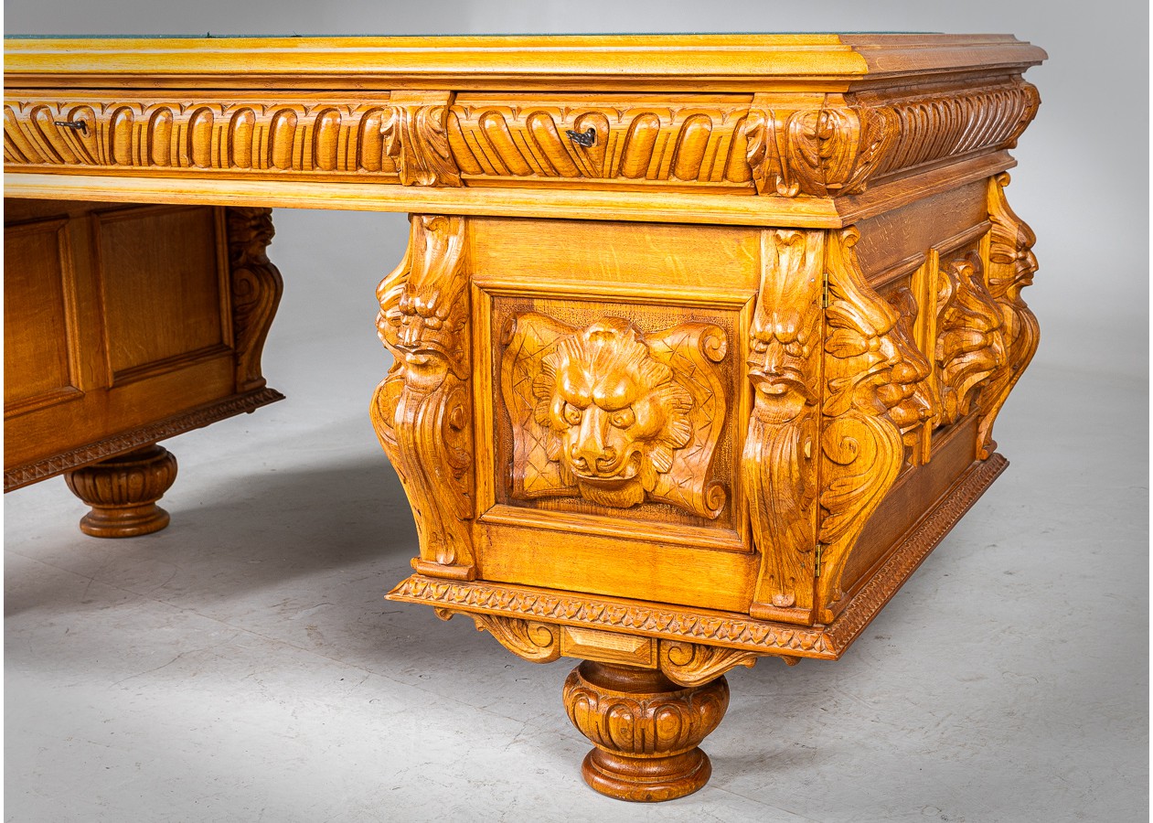 Išskirtinio charakterio masyvus ąžuolinis darbo stalas su aukštu krėslu, sukurtas lietuvių meistro rankomis. Dvipusė konstrukcija leidžia stalą statyti erdvės centre, o gausi plastinė drožyba – liūtų galvos, stilizuotos figūros ir dekoratyviniai elementai – kuria įspūdingą, beveik skulptūrinę formą. Monumentalus krėslas su gobeleno audiniu dar labiau sustiprina baldo reprezentacinį įspūdį.