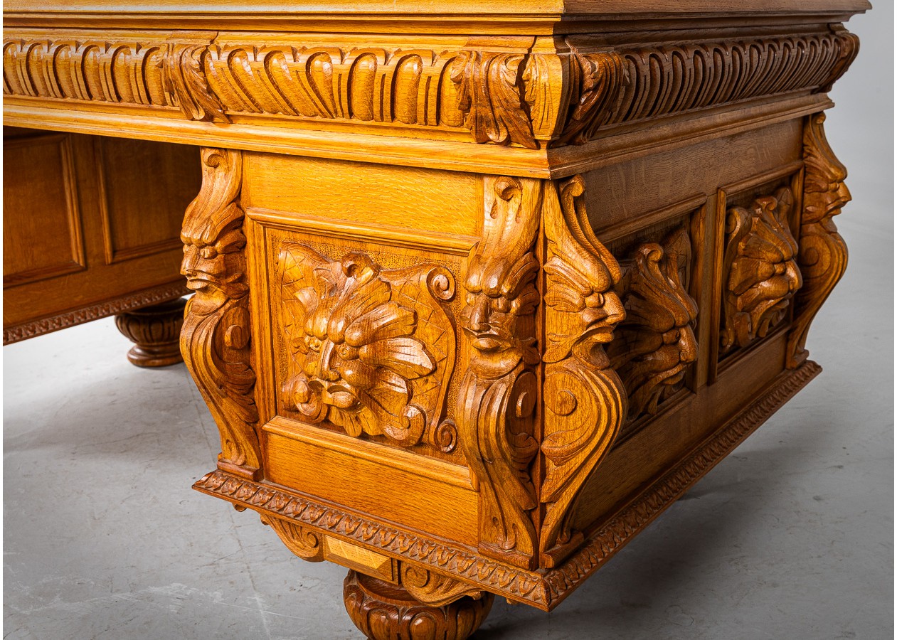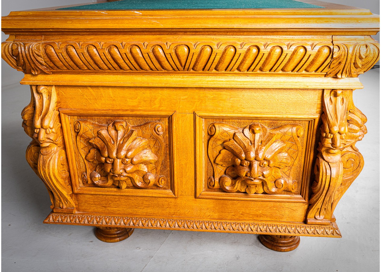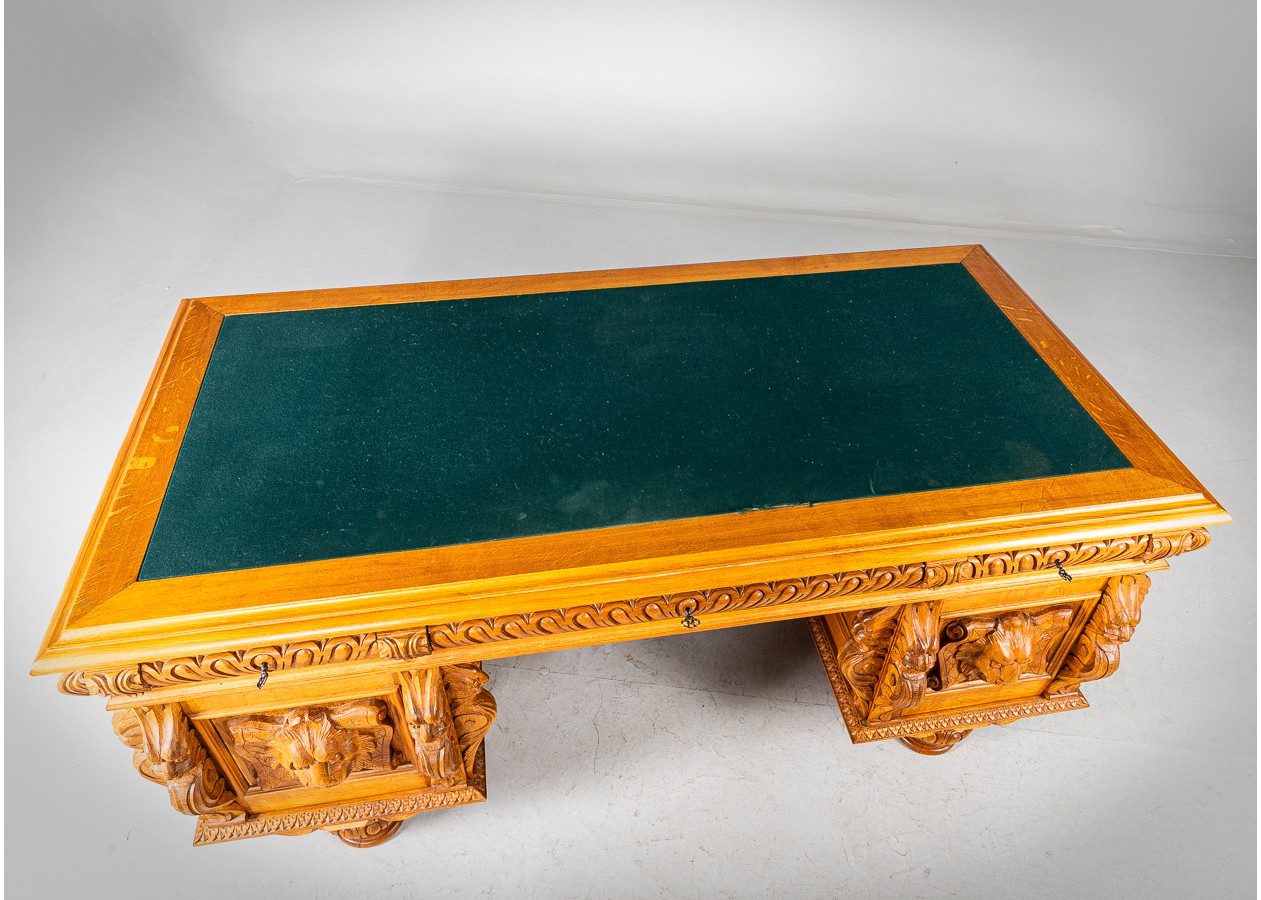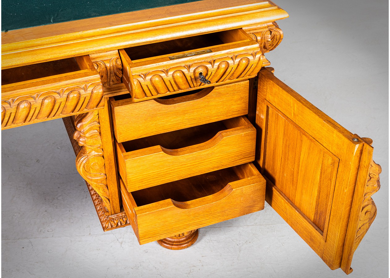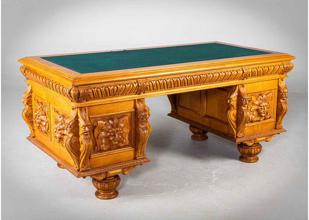 Išskirtinio charakterio masyvus ąžuolinis darbo stalas su aukštu krėslu, sukurtas lietuvių meistro rankomis. Dvipusė konstrukcija leidžia stalą statyti erdvės centre, o gausi plastinė drožyba – liūtų galvos, stilizuotos figūros ir dekoratyviniai elementai – kuria įspūdingą, beveik skulptūrinę formą. Monumentalus krėslas su gobeleno audiniu dar labiau sustiprina baldo reprezentacinį įspūdį.