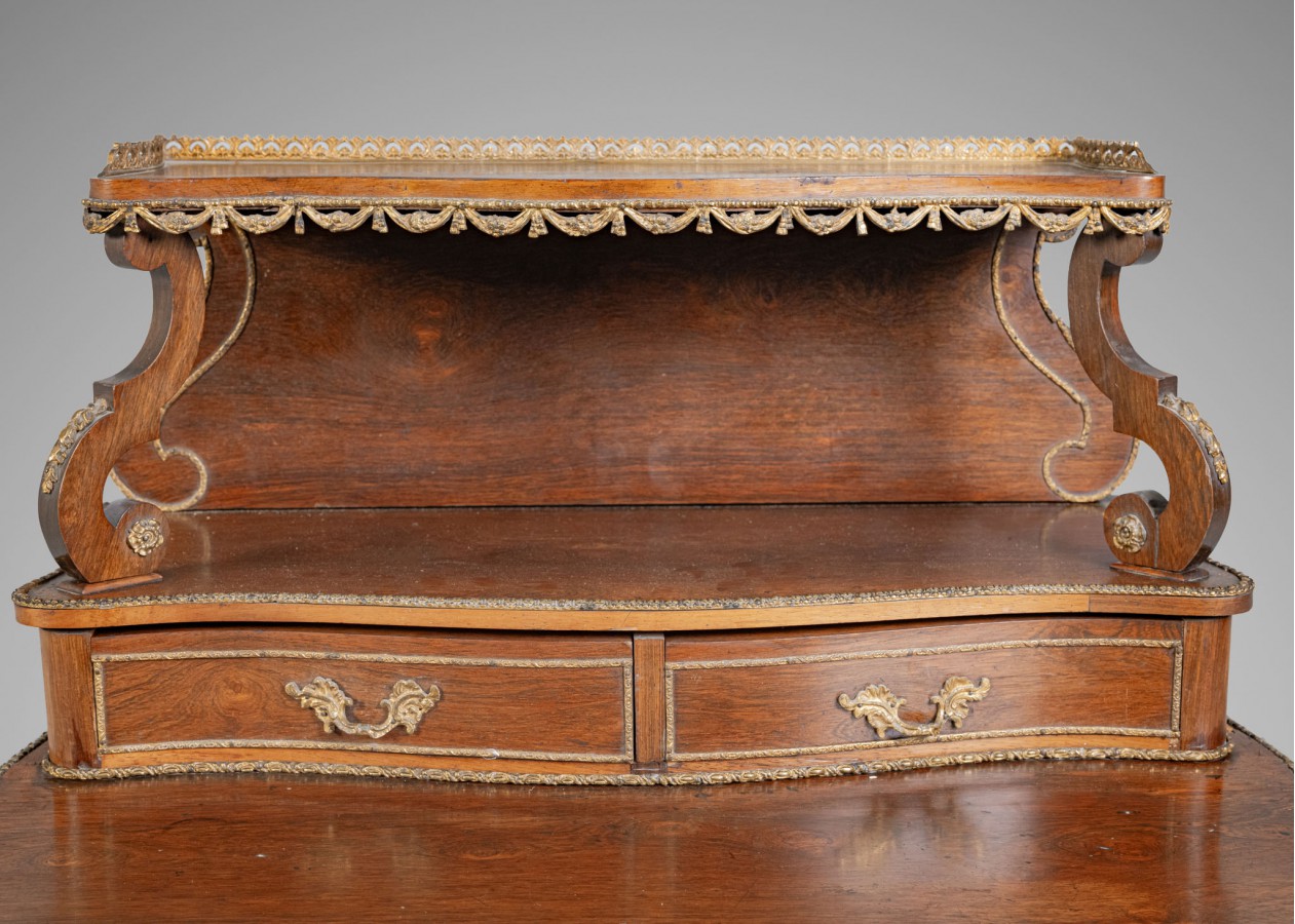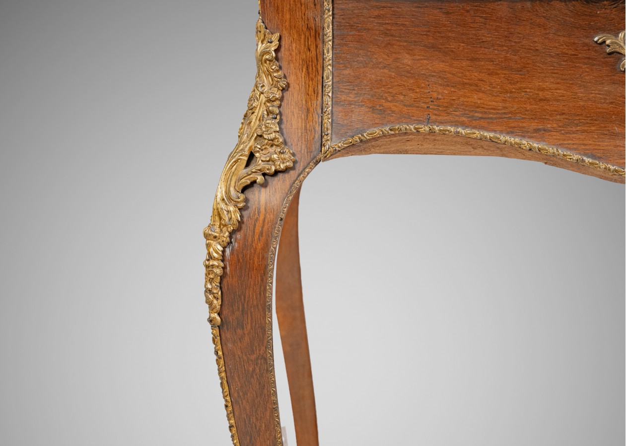 Šis nedidelis rašomasis stalas-sekretaras primena jaukius senųjų laikų kambarius, kur gimdavo laiškai ir mintys. Švelniai išlenktos formos, šiltas medžio atspalvis ir subtilūs bronzos akcentai kuria elegantišką, lengvai nostalgišką nuotaiką, kviečiančią prisėsti ir pasinerti į ramų kūrybos momentą.
