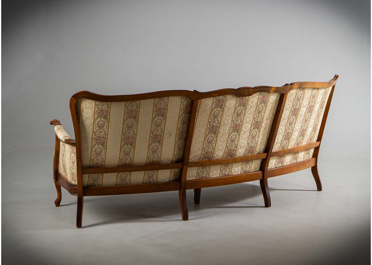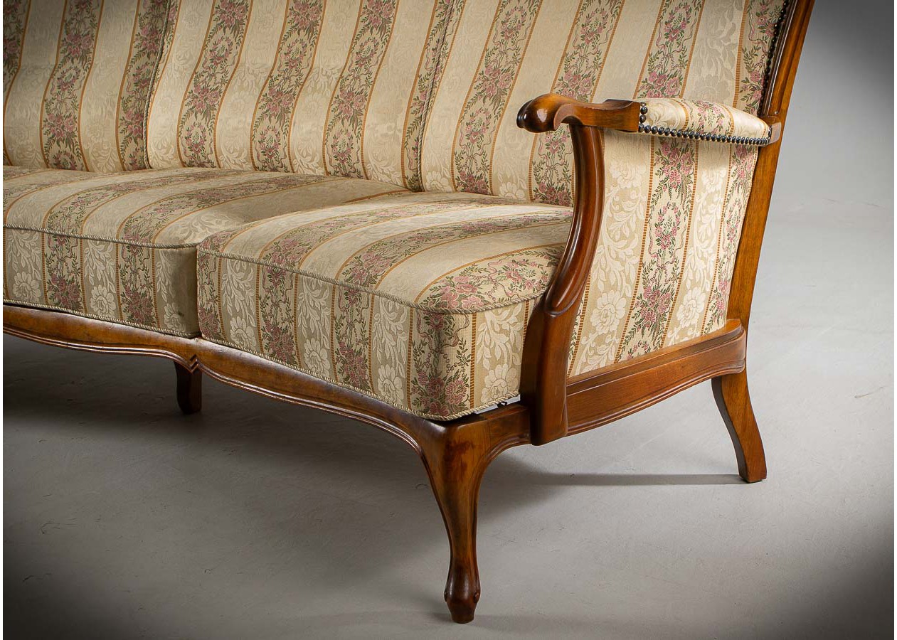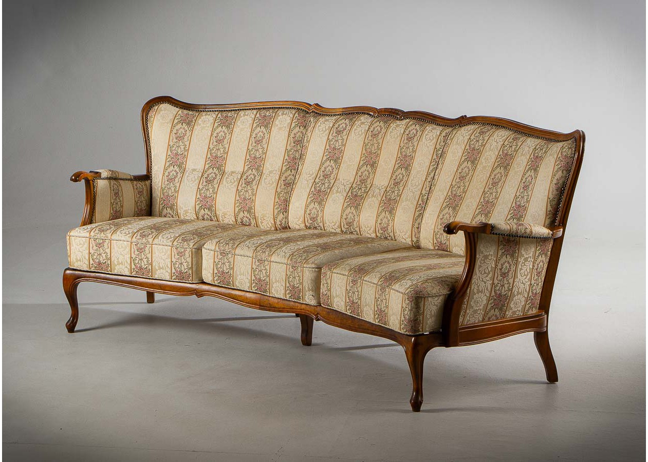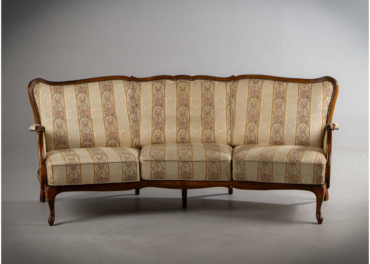 Elegantiška trijų vietų sofa su banguotu siluetu, švelniai profiliuotu mediniu karkasu ir subtiliomis rankų atramomis. Šviesi, dekoratyvinė tekstilė pabrėžia baldo lengvumą, o grakščios kojos suteikia vizualinės harmonijos. Tai baldas, kuris interjere kuria rafinuotą ramybės pojūtį ir gali tapti išraiškingu akcentu net šiuolaikiškai interpretuotoje erdvėje.