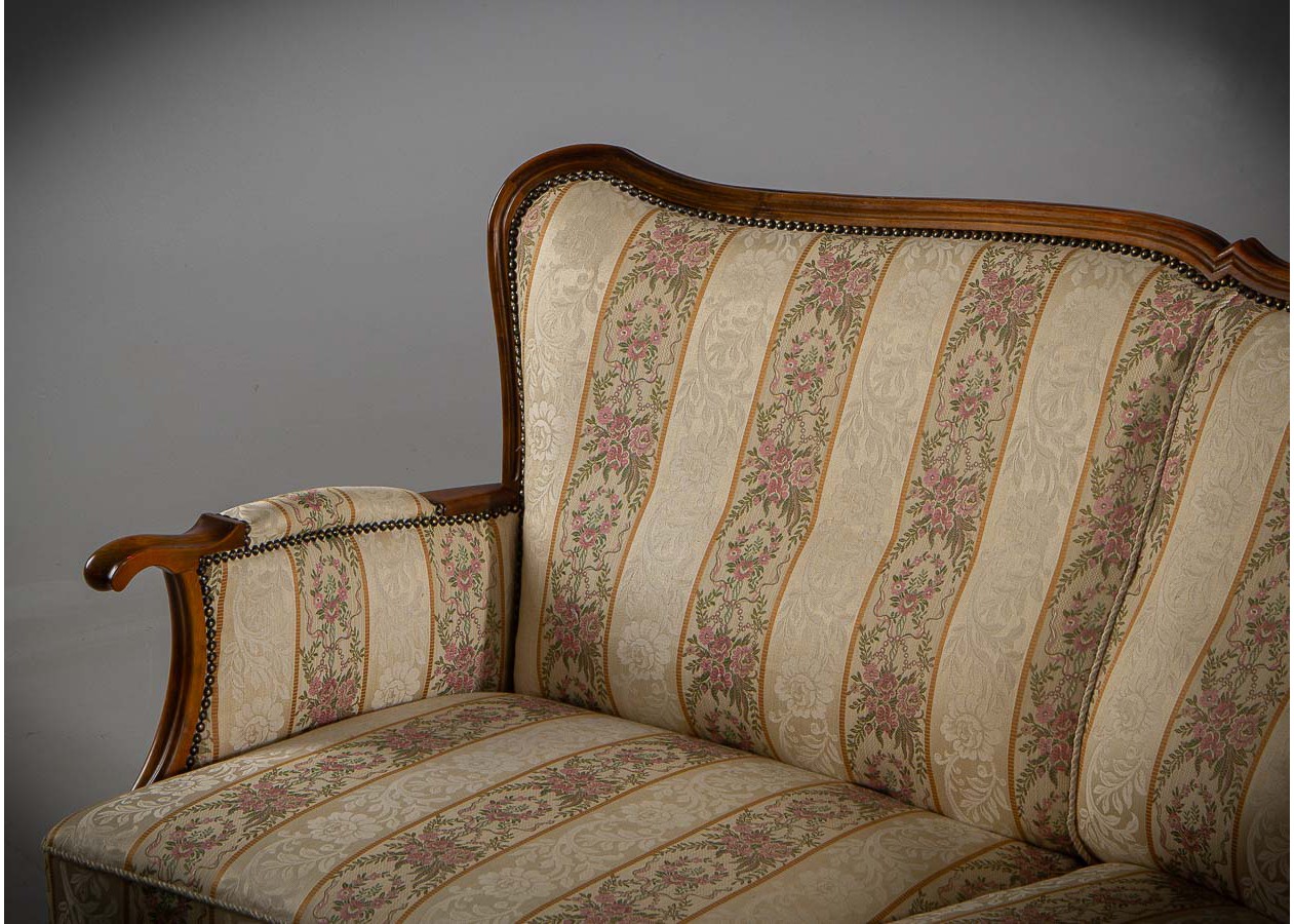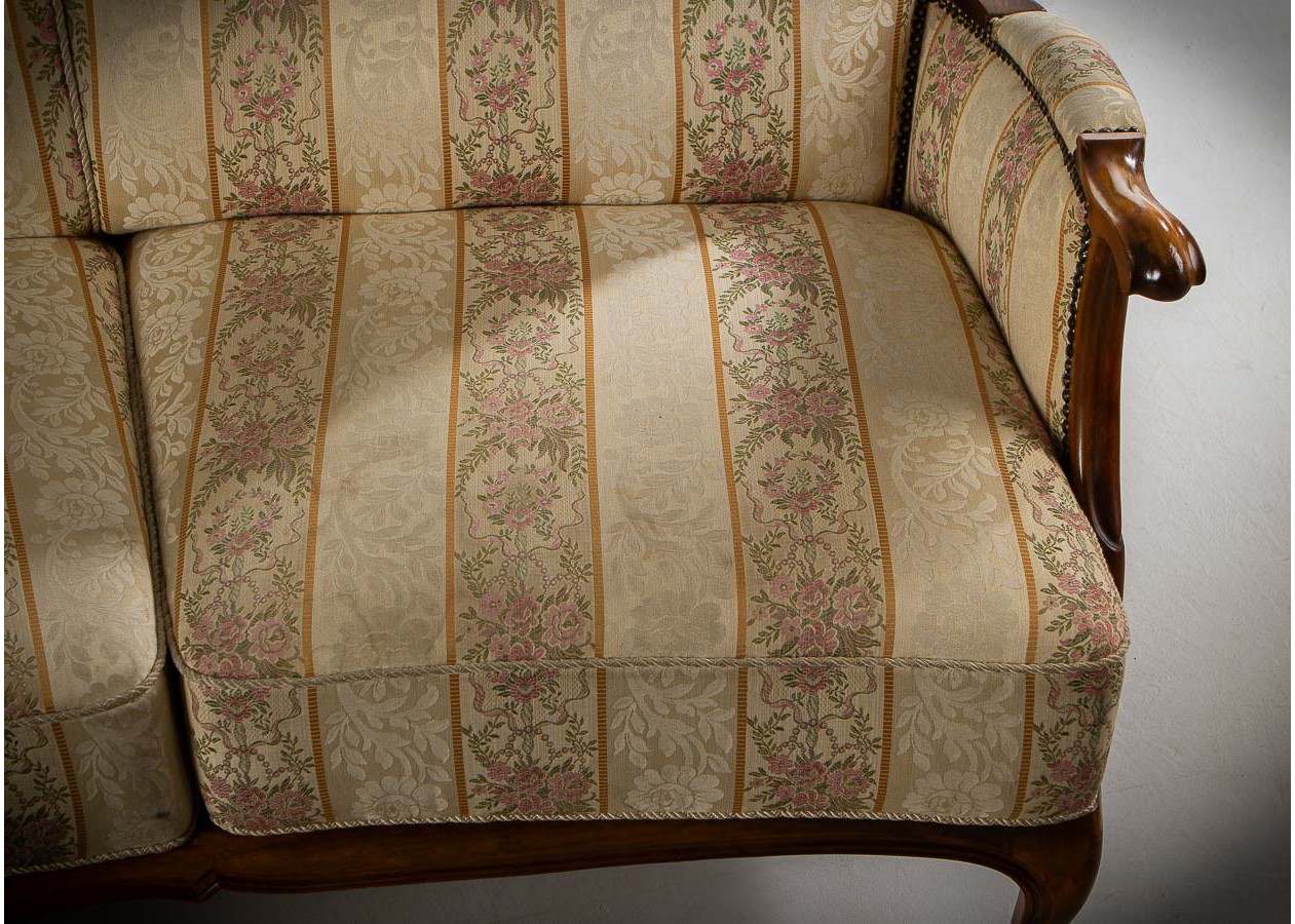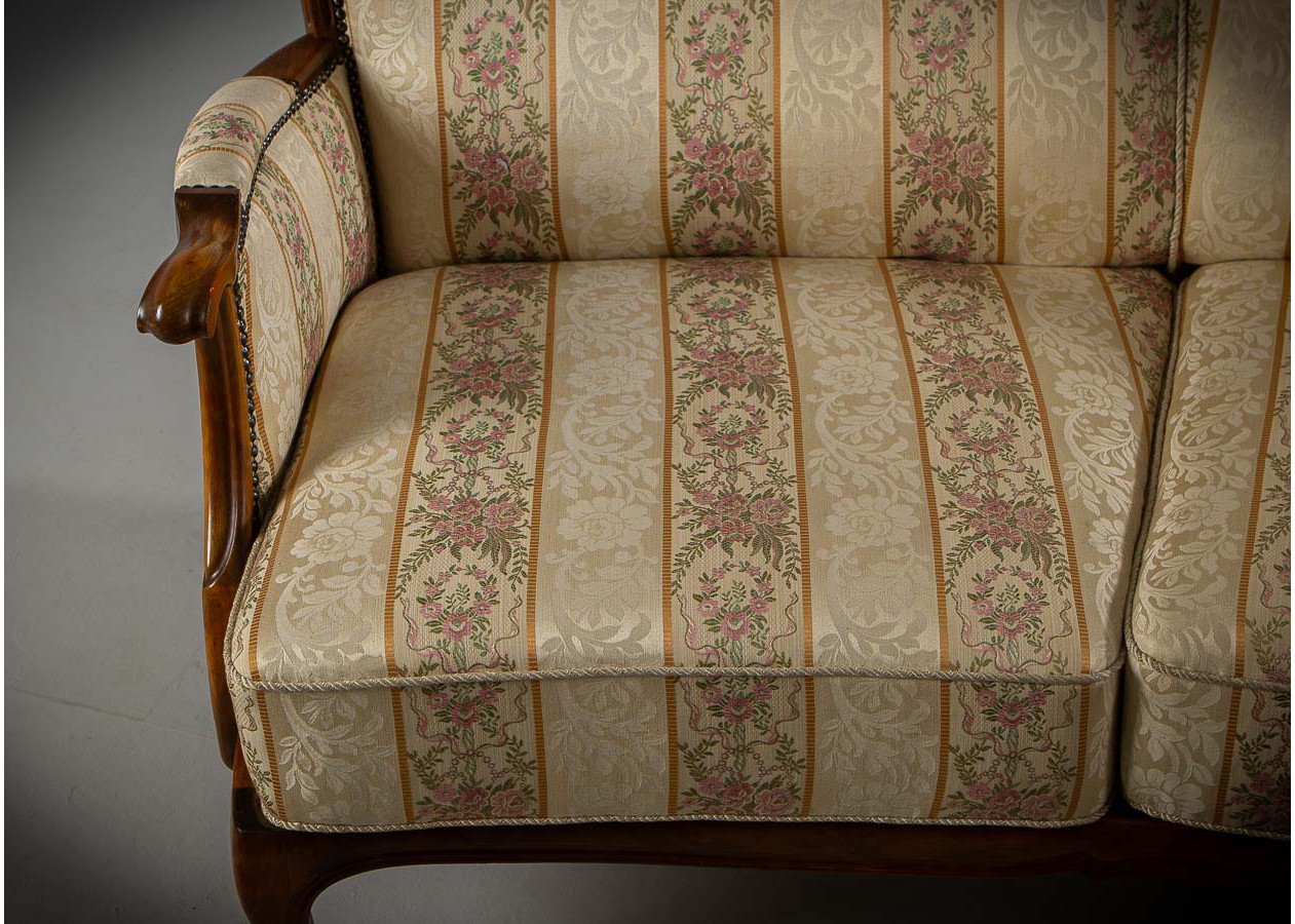 Elegantiška trijų vietų sofa su banguotu siluetu, švelniai profiliuotu mediniu karkasu ir subtiliomis rankų atramomis. Šviesi, dekoratyvinė tekstilė pabrėžia baldo lengvumą, o grakščios kojos suteikia vizualinės harmonijos. Tai baldas, kuris interjere kuria rafinuotą ramybės pojūtį ir gali tapti išraiškingu akcentu net šiuolaikiškai interpretuotoje erdvėje.