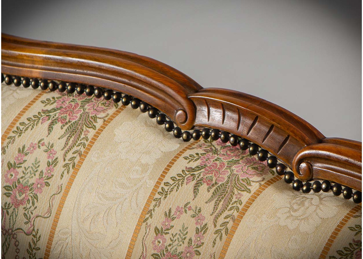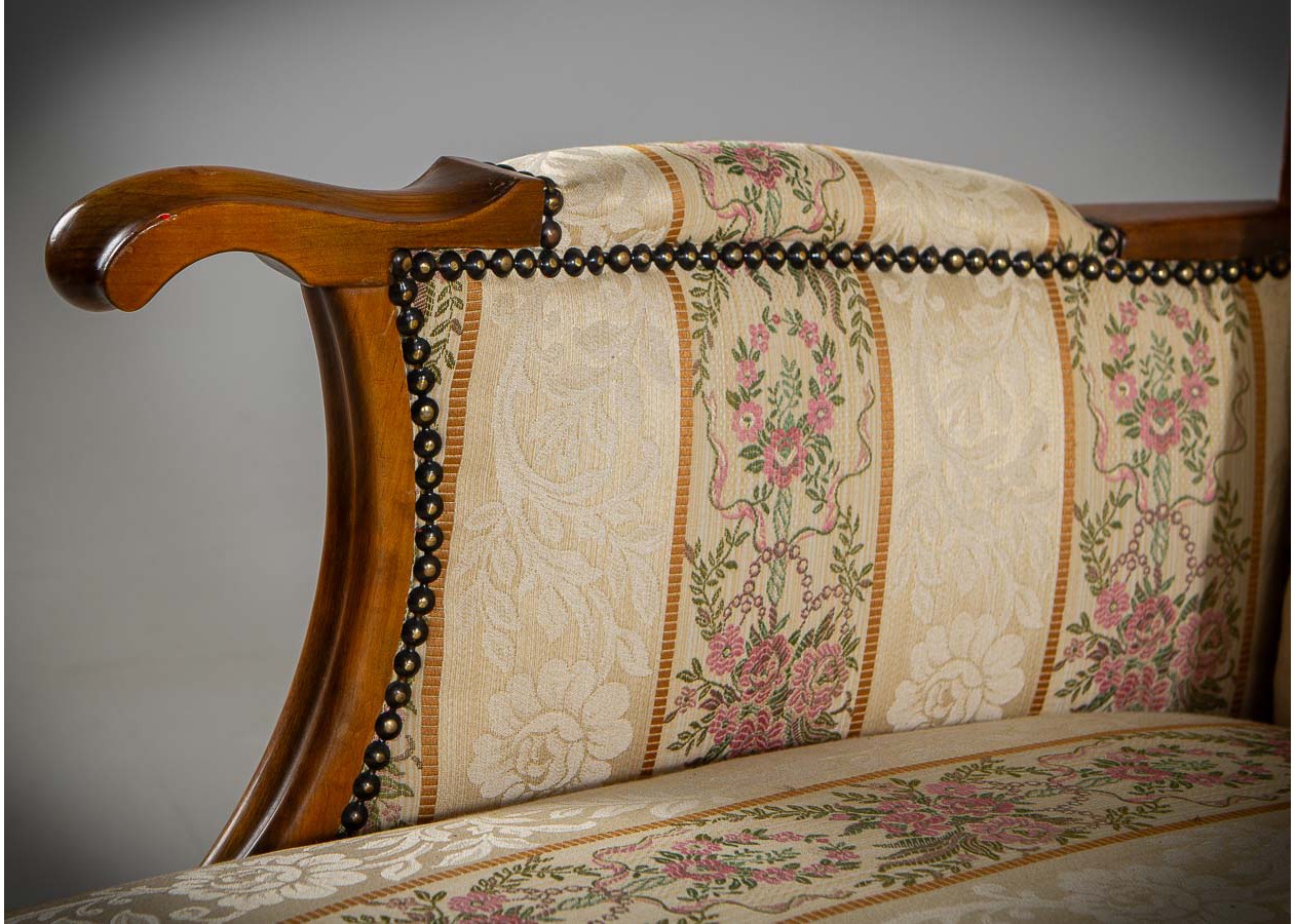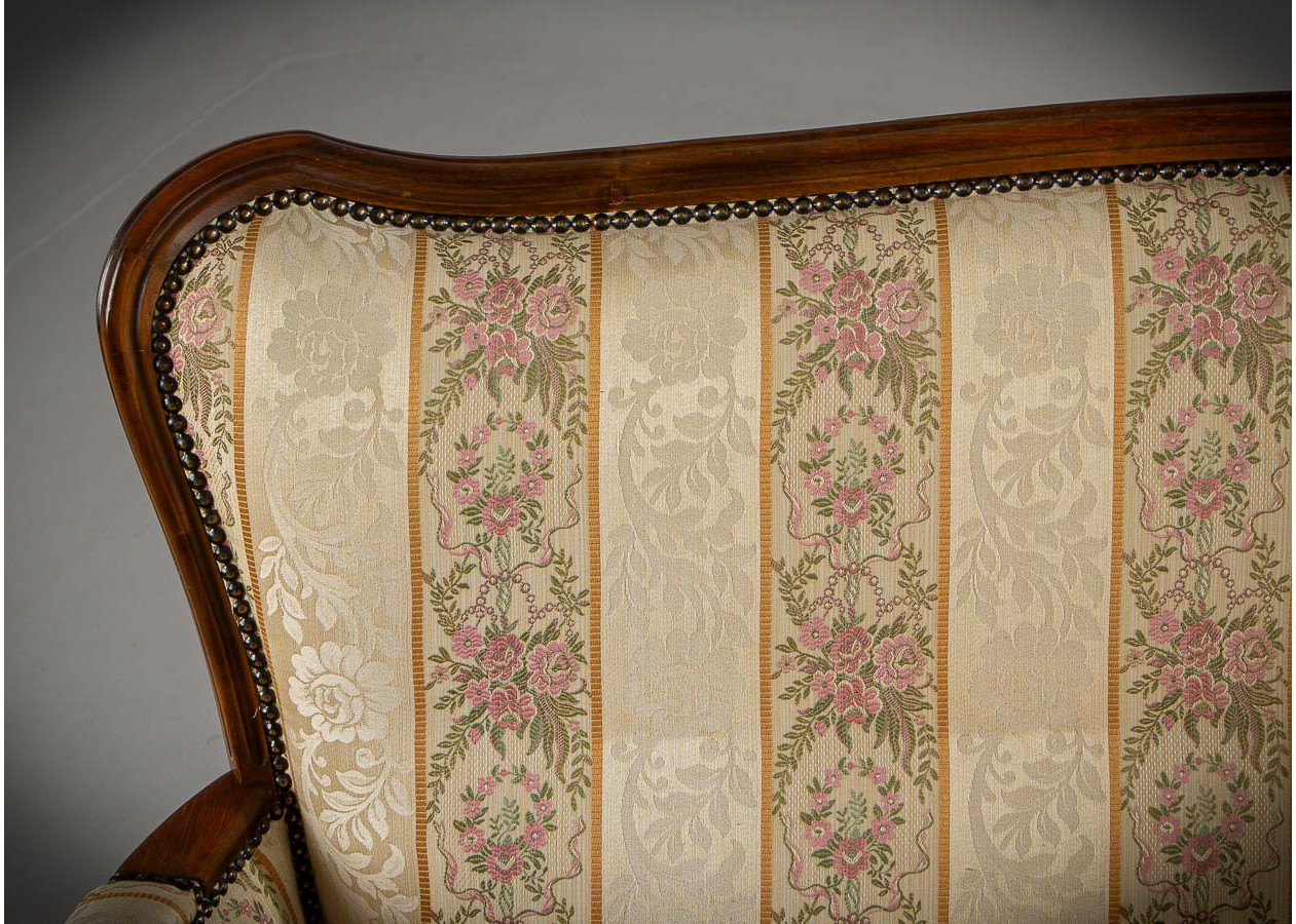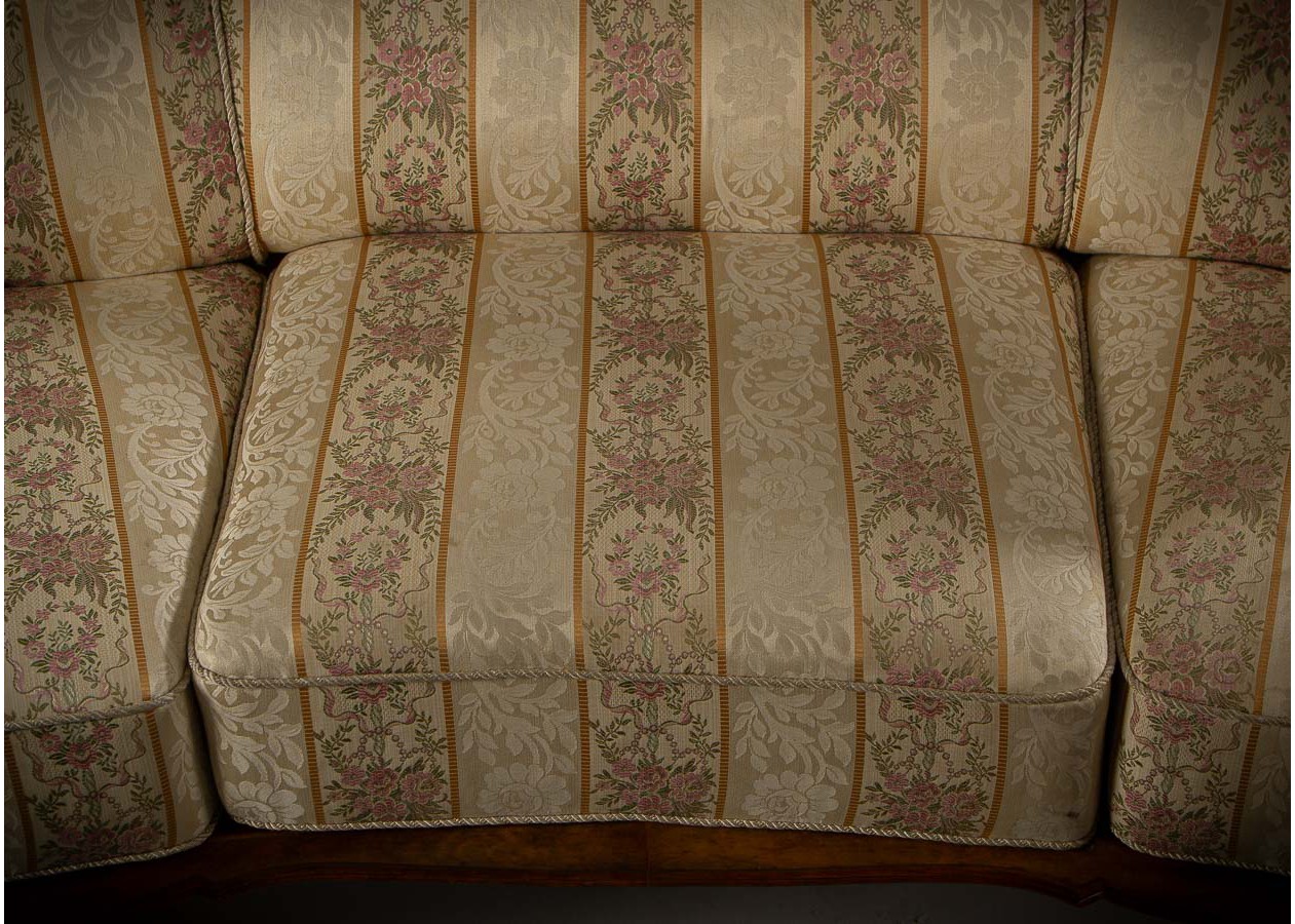 Elegantiška trijų vietų sofa su banguotu siluetu, švelniai profiliuotu mediniu karkasu ir subtiliomis rankų atramomis. Šviesi, dekoratyvinė tekstilė pabrėžia baldo lengvumą, o grakščios kojos suteikia vizualinės harmonijos. Tai baldas, kuris interjere kuria rafinuotą ramybės pojūtį ir gali tapti išraiškingu akcentu net šiuolaikiškai interpretuotoje erdvėje.