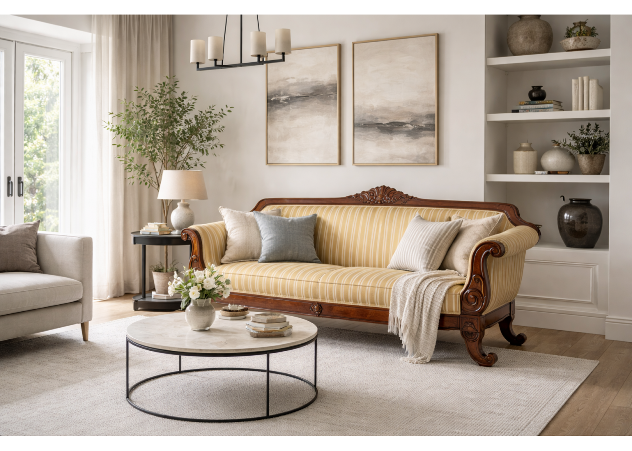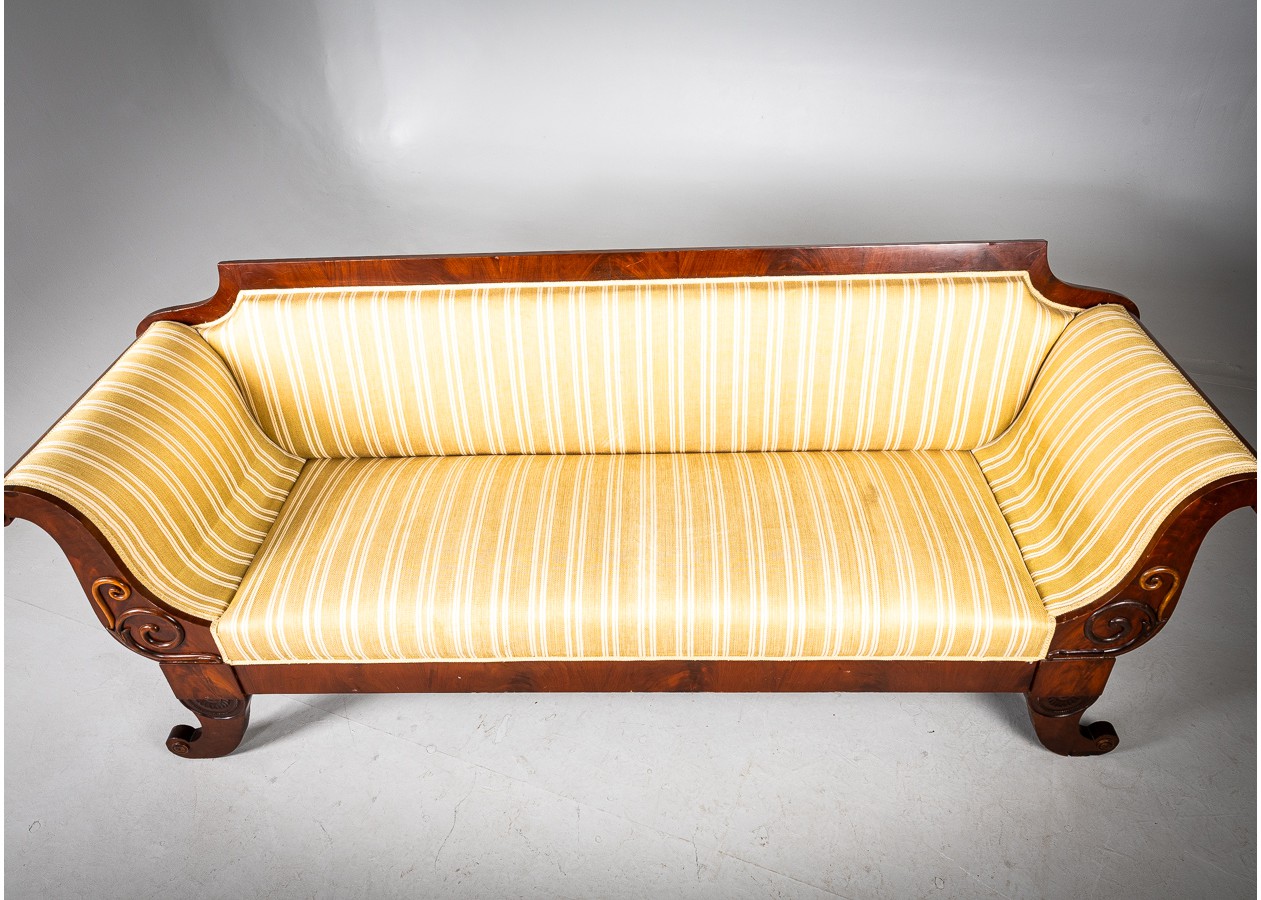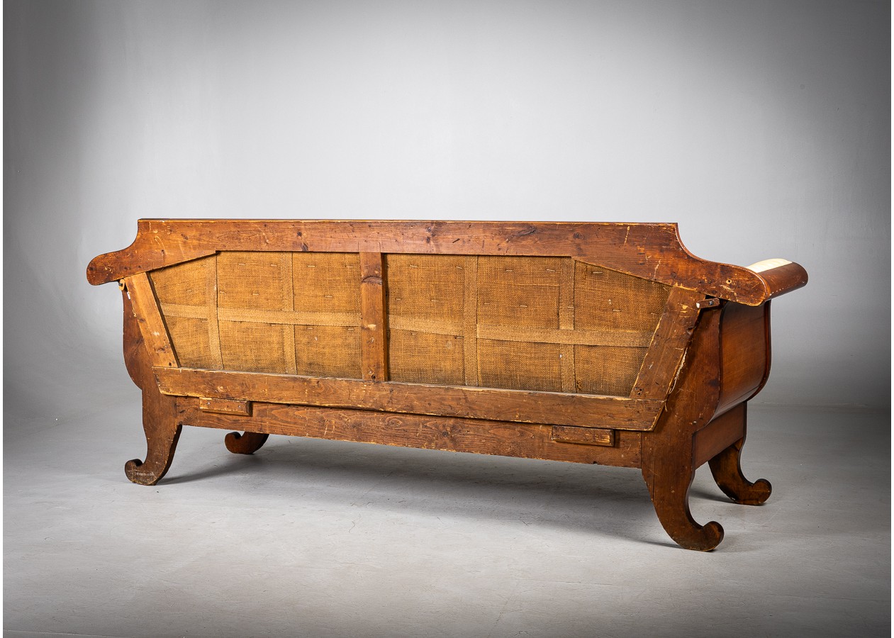 Elegantiška Biedermeier laikotarpio sofa, išsiskirianti santūriomis proporcijomis ir harmoningomis formomis. Šiltos spalvos raudonmedžio faneruotė gražiai išryškina medienos raštą, o lenkti porankiai ir subtiliai profiliuotos kojelės suteikia baldui lengvumo. Klasikinės linijos ir ramus dekoras leidžia šiai sofai tapti išskirtiniu akcentu tiek istoriniame, tiek šiuolaikiniame interjere.