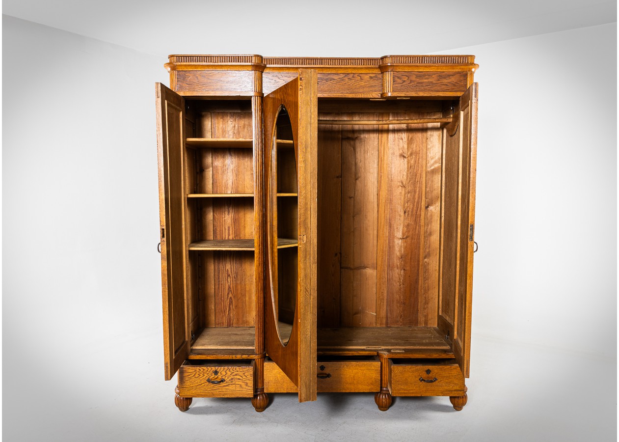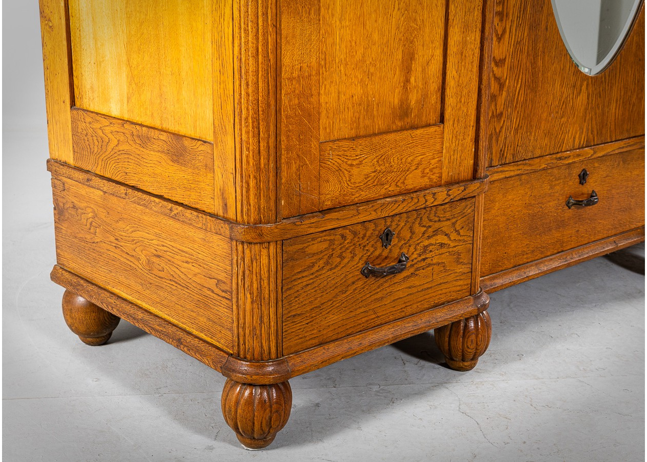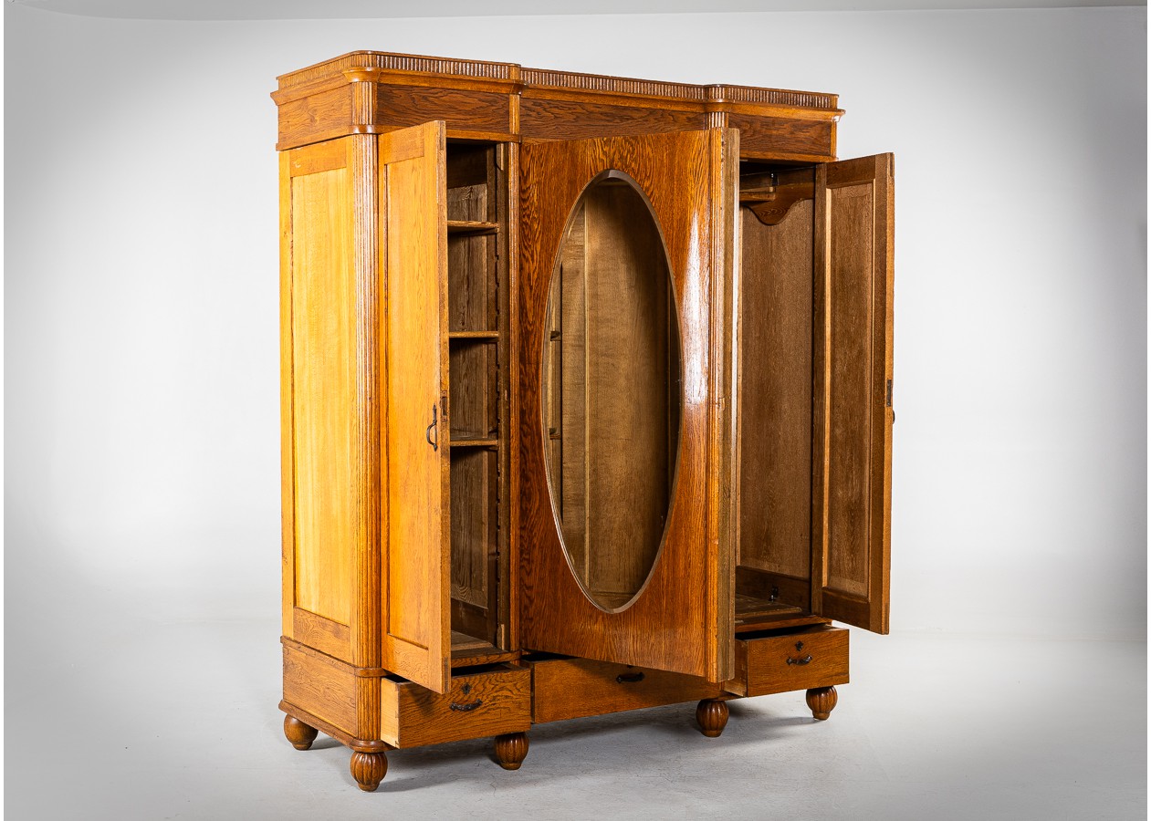 Klasikinės formos spinta, išsiskirianti gražiu natūralaus ąžuolo raštu ir harmoningomis proporcijomis. Ovalus veidrodis centrinėse duryse suteikia baldui lengvumo ir funkcionalumo kasdieniam naudojimui. Apatinėje dalyje įrengti stalčiai prideda praktiškumo ir talpumo.