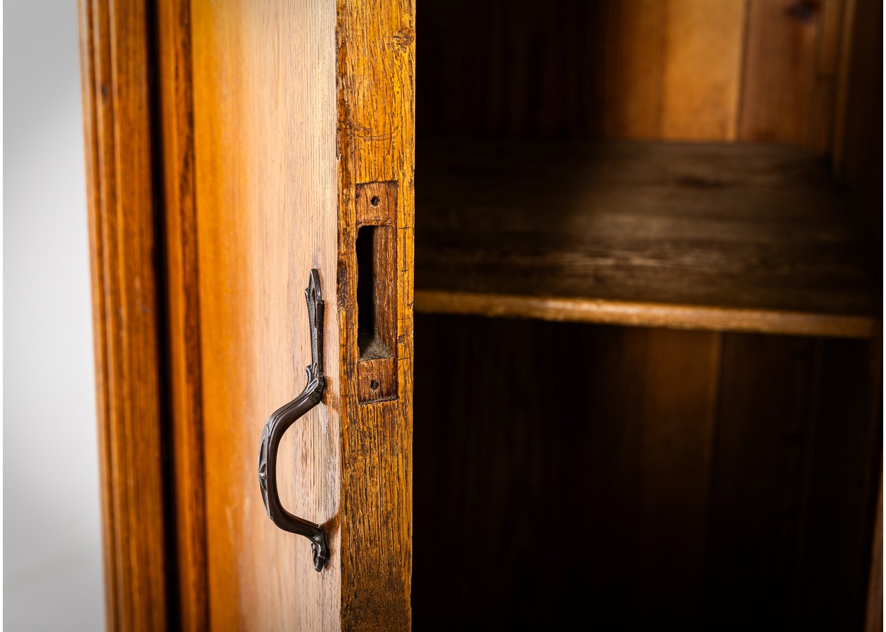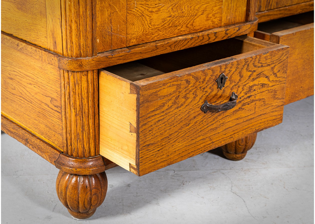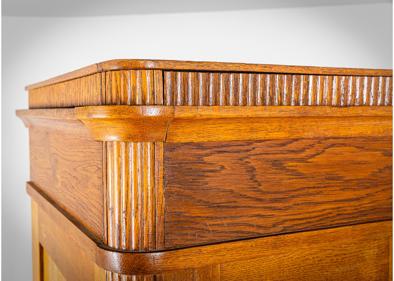 Klasikinės formos spinta, išsiskirianti gražiu natūralaus ąžuolo raštu ir harmoningomis proporcijomis. Ovalus veidrodis centrinėse duryse suteikia baldui lengvumo ir funkcionalumo kasdieniam naudojimui. Apatinėje dalyje įrengti stalčiai prideda praktiškumo ir talpumo.