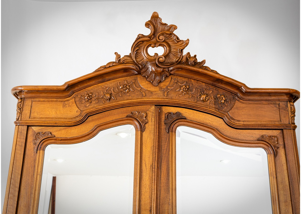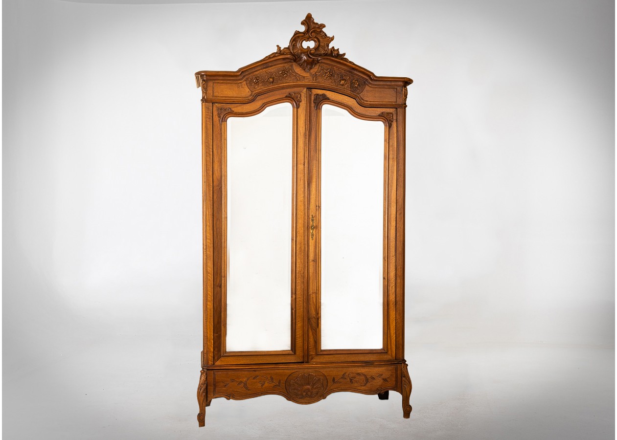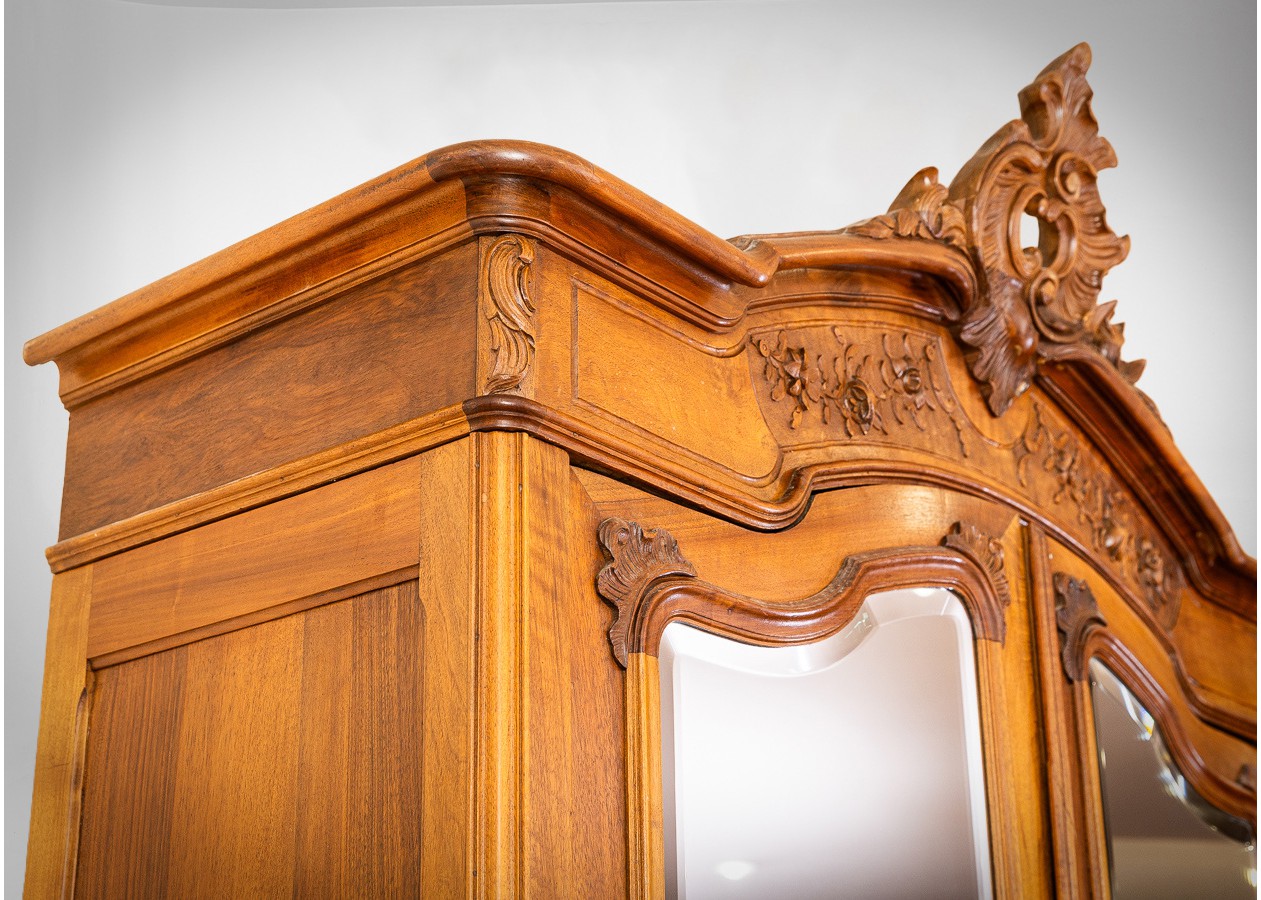 Dekoratyvi spinta su veidrodinėmis durimis, pasižyminti grakščiomis rokoko stiliaus linijomis. Viršutinėje dalyje išraižyta karūna ir augaliniai motyvai, o apatinę puošia subtilus kriauklės ornamentas. Šiltas riešutmedžio paviršius suteikia baldui elegancijos, o veidrodžiai pabrėžia jo lengvą ir reprezentatyvų charakterį.