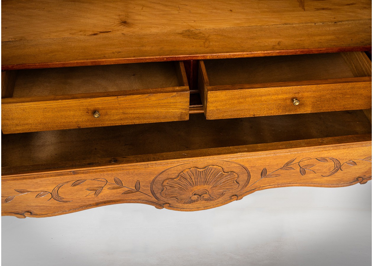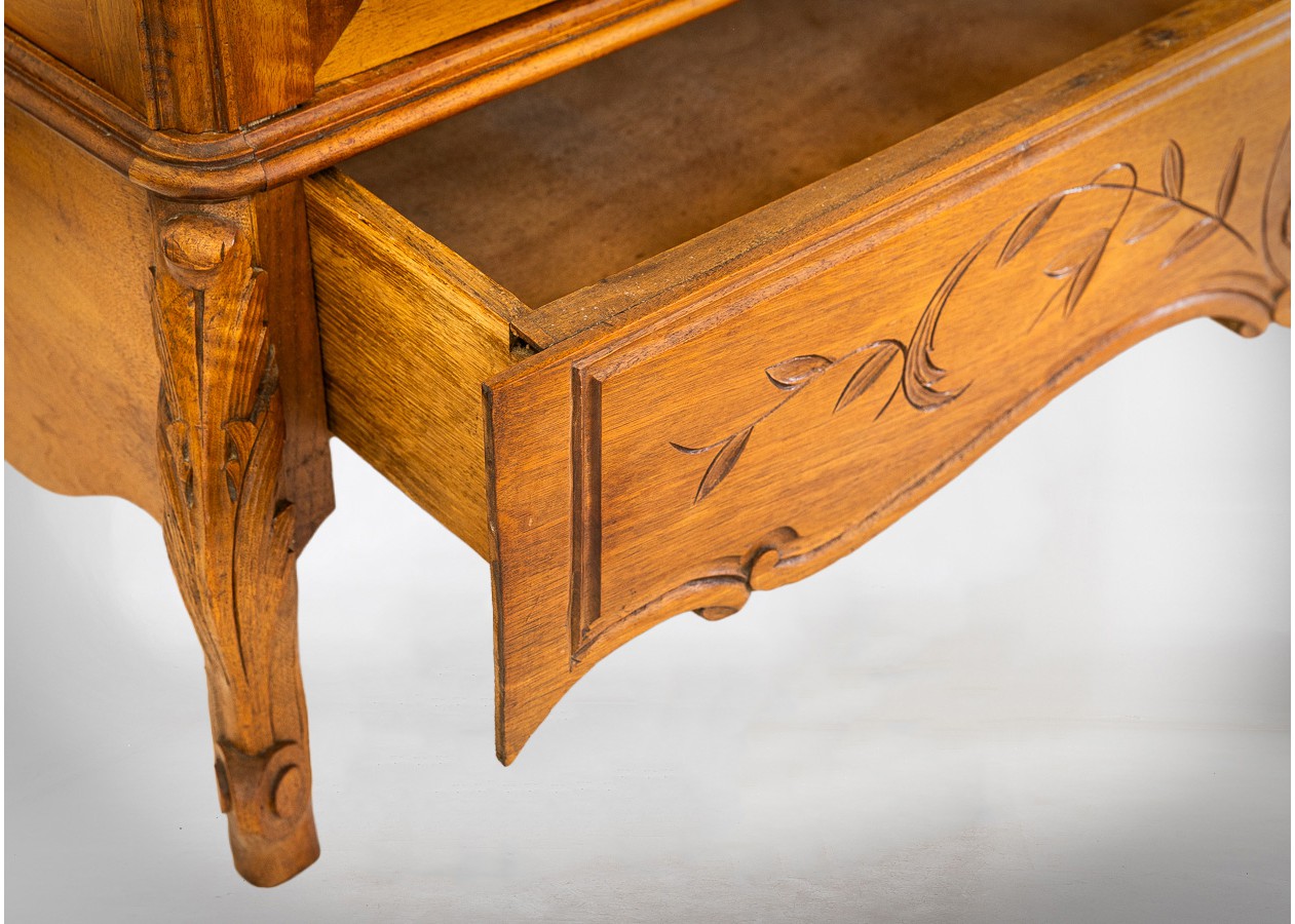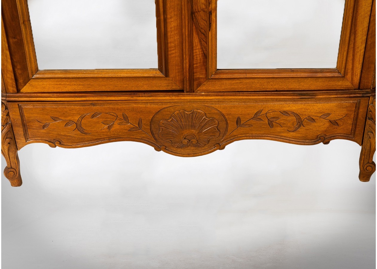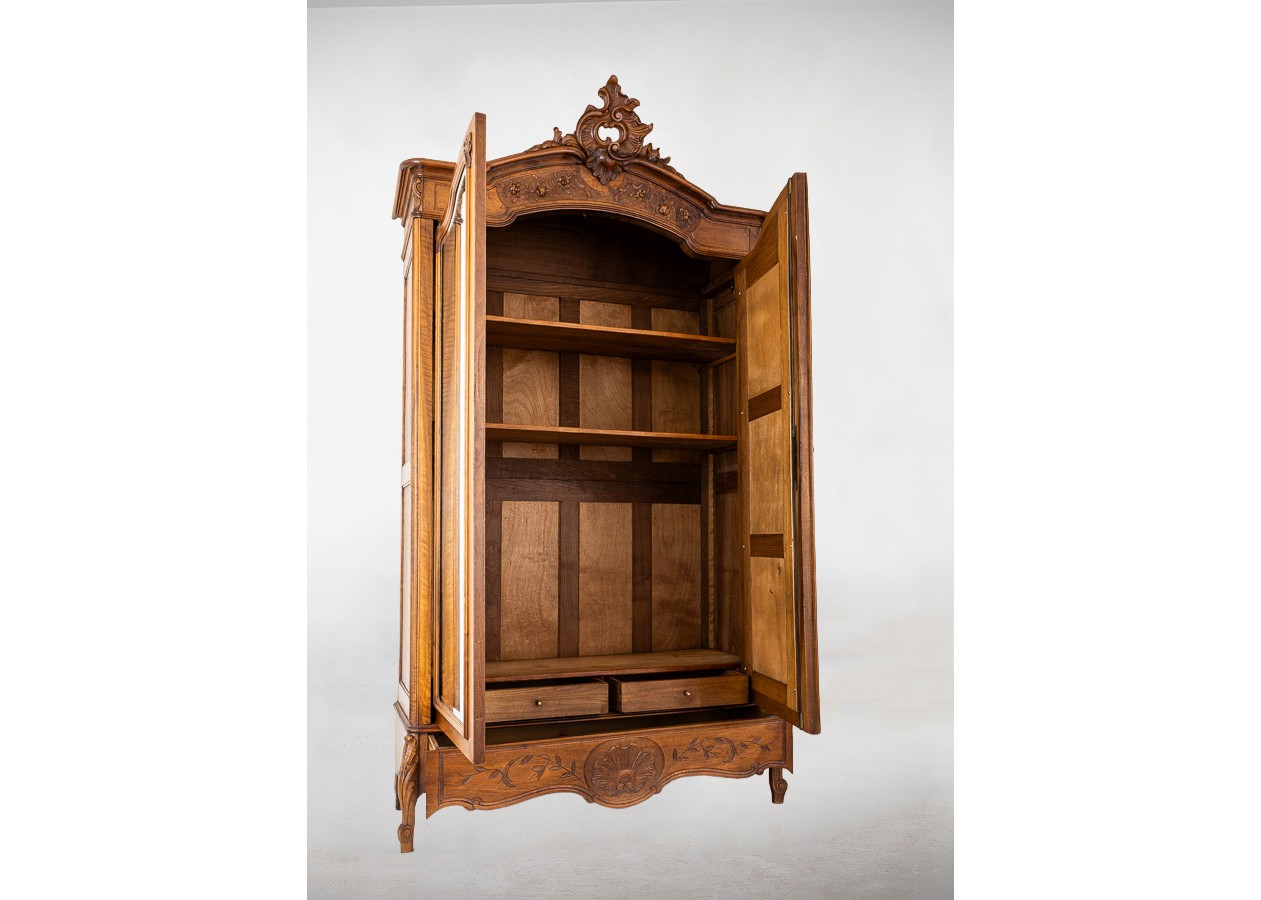 Dekoratyvi spinta su veidrodinėmis durimis, pasižyminti grakščiomis rokoko stiliaus linijomis. Viršutinėje dalyje išraižyta karūna ir augaliniai motyvai, o apatinę puošia subtilus kriauklės ornamentas. Šiltas riešutmedžio paviršius suteikia baldui elegancijos, o veidrodžiai pabrėžia jo lengvą ir reprezentatyvų charakterį.
