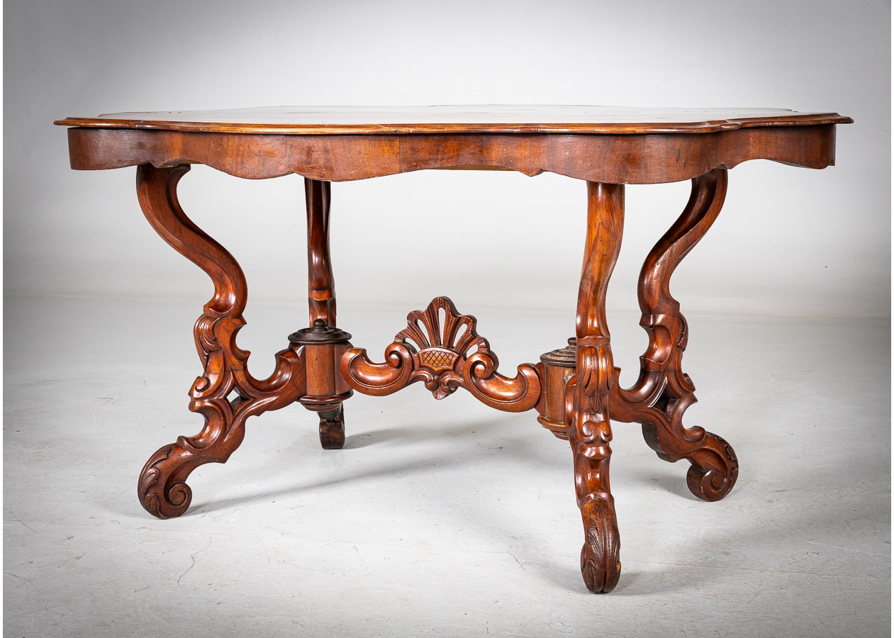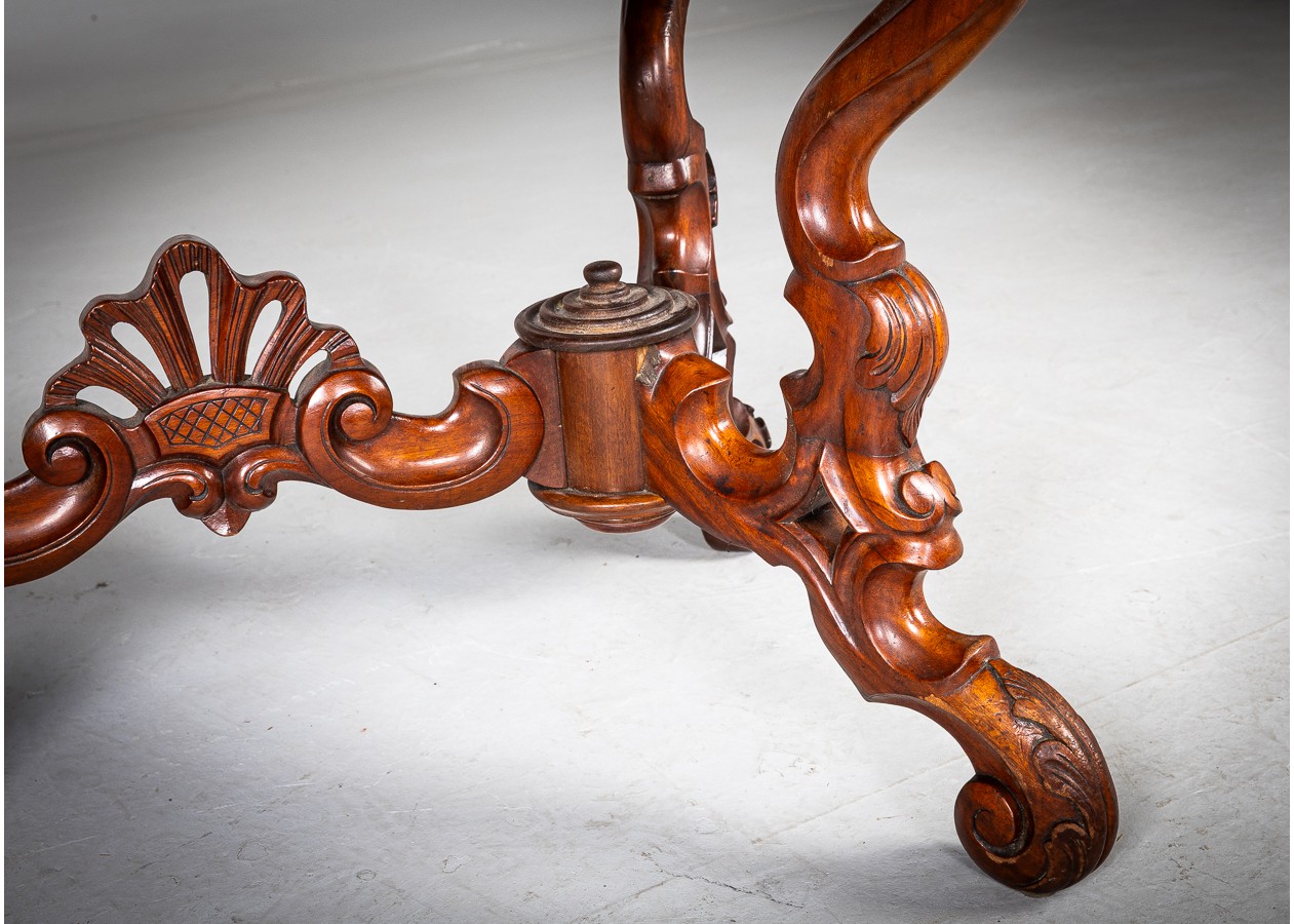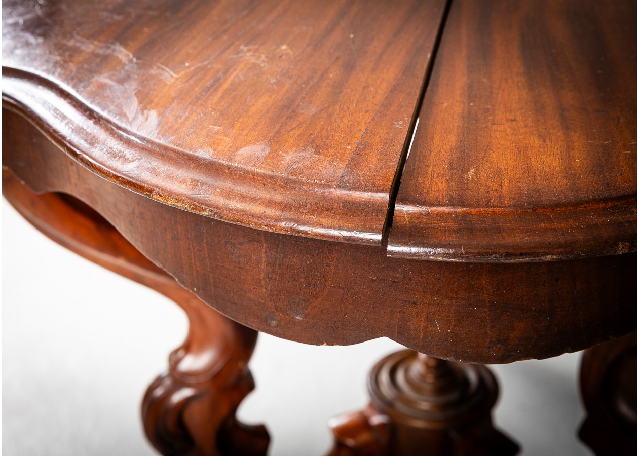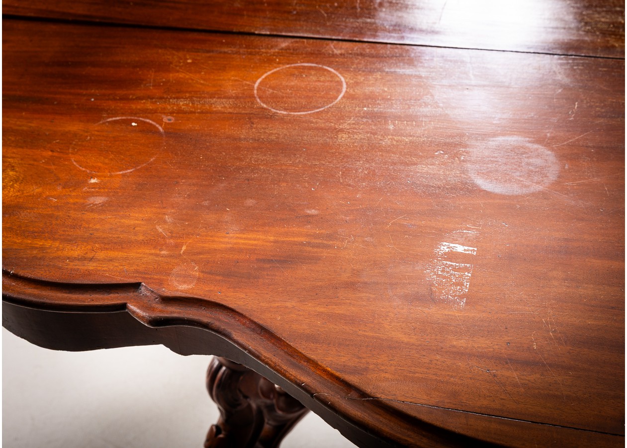 Rafinuoto silueto stalas iš raudonmedžio, atspindintis XIX a. dekoratyvinės baldininkystės tradicijas. Banguotas stalviršis ir elegantiškai išlenktos, gausiai profiliuotos kojelės sukuria lengvumo ir prabangos įspūdį. Subtilūs drožiniai centrinėje konstrukcijoje suteikia baldui charakterio, todėl jis gali tapti išskirtiniu akcentu svetainėje ar reprezentacinėje erdvėje.