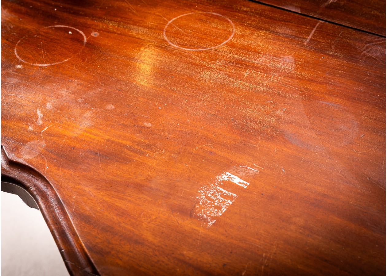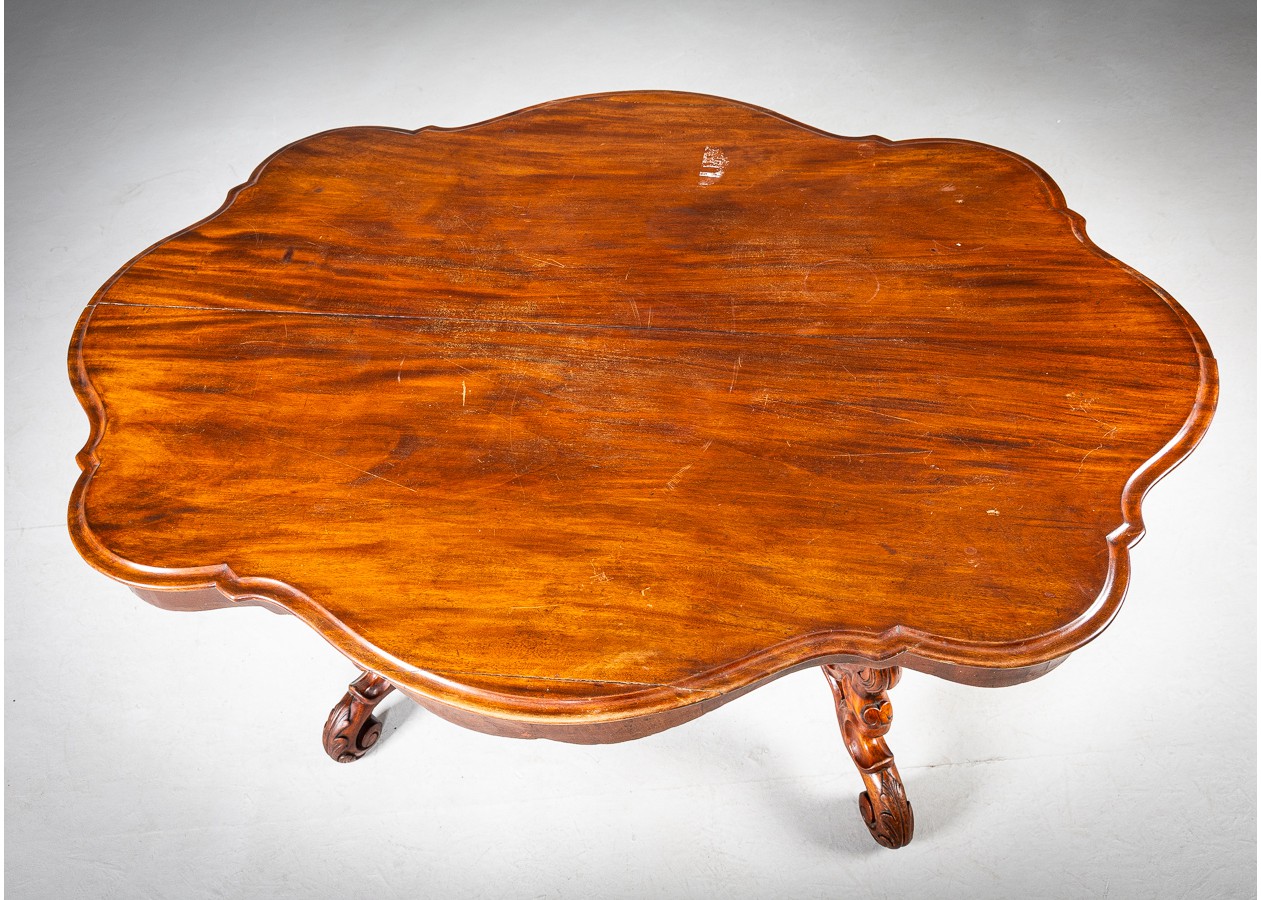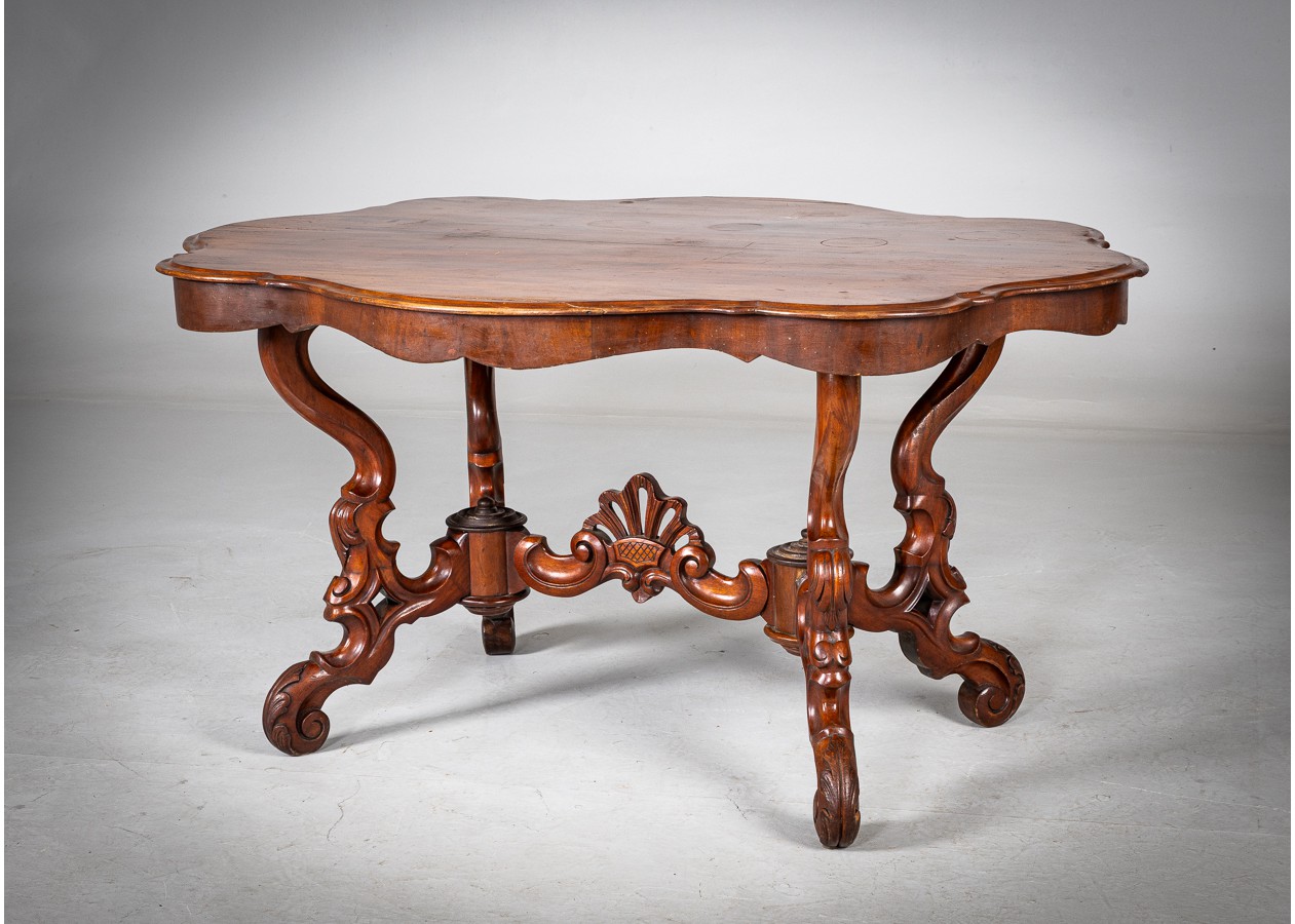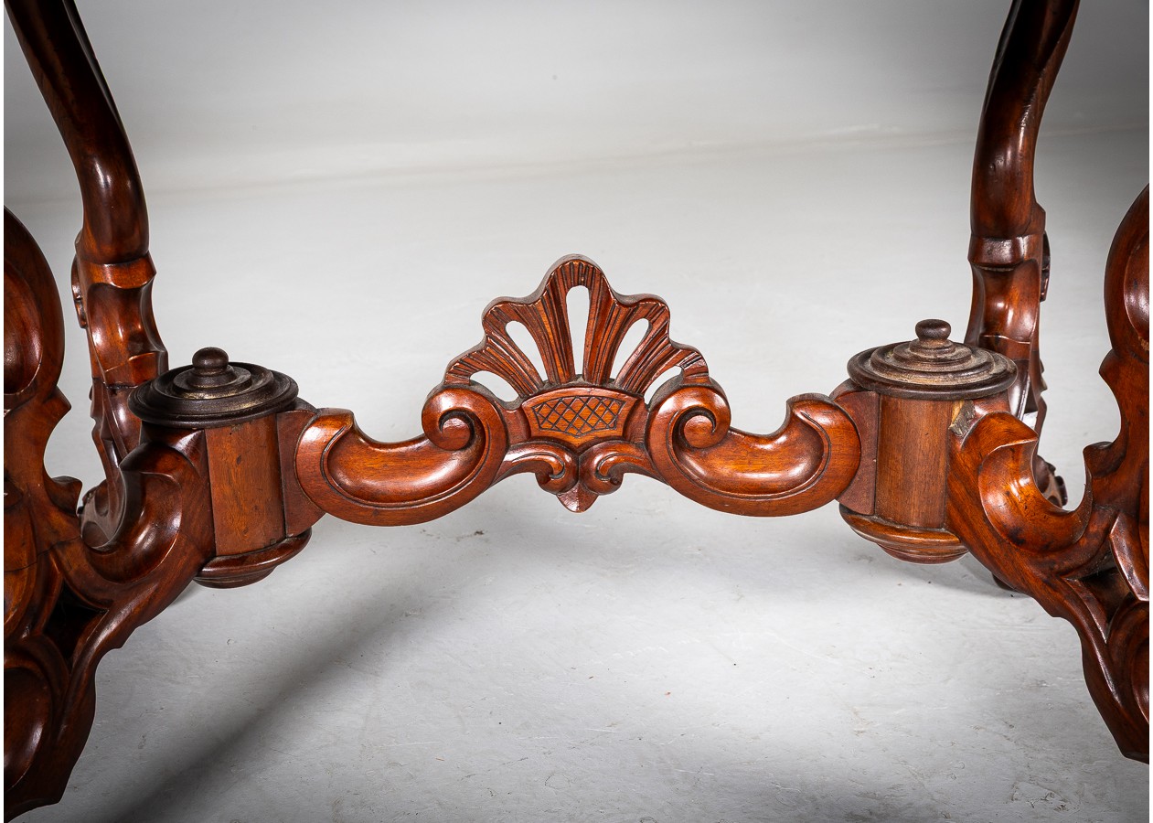 Rafinuoto silueto stalas iš raudonmedžio, atspindintis XIX a. dekoratyvinės baldininkystės tradicijas. Banguotas stalviršis ir elegantiškai išlenktos, gausiai profiliuotos kojelės sukuria lengvumo ir prabangos įspūdį. Subtilūs drožiniai centrinėje konstrukcijoje suteikia baldui charakterio, todėl jis gali tapti išskirtiniu akcentu svetainėje ar reprezentacinėje erdvėje.