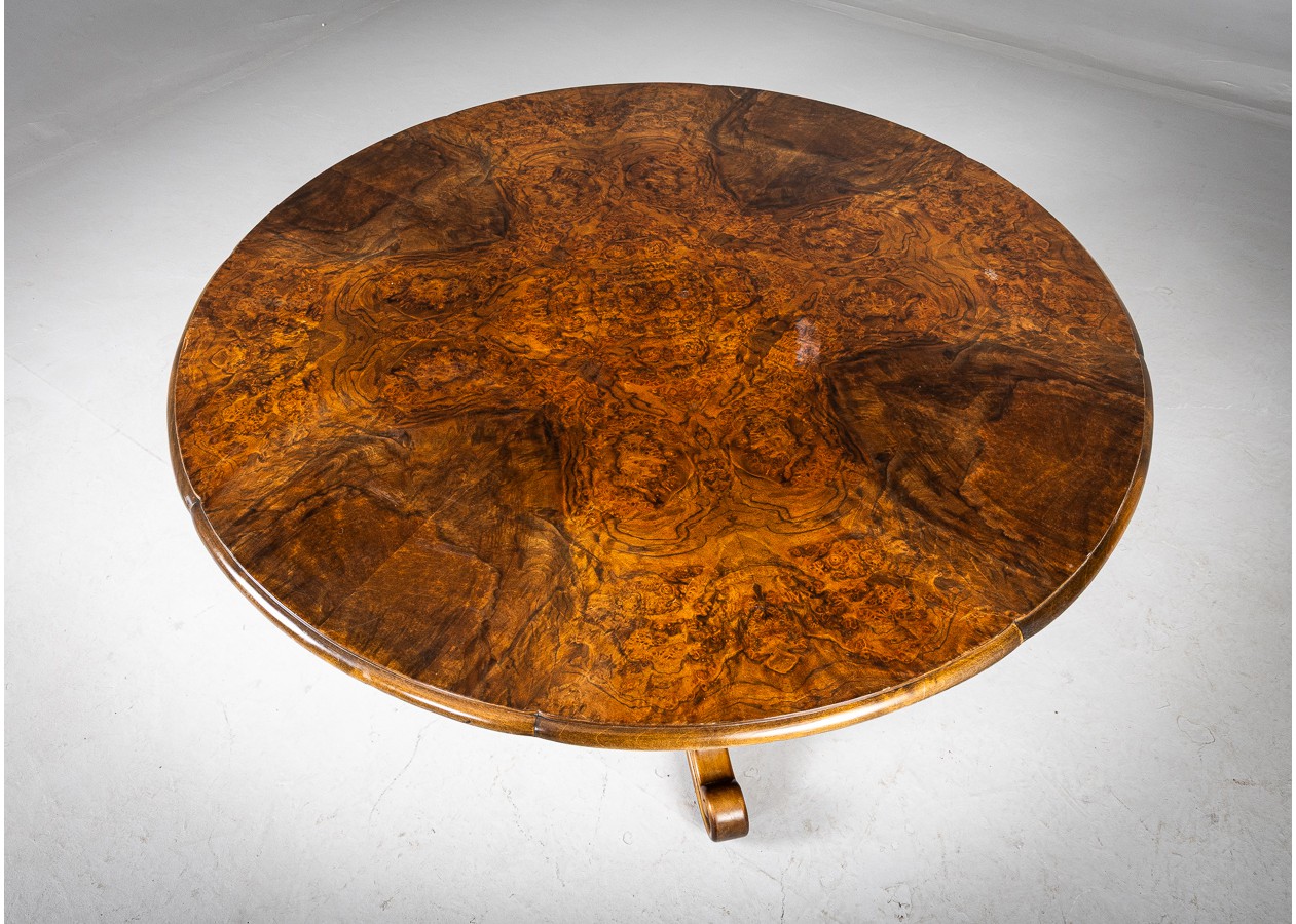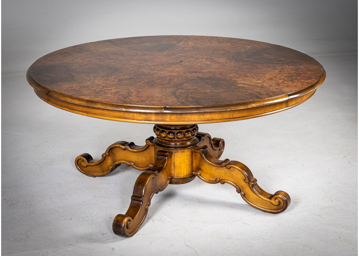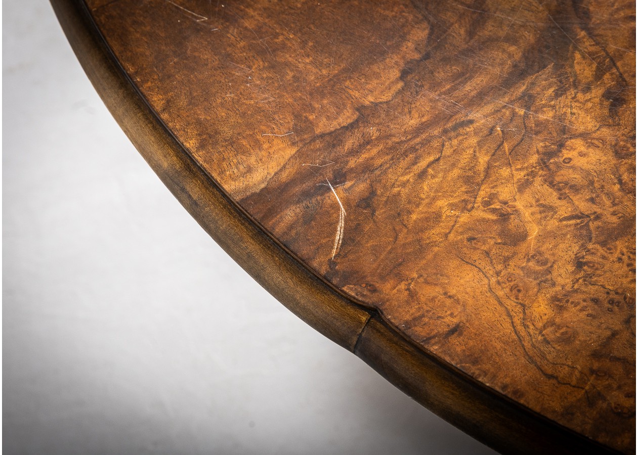 Elegantiškas apvalus staliukas su įspūdingu riešutmedžio šaknies faneruotės stalviršiu, kurio gyvas medienos raštas sukuria dekoratyvų ir prabangų paviršių. Centrinė kolonos formos atrama su subtilia profiliuote pereina į keturias grakščiai išlenktas kojeles. Subalansuotos proporcijos ir šilta medienos spalva leidžia baldui tapti išraiškingu akcentu svetainėje ar poilsio erdvėje.