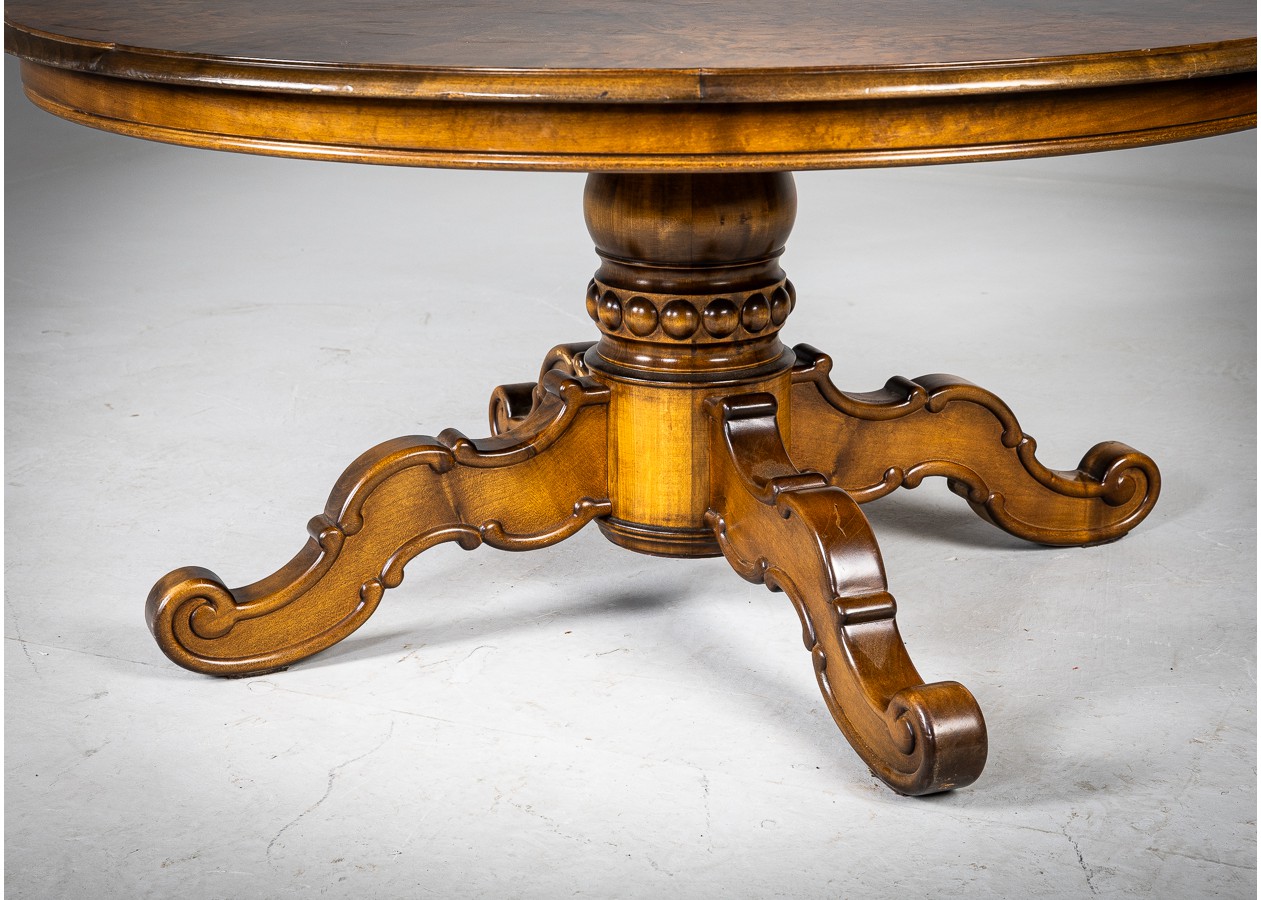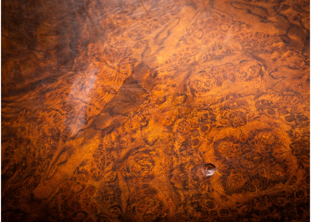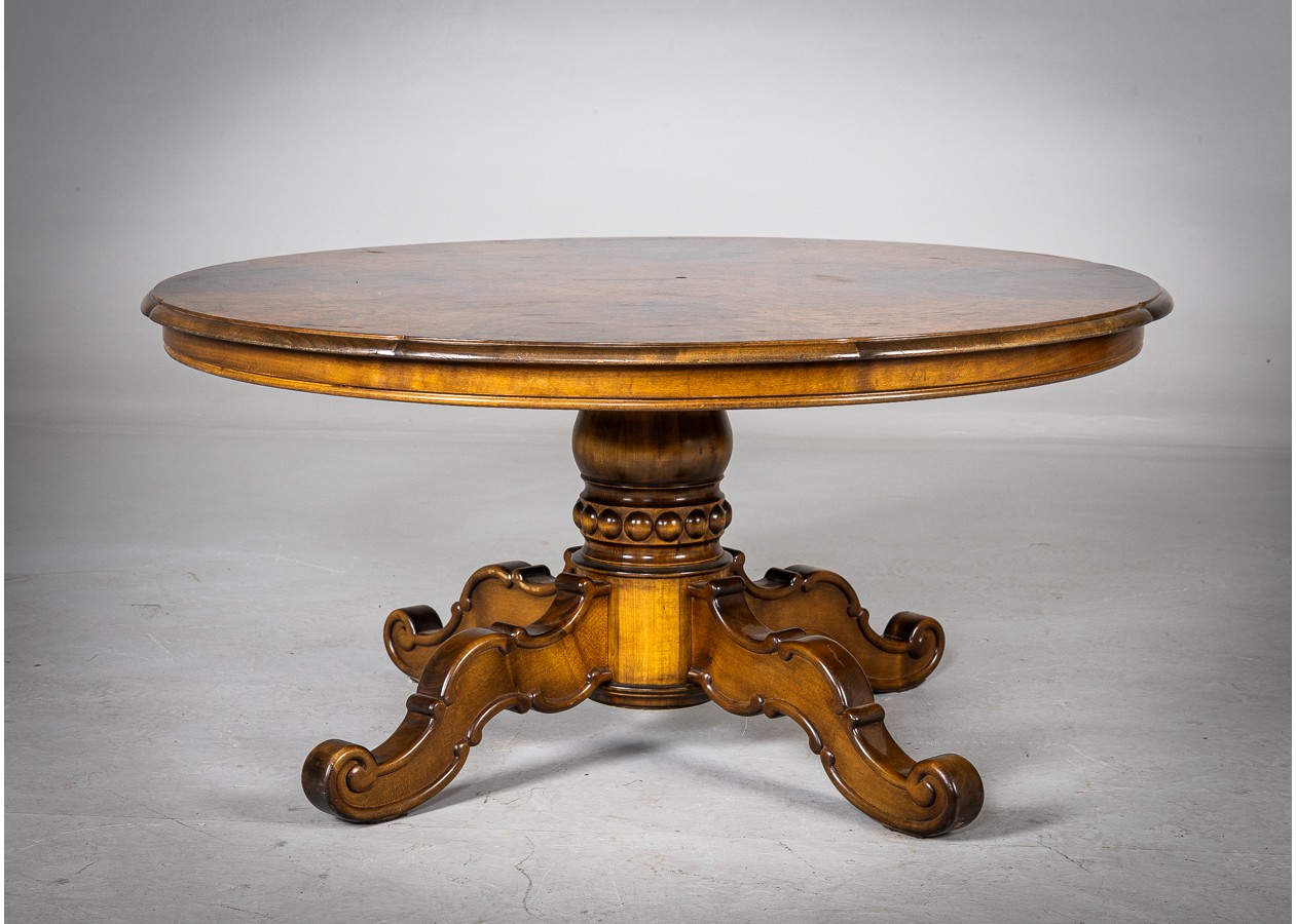 Elegantiškas apvalus staliukas su įspūdingu riešutmedžio šaknies faneruotės stalviršiu, kurio gyvas medienos raštas sukuria dekoratyvų ir prabangų paviršių. Centrinė kolonos formos atrama su subtilia profiliuote pereina į keturias grakščiai išlenktas kojeles. Subalansuotos proporcijos ir šilta medienos spalva leidžia baldui tapti išraiškingu akcentu svetainėje ar poilsio erdvėje.