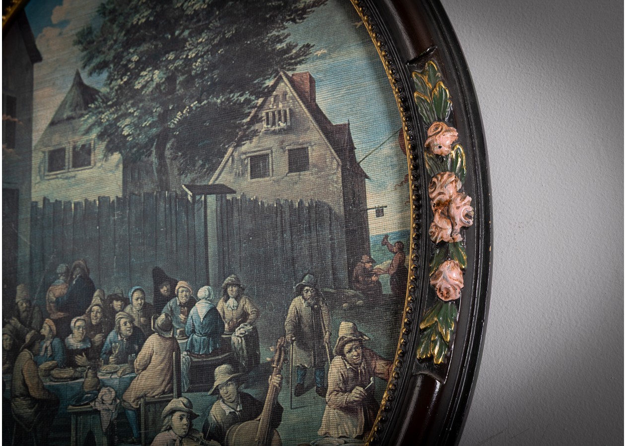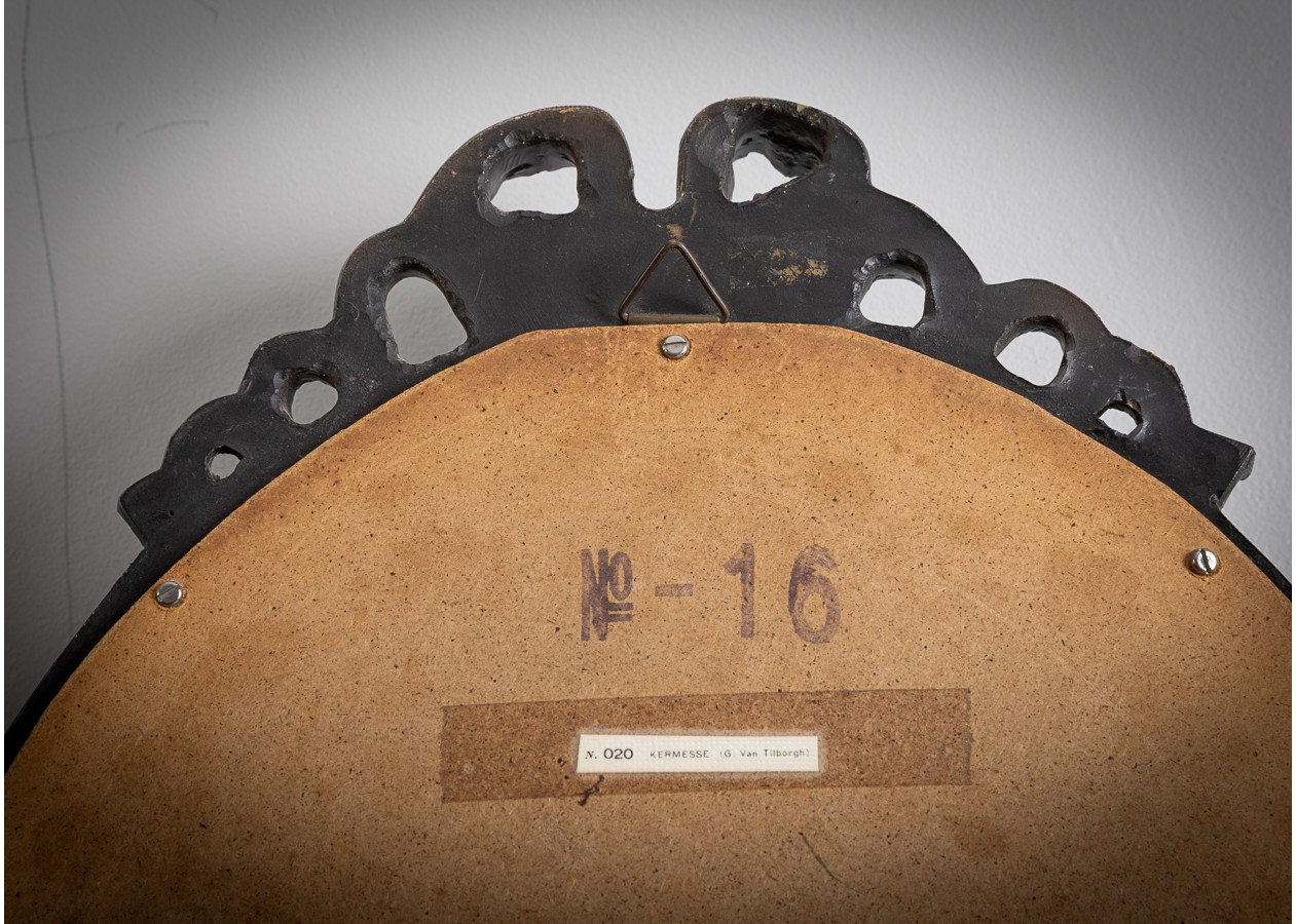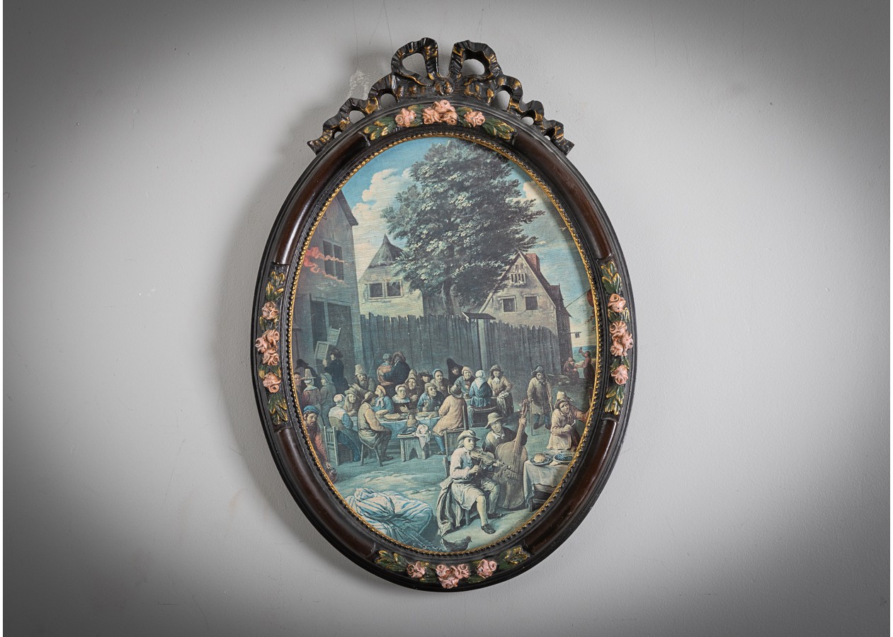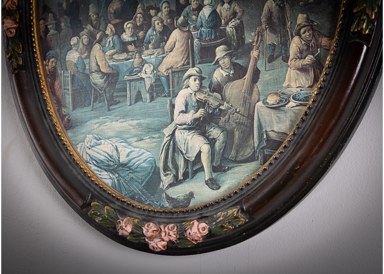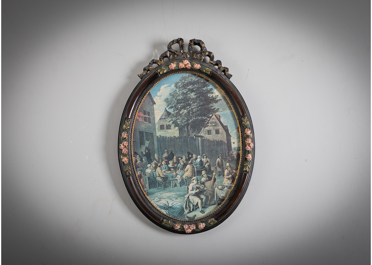 Ovalus, raižytas ir polichromuotas medinis rėmas su reljefinėmis rožėmis apglėbia spalvotą reprodukciją pagal flamandišką „Kermesse“ (G. van Tilborgh). Patinuotas medis, ažūrinė karūna viršuje ir subtilus aukso akcentas kuria barokinę nuotaiką. Tai XIX a. pabaigos–XX a. pradžios dirbtuvės darbas, labiau vertinamas kaip dekoratyvus rėmas, suteikiantis šilumos, mastelio ir istorinio charakterio.