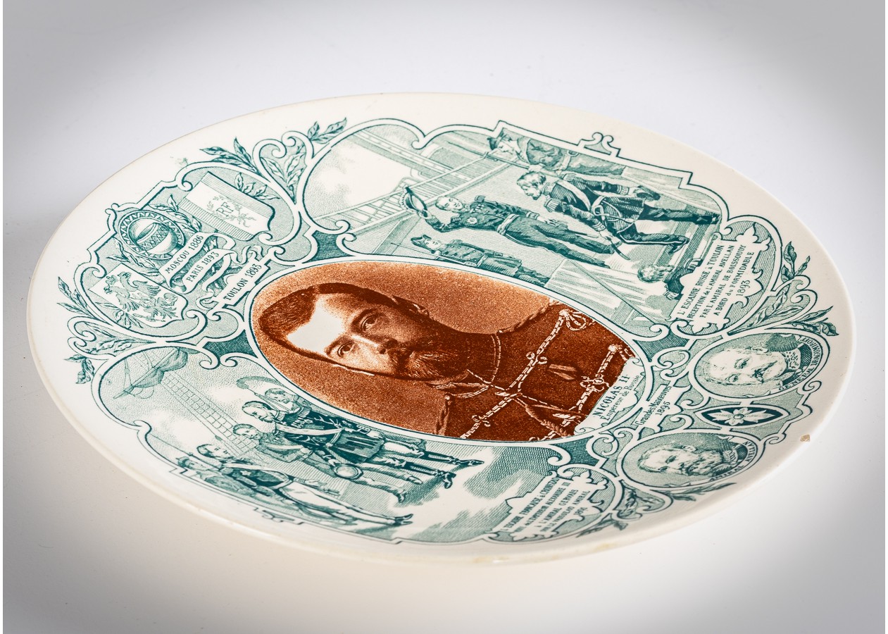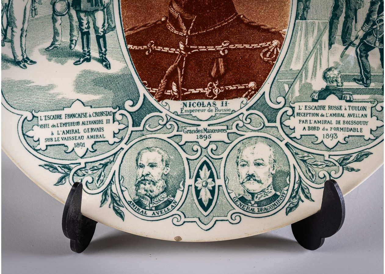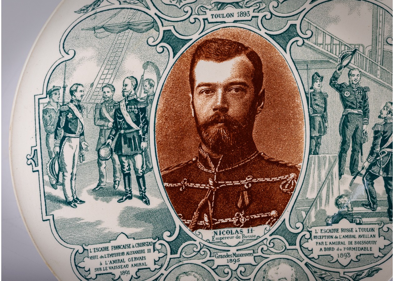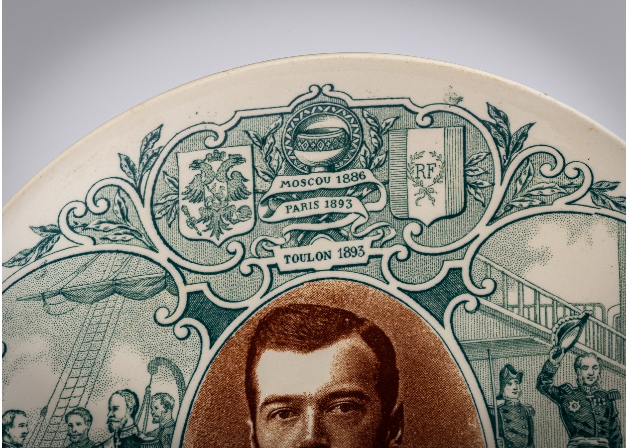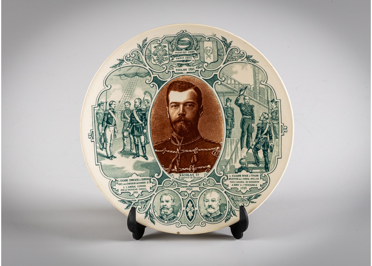 Istorinė kolekcinė lėkštė su caro Nikolajaus II atvaizdu, dekoruota scenomis iš Prancūzijos ir Rusijos karinių bei diplomatinių susitikimų. Heraldiniai simboliai ir datos atspindi laikotarpį, kai buvo stiprinami abiejų valstybių politiniai ryšiai.