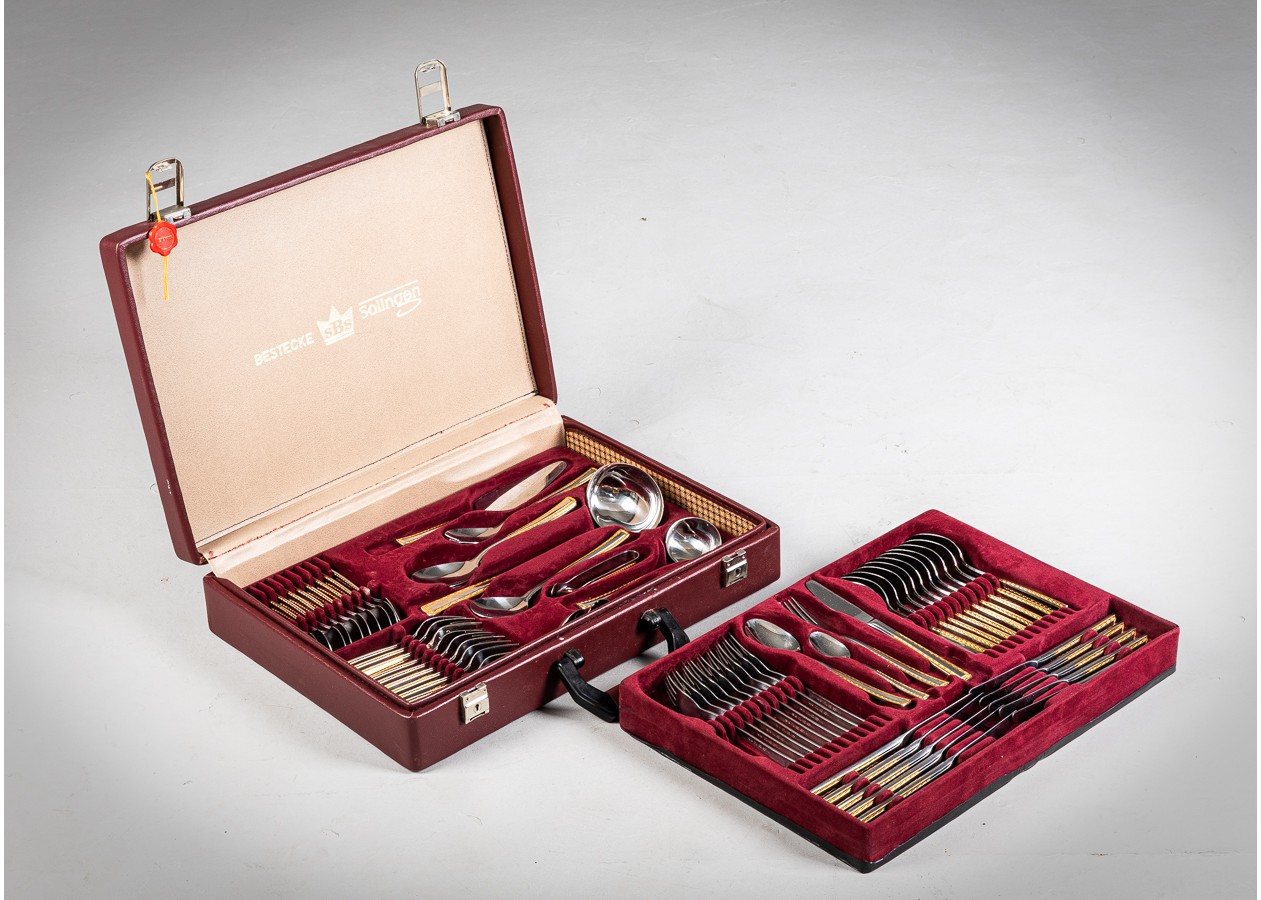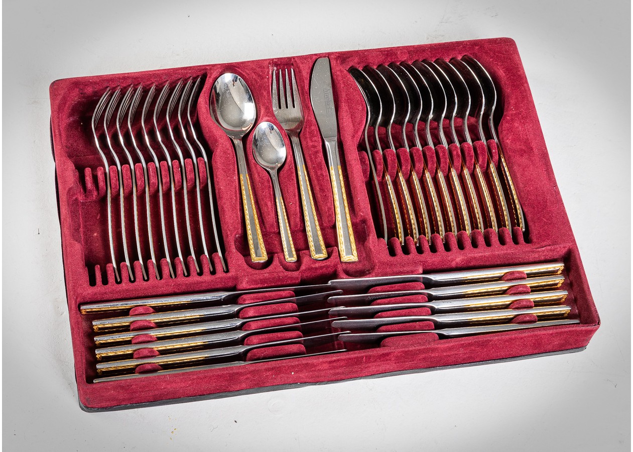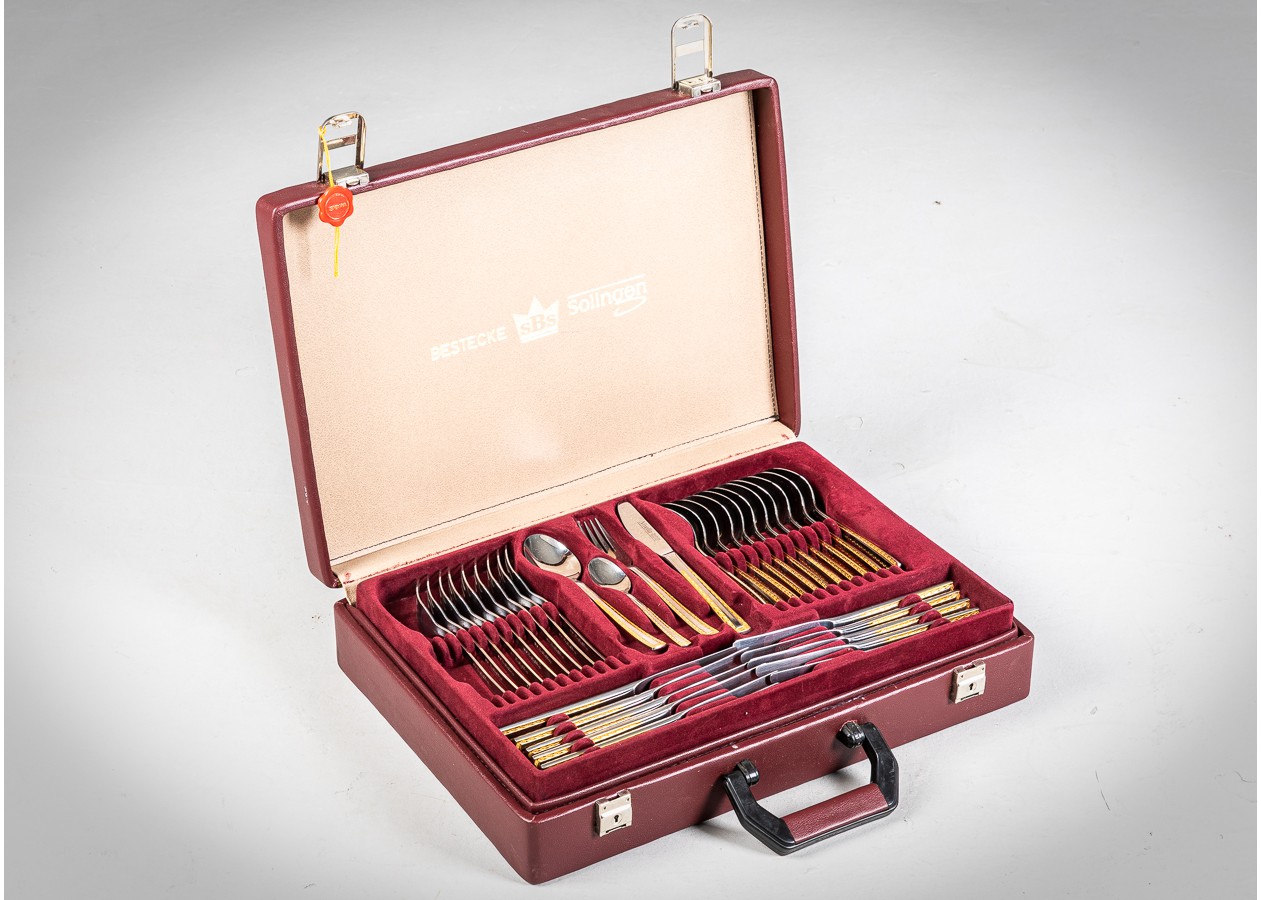 Stilingas Solingeno meistrystę atspindintis stalo įrankių rinkinys, išsiskiriantis tvarkingu išdėstymu ir elegantišku dizainu. Blizgus nerūdijantis plienas bei dekoratyviniai aukso spalvos elementai rankenose sukuria subtilų prabangos įspūdį. Rinkinys idealiai tinka reprezentaciniam stalui ir gali tapti puikia dovana ar išskirtine detale namų valgomojo erdvėje.