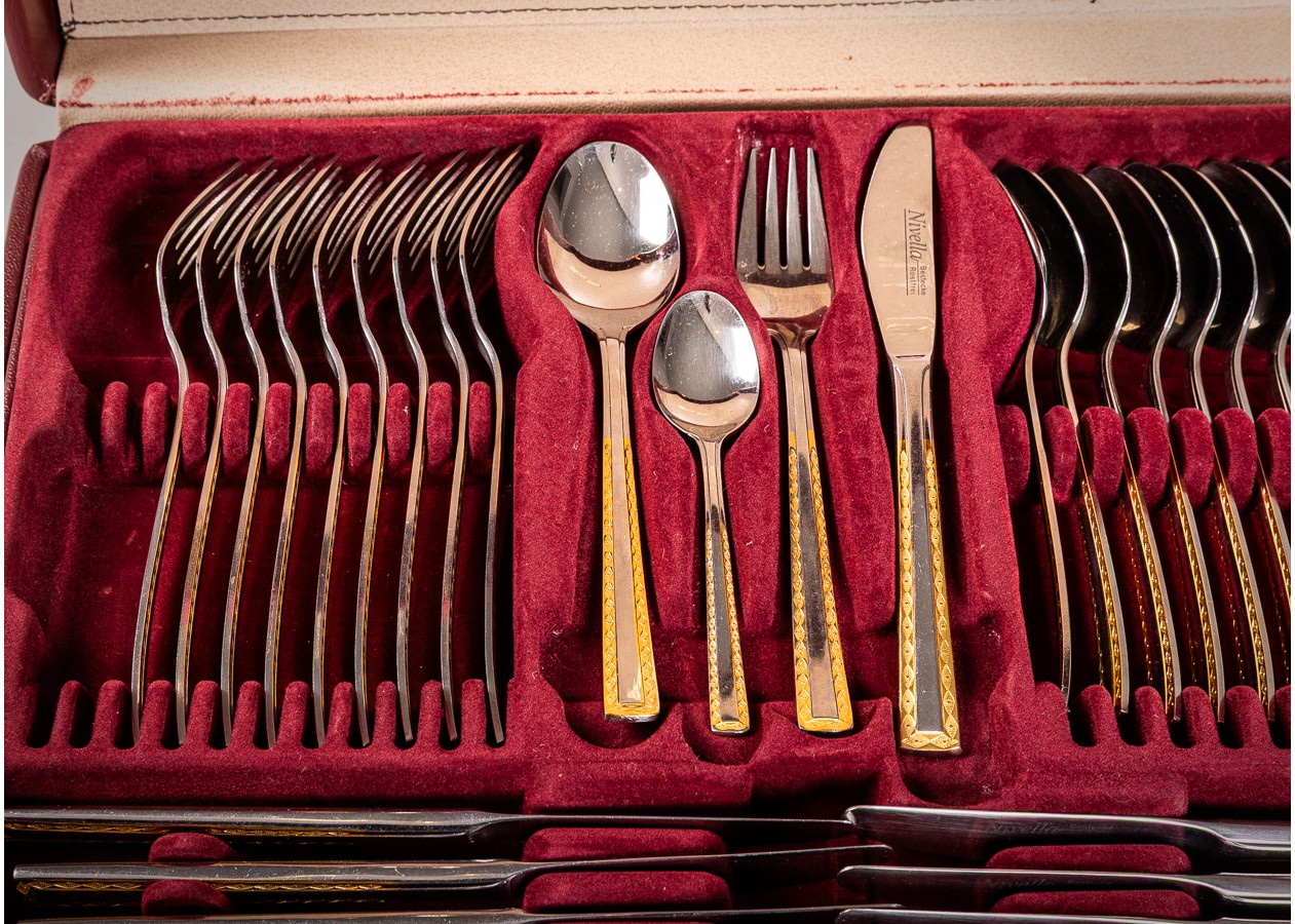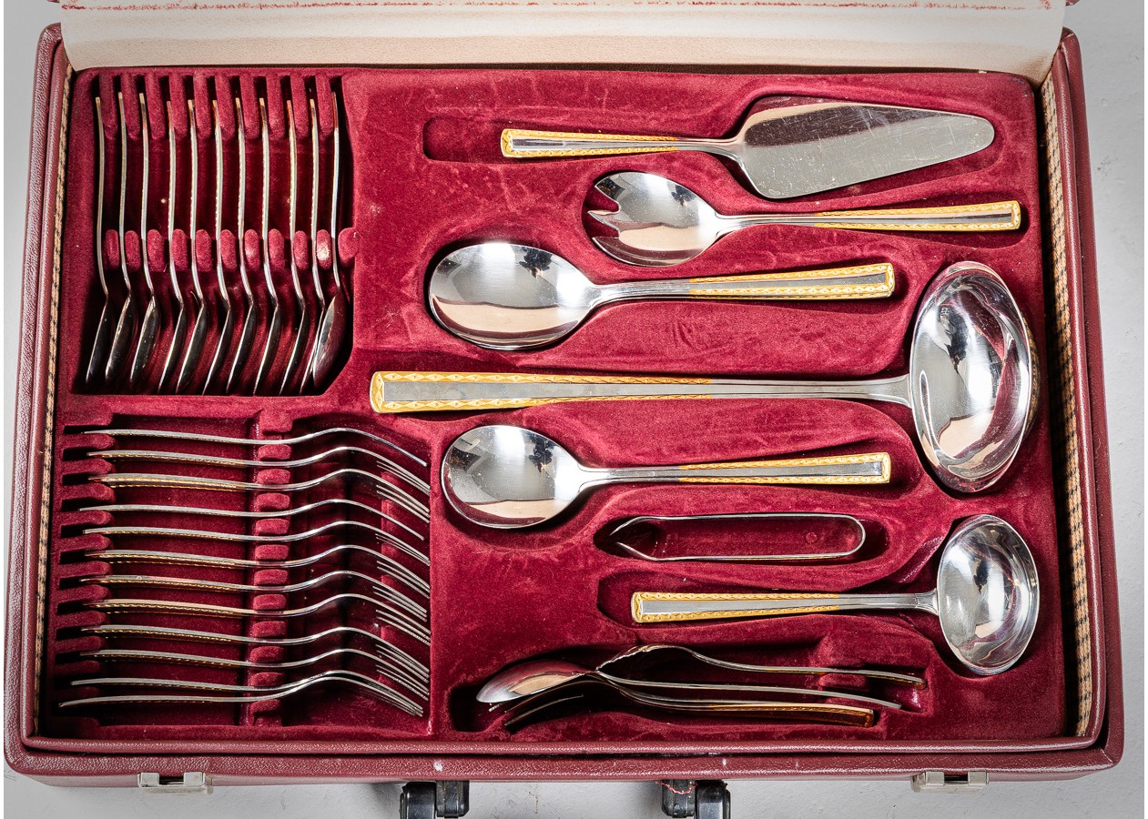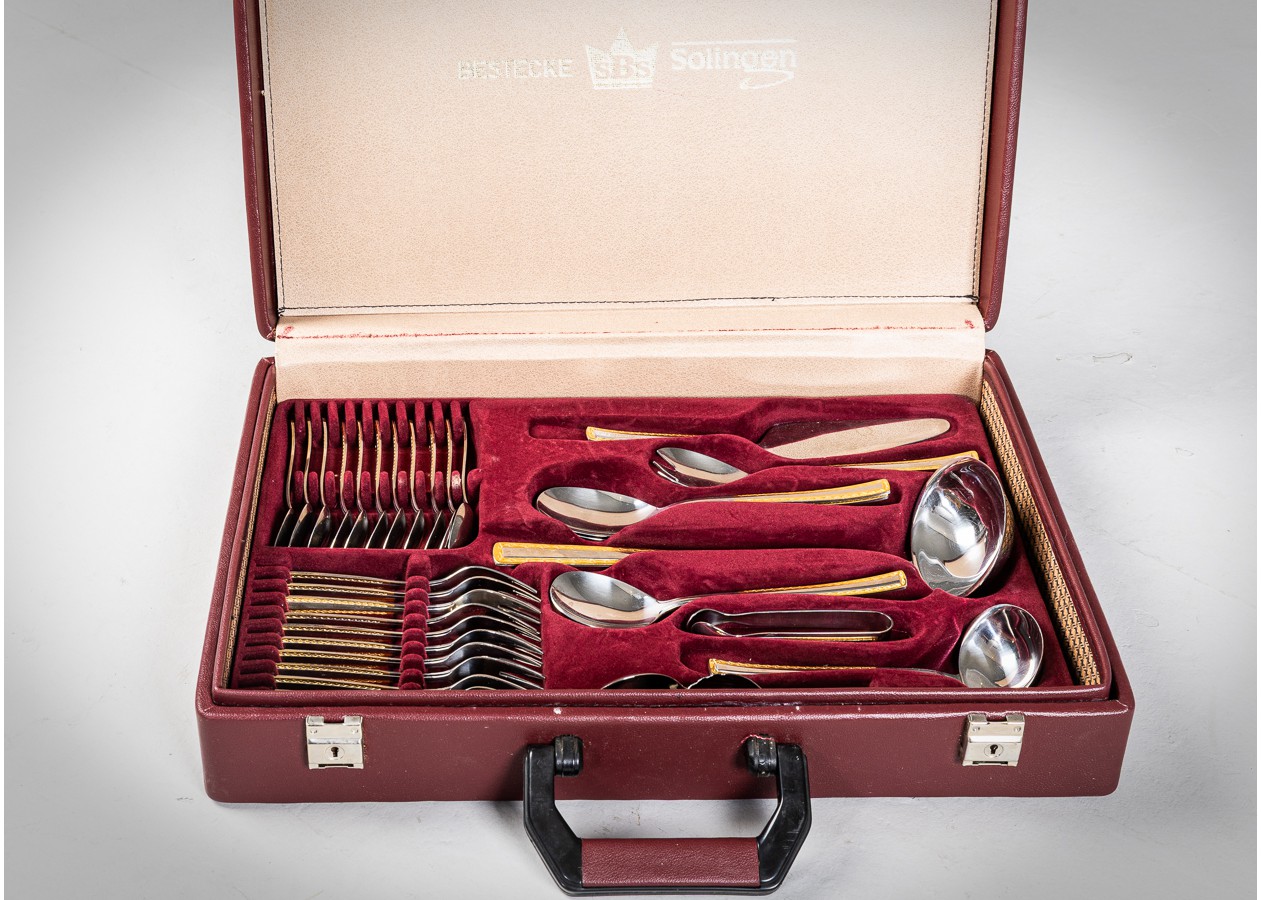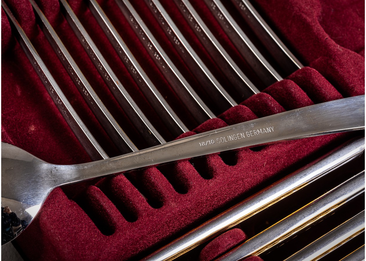 Stilingas Solingeno meistrystę atspindintis stalo įrankių rinkinys, išsiskiriantis tvarkingu išdėstymu ir elegantišku dizainu. Blizgus nerūdijantis plienas bei dekoratyviniai aukso spalvos elementai rankenose sukuria subtilų prabangos įspūdį. Rinkinys idealiai tinka reprezentaciniam stalui ir gali tapti puikia dovana ar išskirtine detale namų valgomojo erdvėje.