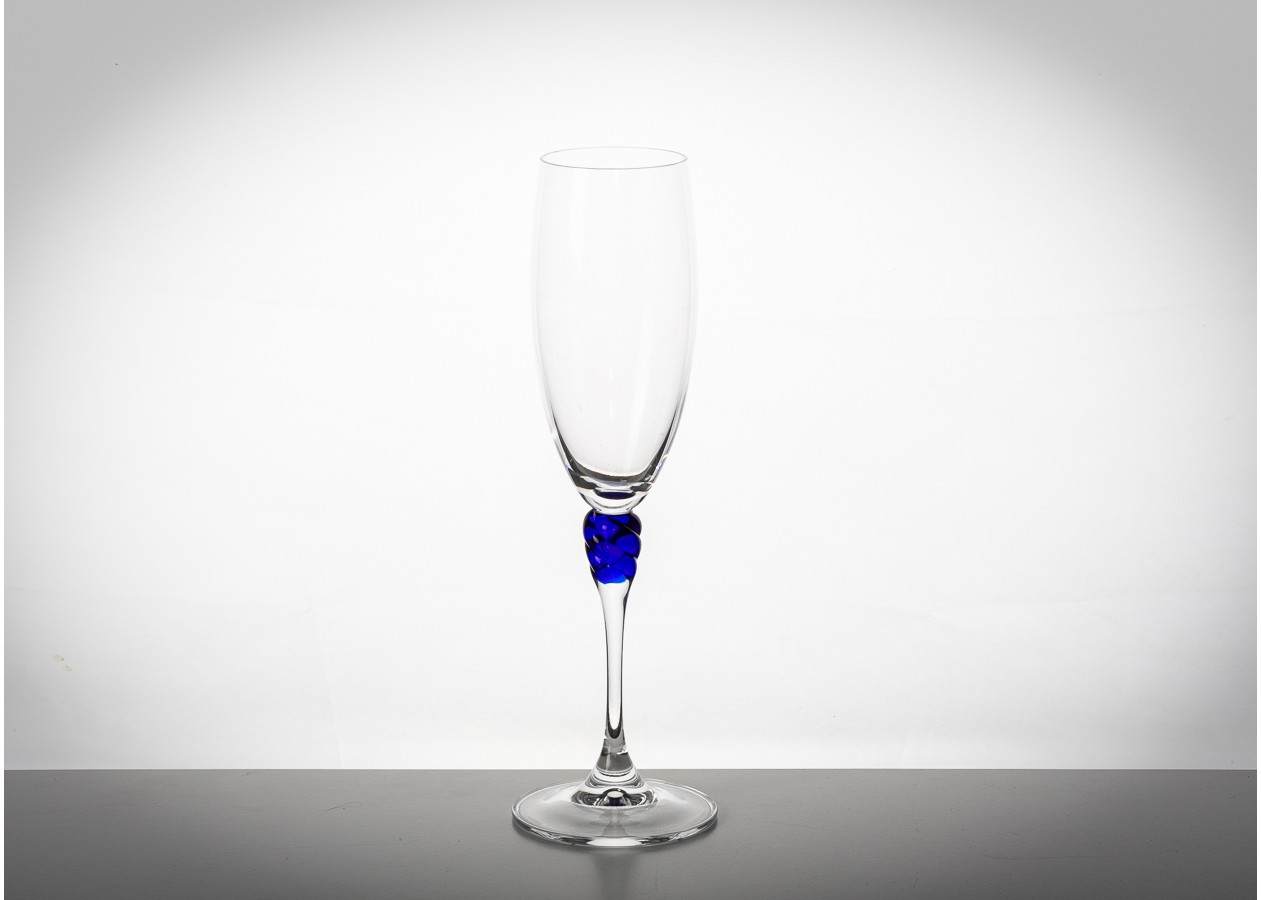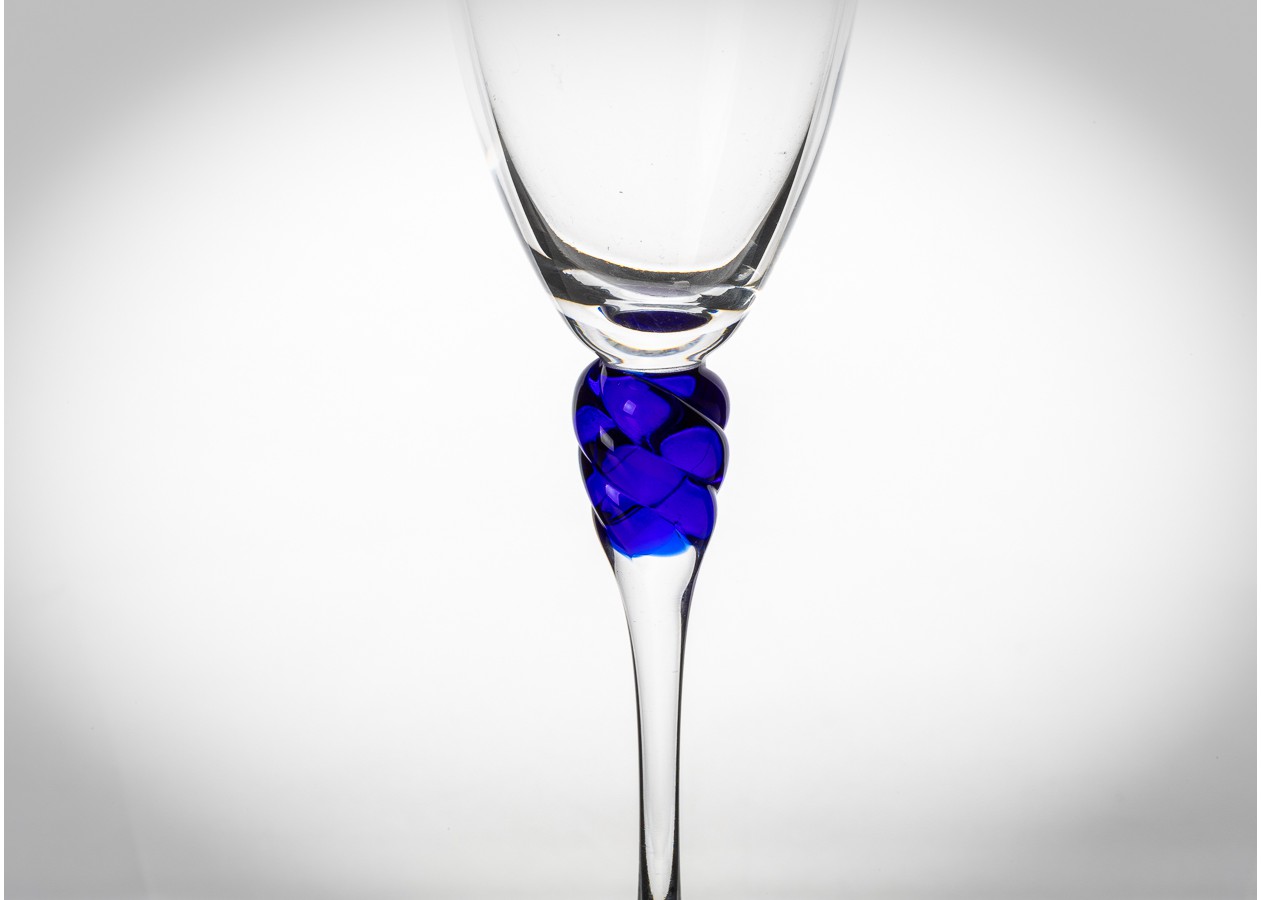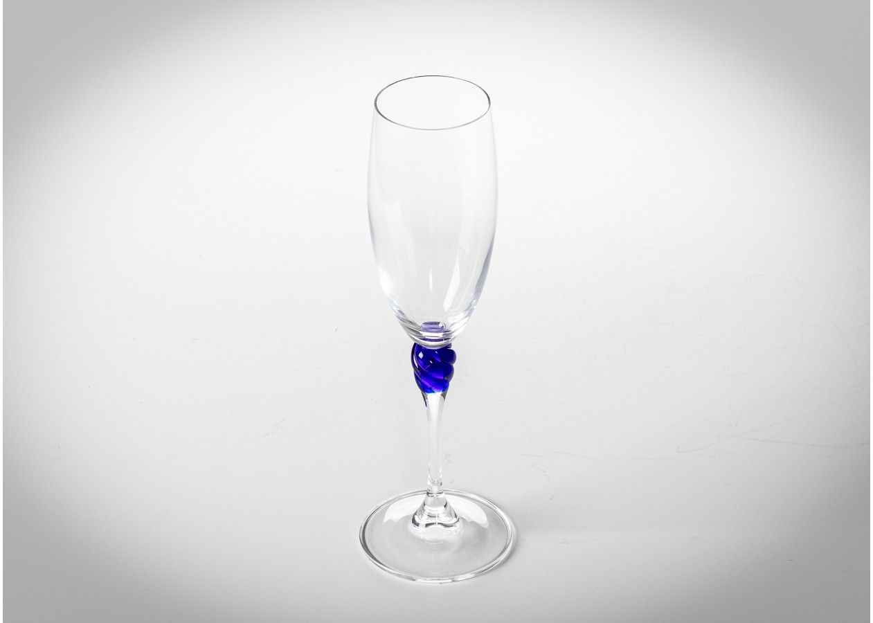 Elegantiškos šampano taurės su skaidraus stiklo taure ir išskirtiniu mėlyno stiklo akcentu stiebelyje. Dekoratyvinė spiralės forma suteikia taurėms žaismingo šviesos lūžio ir subtilaus išskirtinumo. Tai rafinuotas pasirinkimas šventiniam stalui ar stilingai interjero vitrinai.