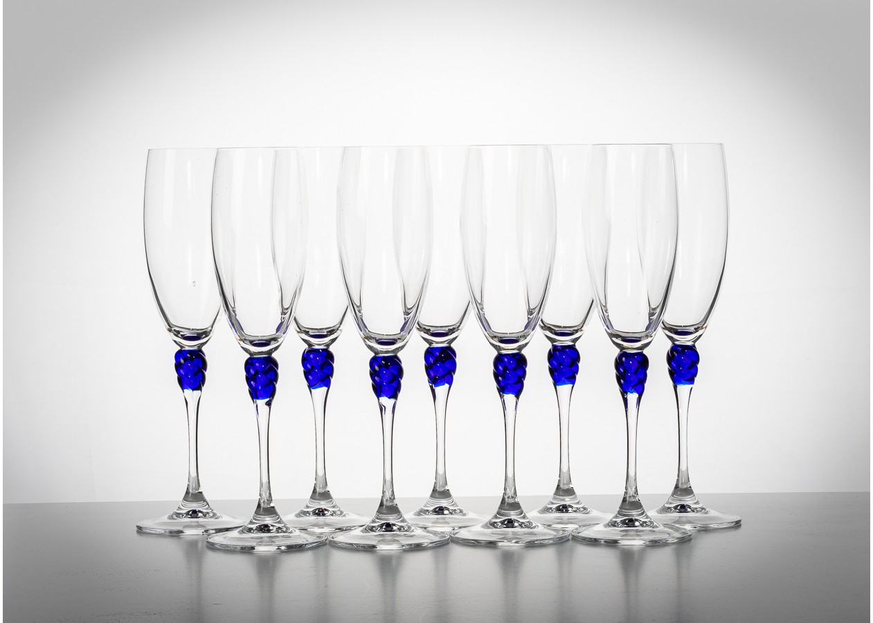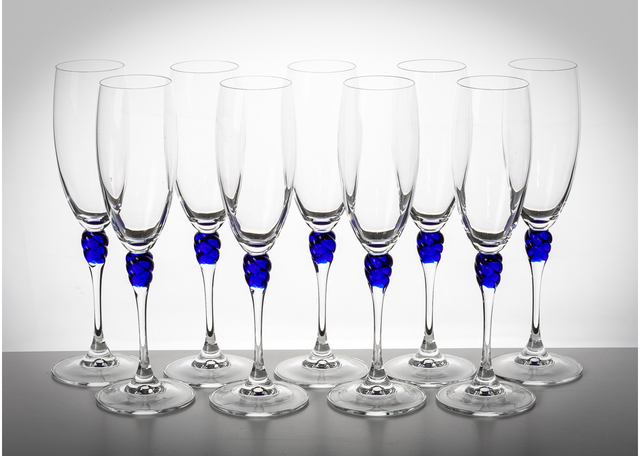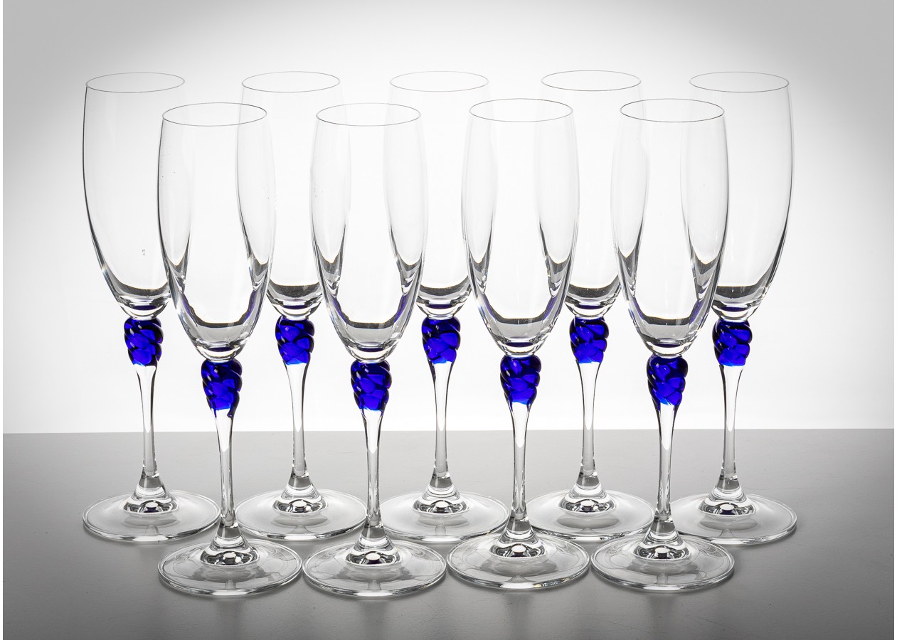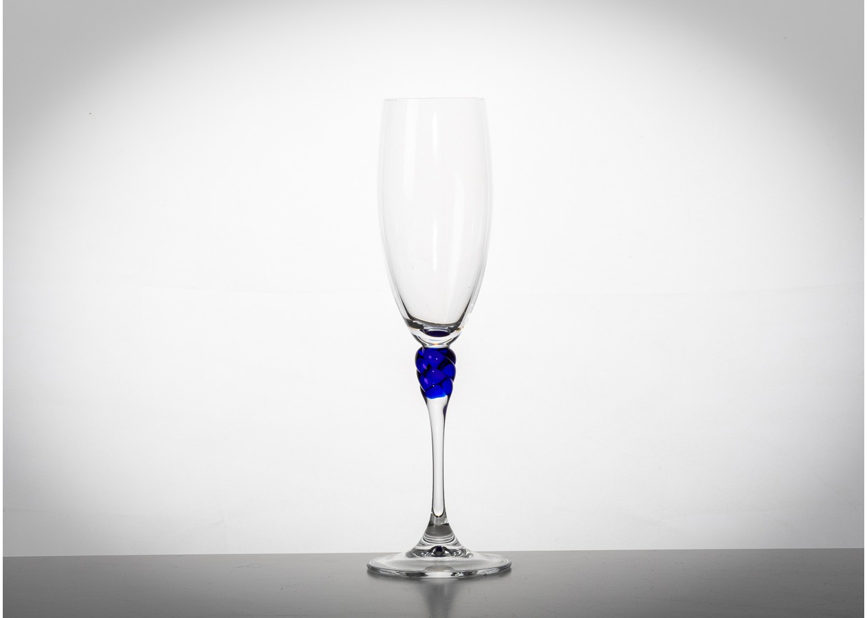 Elegantiškos šampano taurės su skaidraus stiklo taure ir išskirtiniu mėlyno stiklo akcentu stiebelyje. Dekoratyvinė spiralės forma suteikia taurėms žaismingo šviesos lūžio ir subtilaus išskirtinumo. Tai rafinuotas pasirinkimas šventiniam stalui ar stilingai interjero vitrinai.