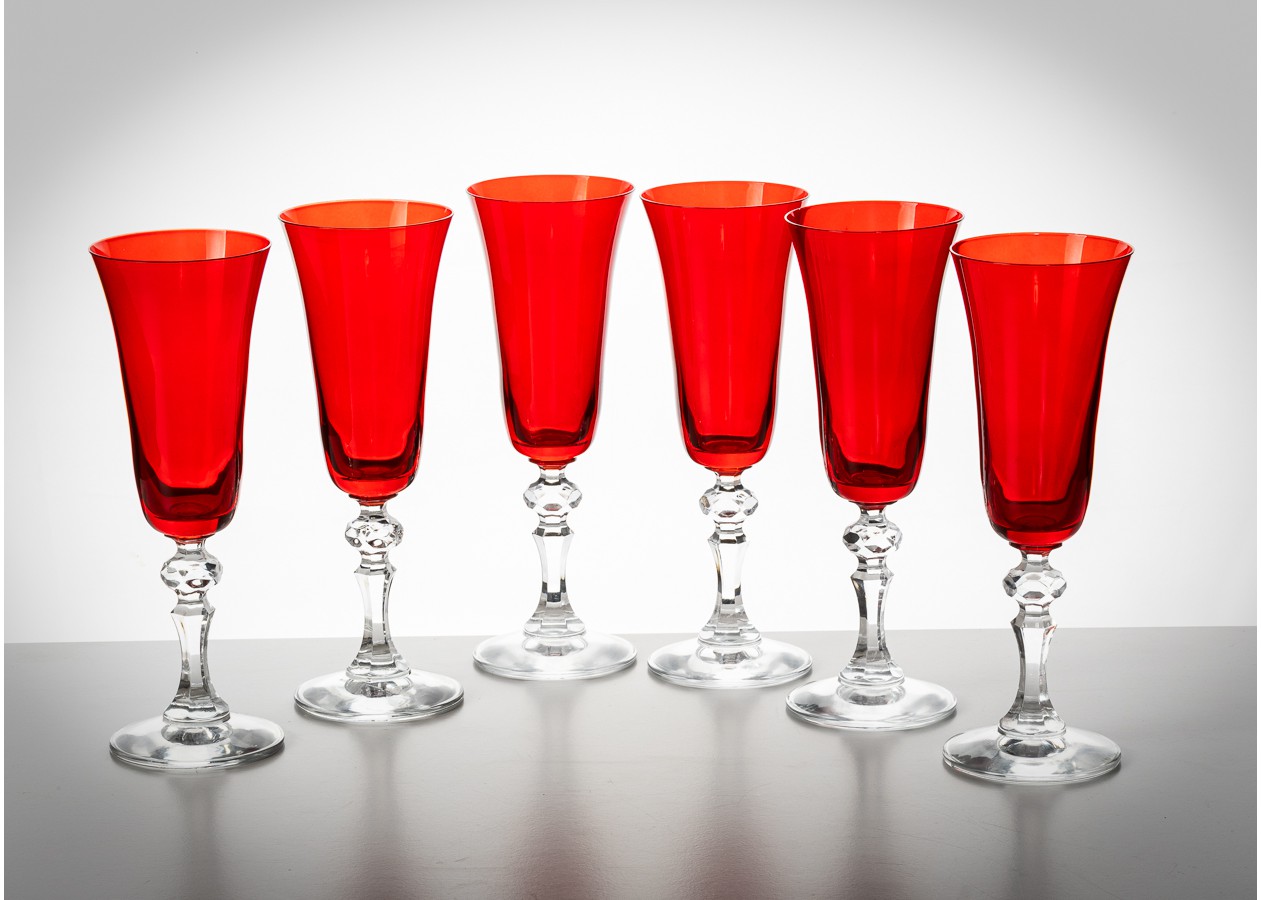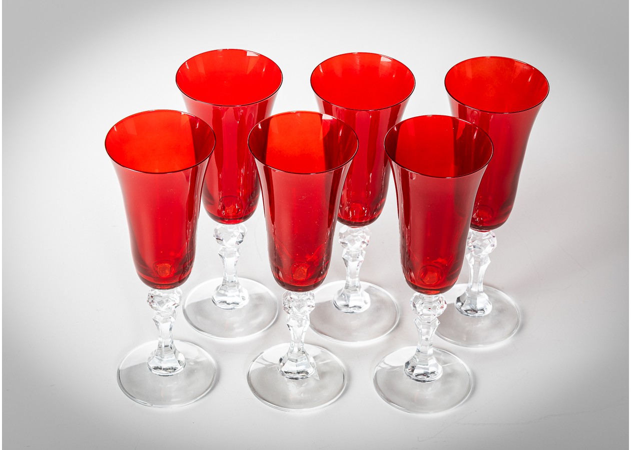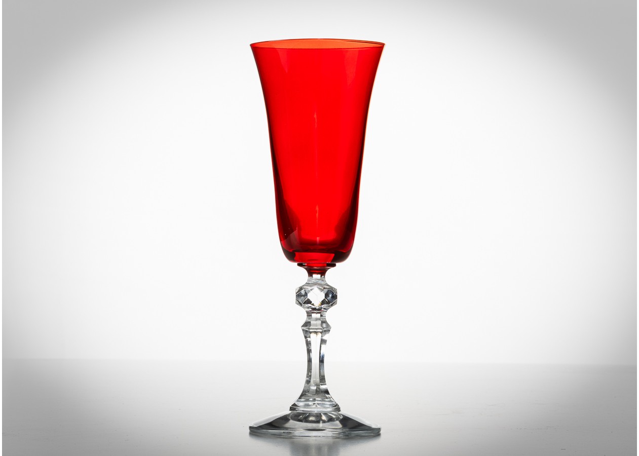 Dekoratyvinės taurės su ryškia rubino spalvos taure ir elegantiška skaidraus stiklo kojele. Briaunuotas stiebelis gražiai laužia šviesą, o aukštas siluetas suteikia formoms rafinuotumo. Tai stilingas pasirinkimas tiek šventiniam stalui, tiek kolekcijai.