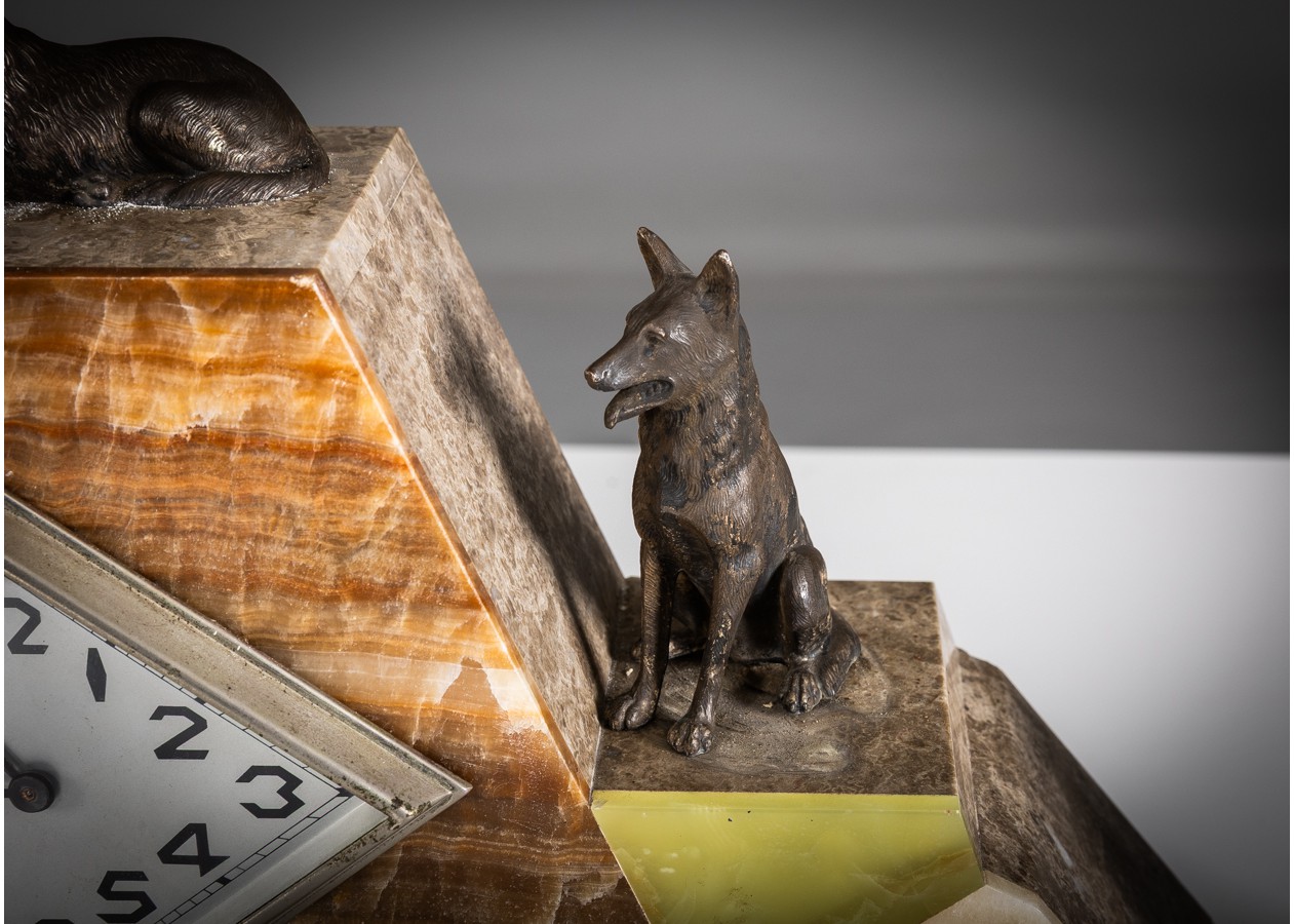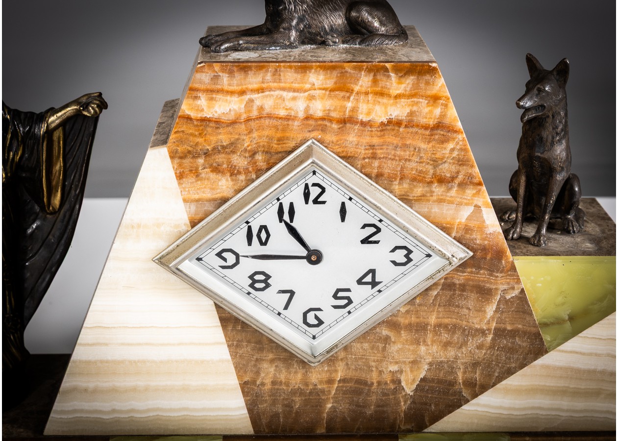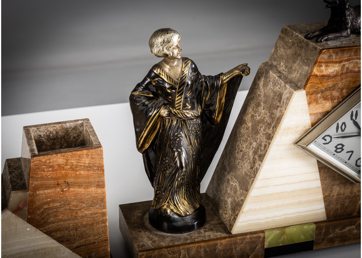 Išraiškingas Art Deco laikrodžio komplektas su dviem šoniniais elementais, dekoruotas bronzinėmis šuns figūromis ir elegantiška stilizuota moters skulptūra. Geometrinė kompozicija iš kontrastingų onikso plokštumų kuria solidų, architektūrišką siluetą. Charakteringas XX a. 3–4 deš. prancūziškas dizainas – reprezentacinis, kolekcinis ir interjere stiprų akcentą formuojantis objektas.