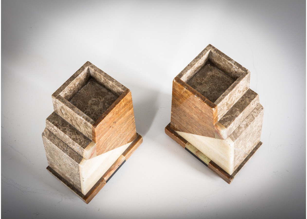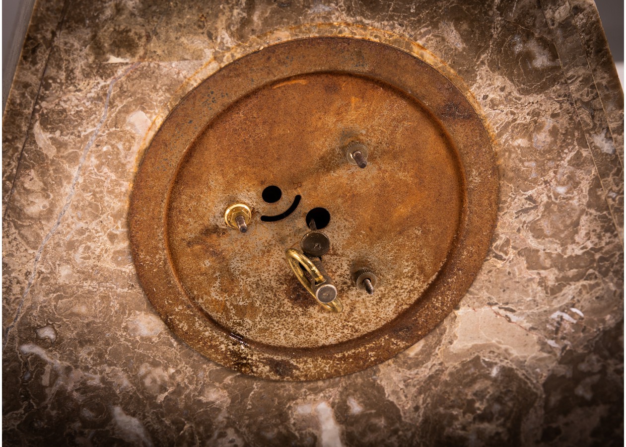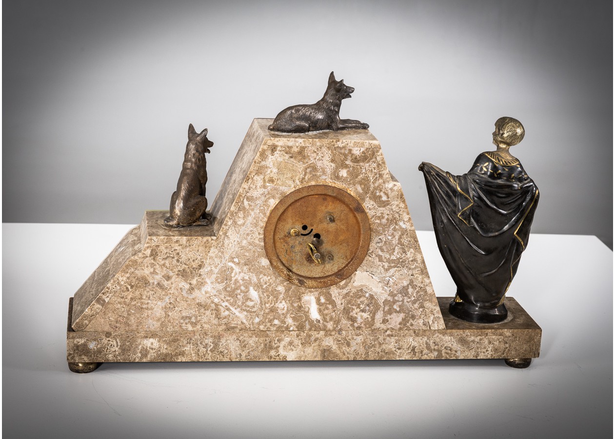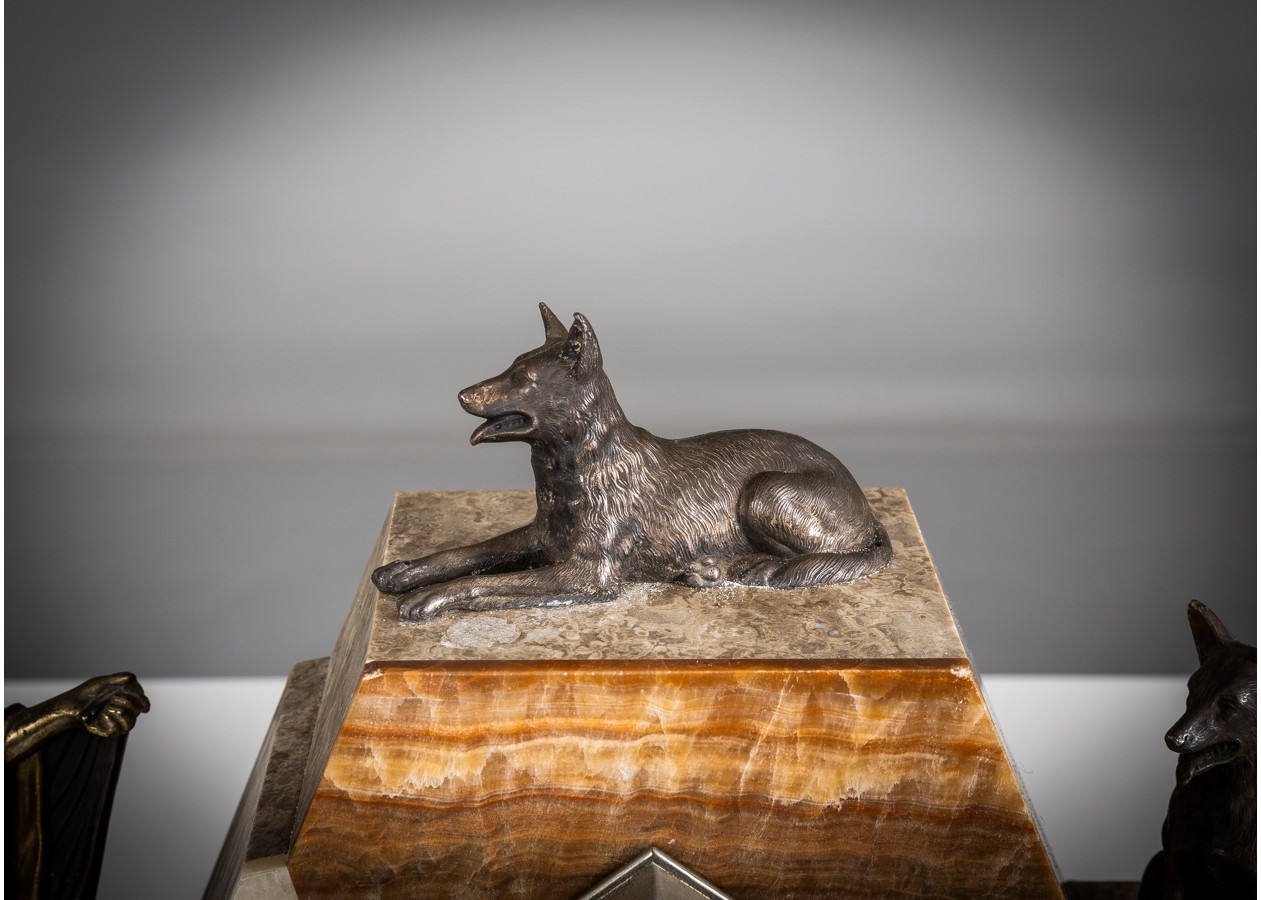 Išraiškingas Art Deco laikrodžio komplektas su dviem šoniniais elementais, dekoruotas bronzinėmis šuns figūromis ir elegantiška stilizuota moters skulptūra. Geometrinė kompozicija iš kontrastingų onikso plokštumų kuria solidų, architektūrišką siluetą. Charakteringas XX a. 3–4 deš. prancūziškas dizainas – reprezentacinis, kolekcinis ir interjere stiprų akcentą formuojantis objektas.
