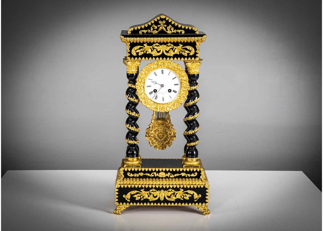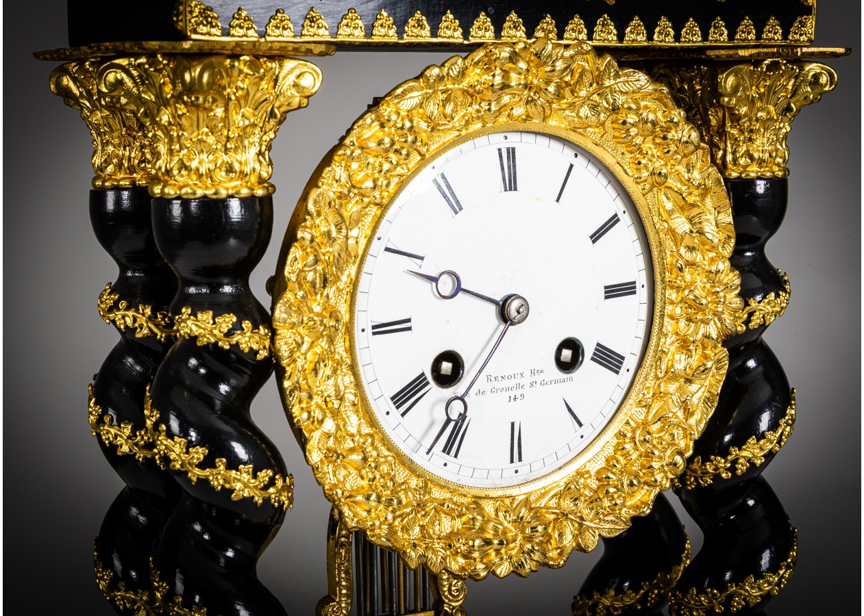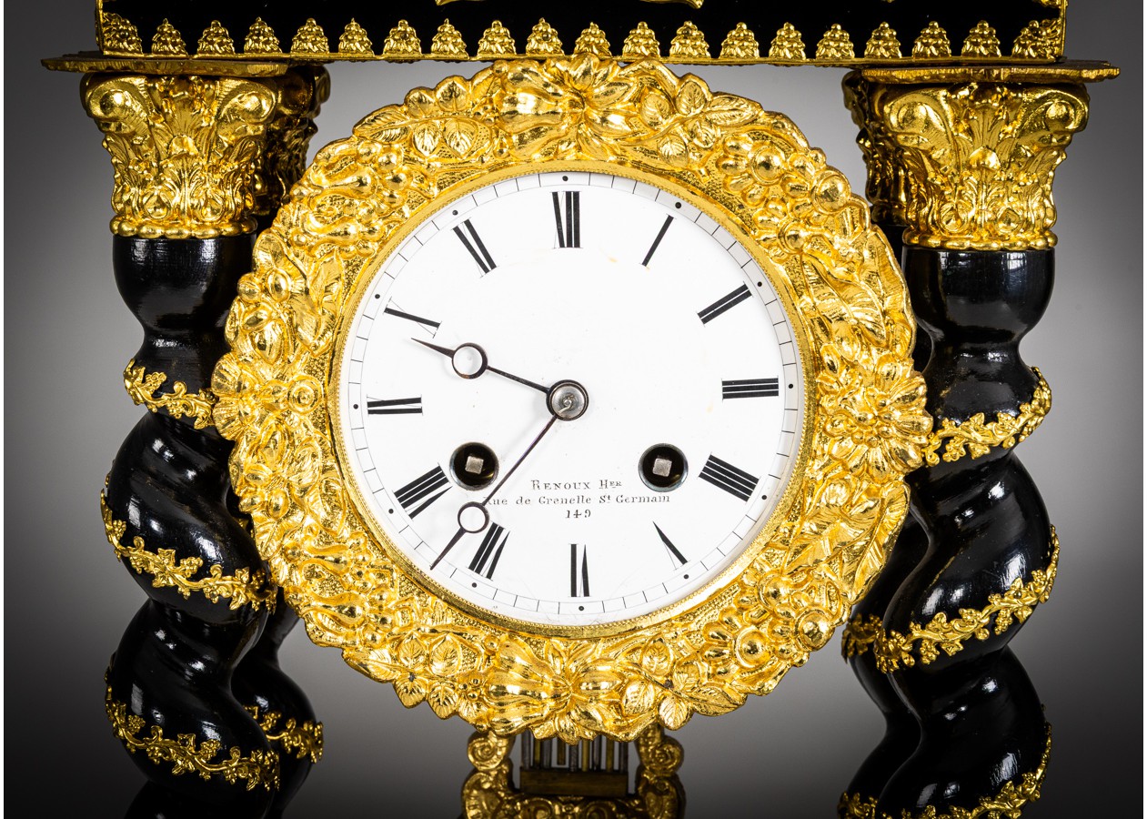 Portikinis stalo laikrodis su juodintu (ebonizuotu) korpusu ir gausiomis paauksuoto bronzos aplikacijomis, vingiuotomis kolonomis bei matoma švytuokle. Ciferblate – „Renoux“, Rue de Grenelle, St-Germain 149 – meistro parašas. Ryškus, autentiškas akcentas, keliantis kolekcinę vertę ir prabangą interjere.