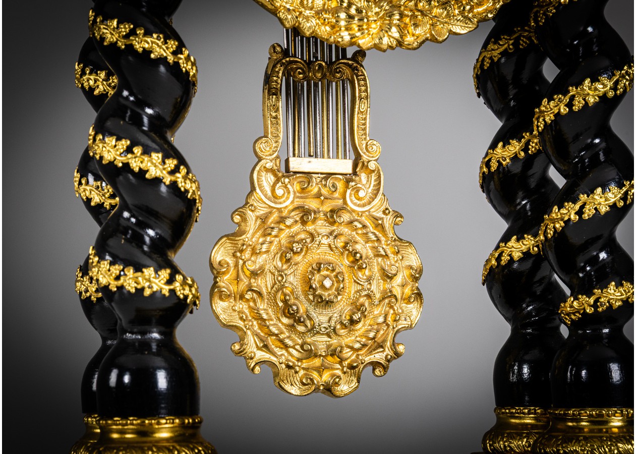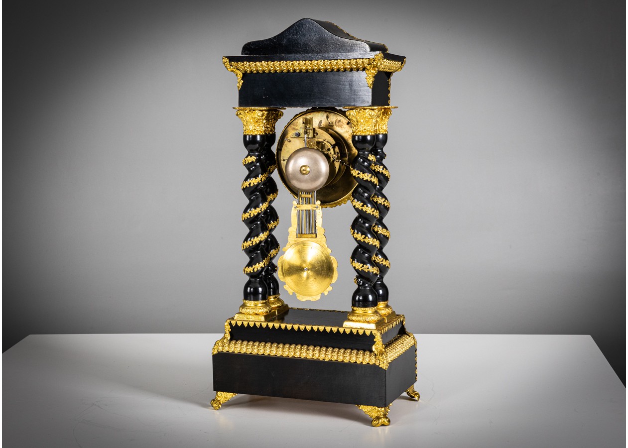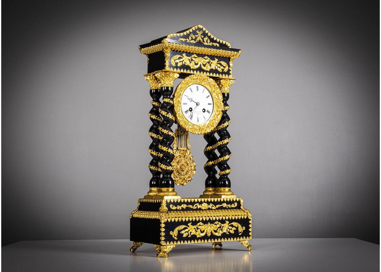 Portikinis stalo laikrodis su juodintu (ebonizuotu) korpusu ir gausiomis paauksuoto bronzos aplikacijomis, vingiuotomis kolonomis bei matoma švytuokle. Ciferblate – „Renoux“, Rue de Grenelle, St-Germain 149 – meistro parašas. Ryškus, autentiškas akcentas, keliantis kolekcinę vertę ir prabangą interjere.